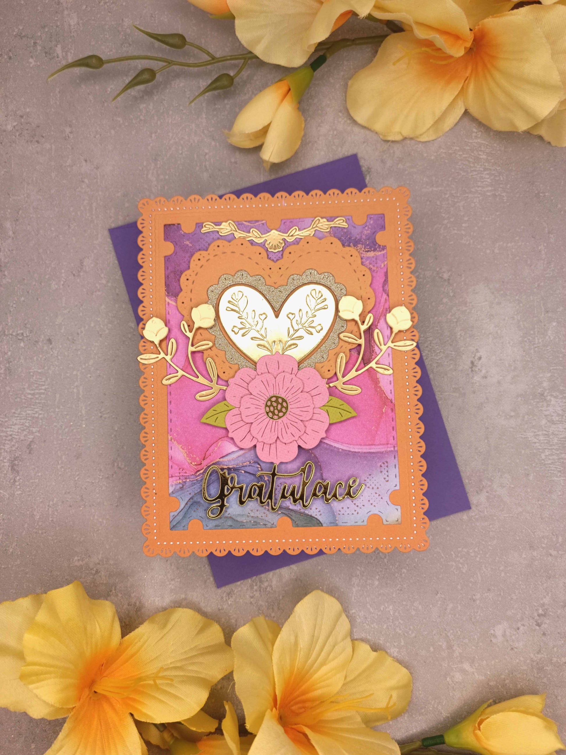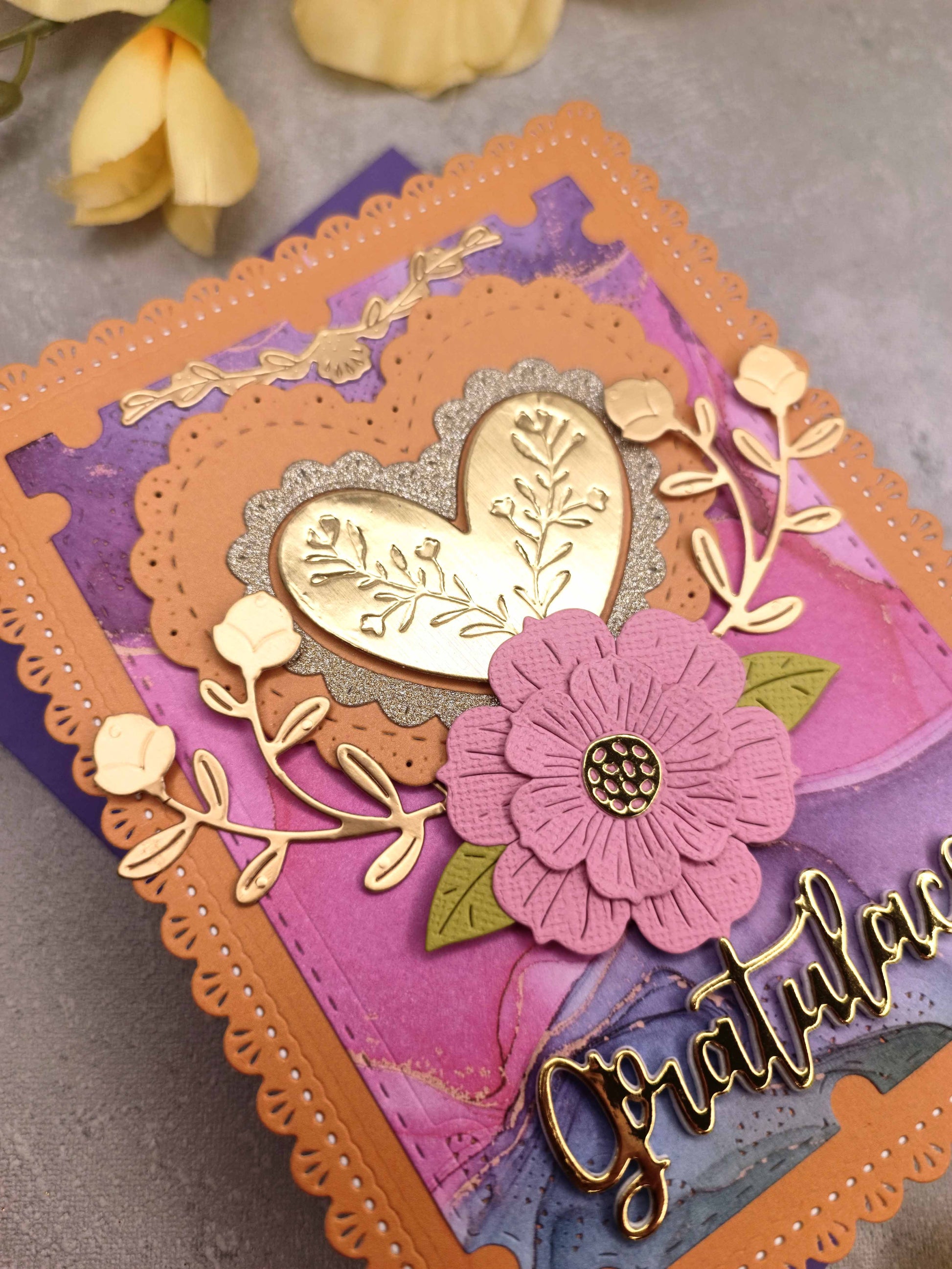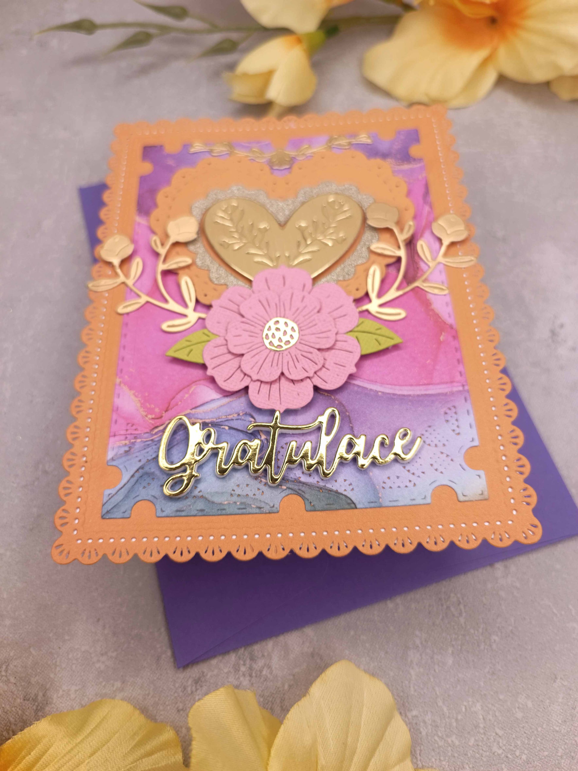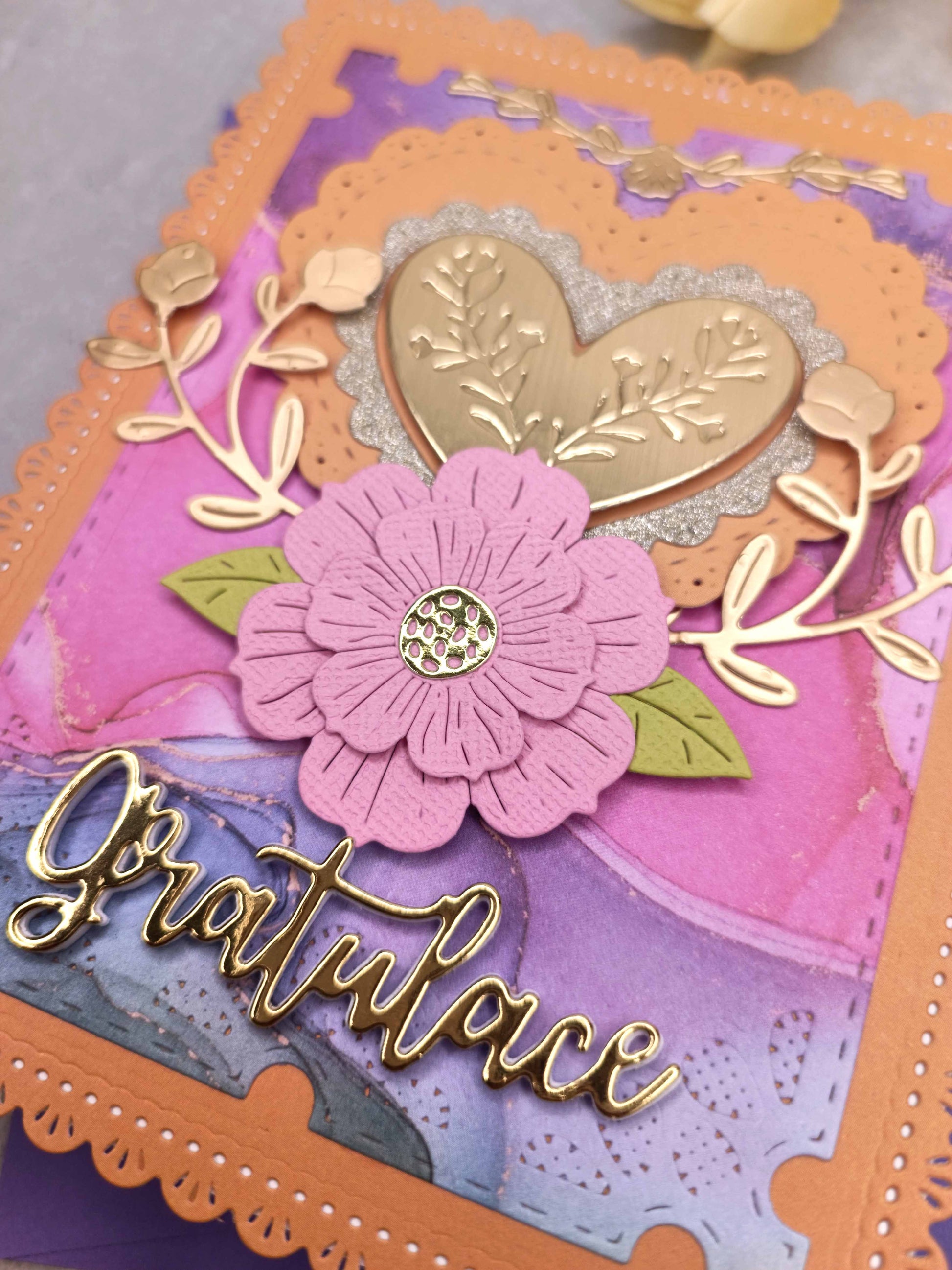 - Přáníčko je zdobeno zlatými elementy a je laděno do fialovo-růžovo-karamelové barvy
