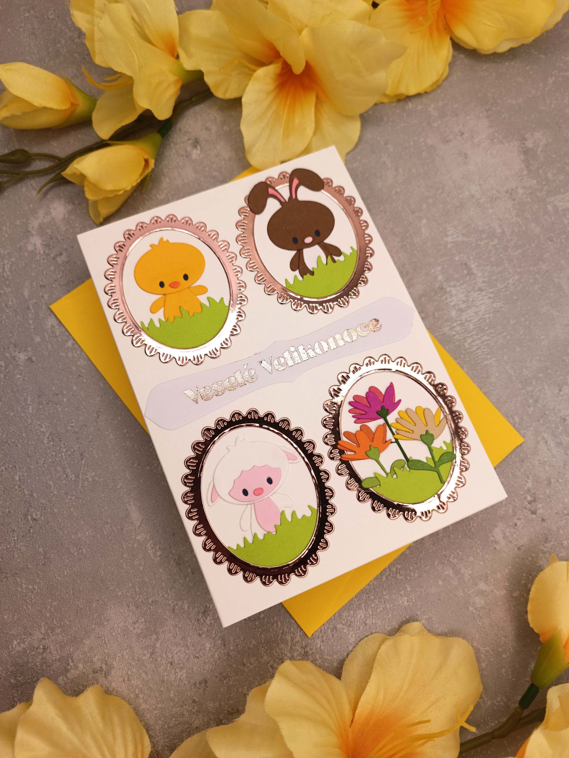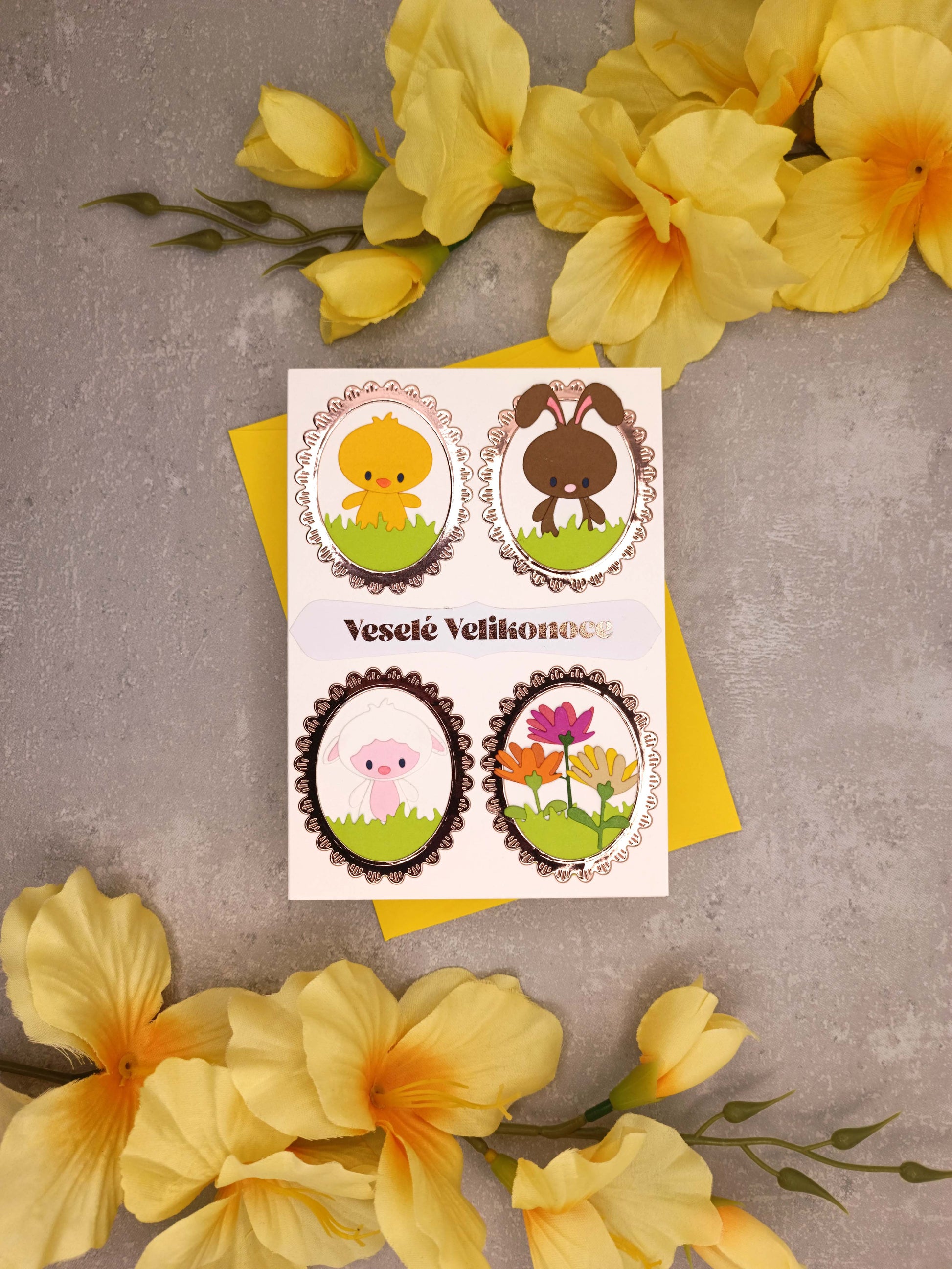 - Přání je zdobeno růžovo-zlatými rámečky okolo zvířátek a růžovo-zlatým nápisem