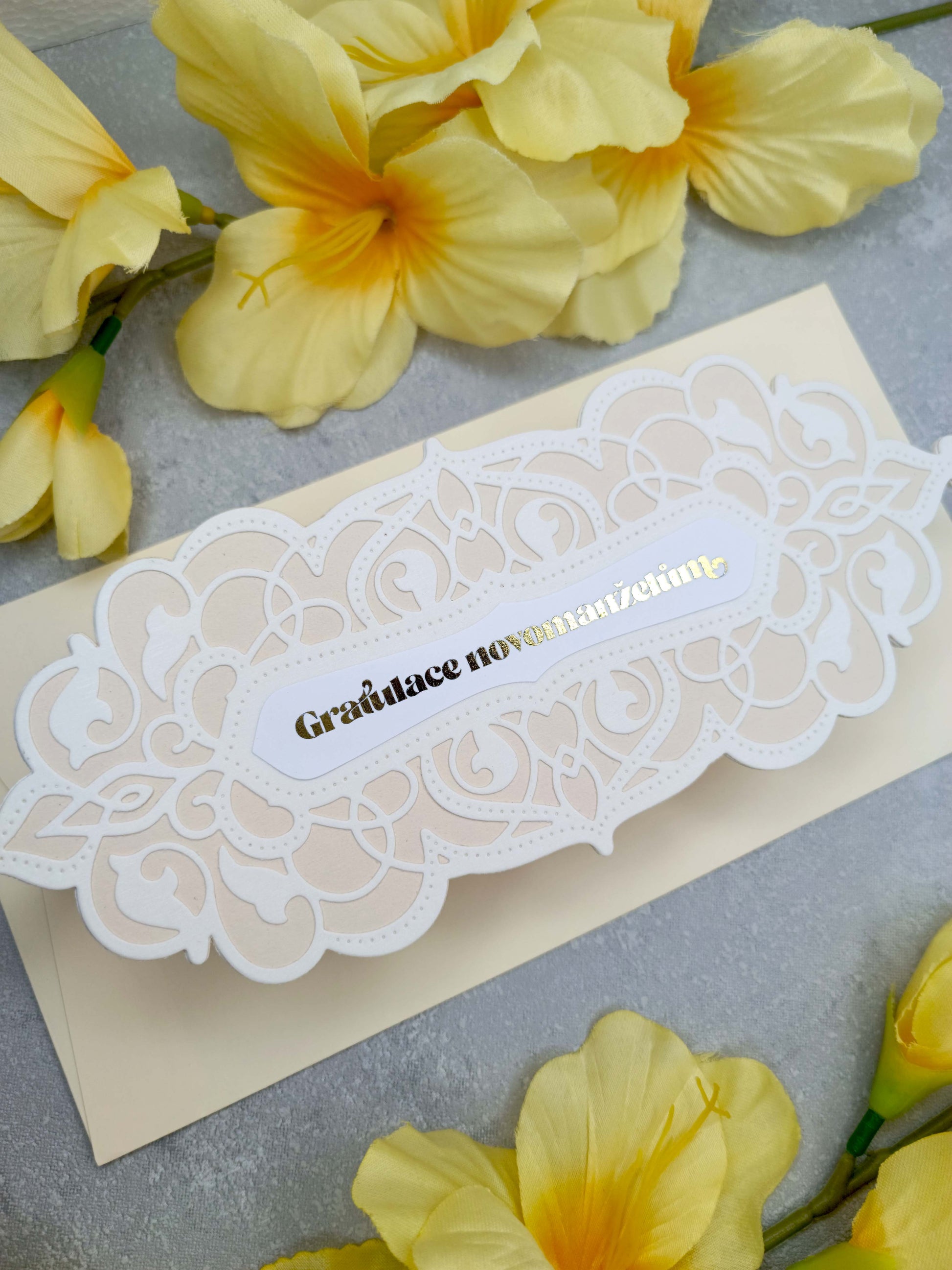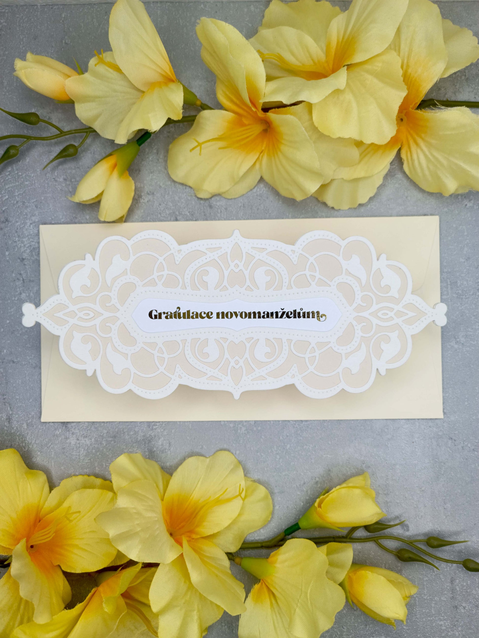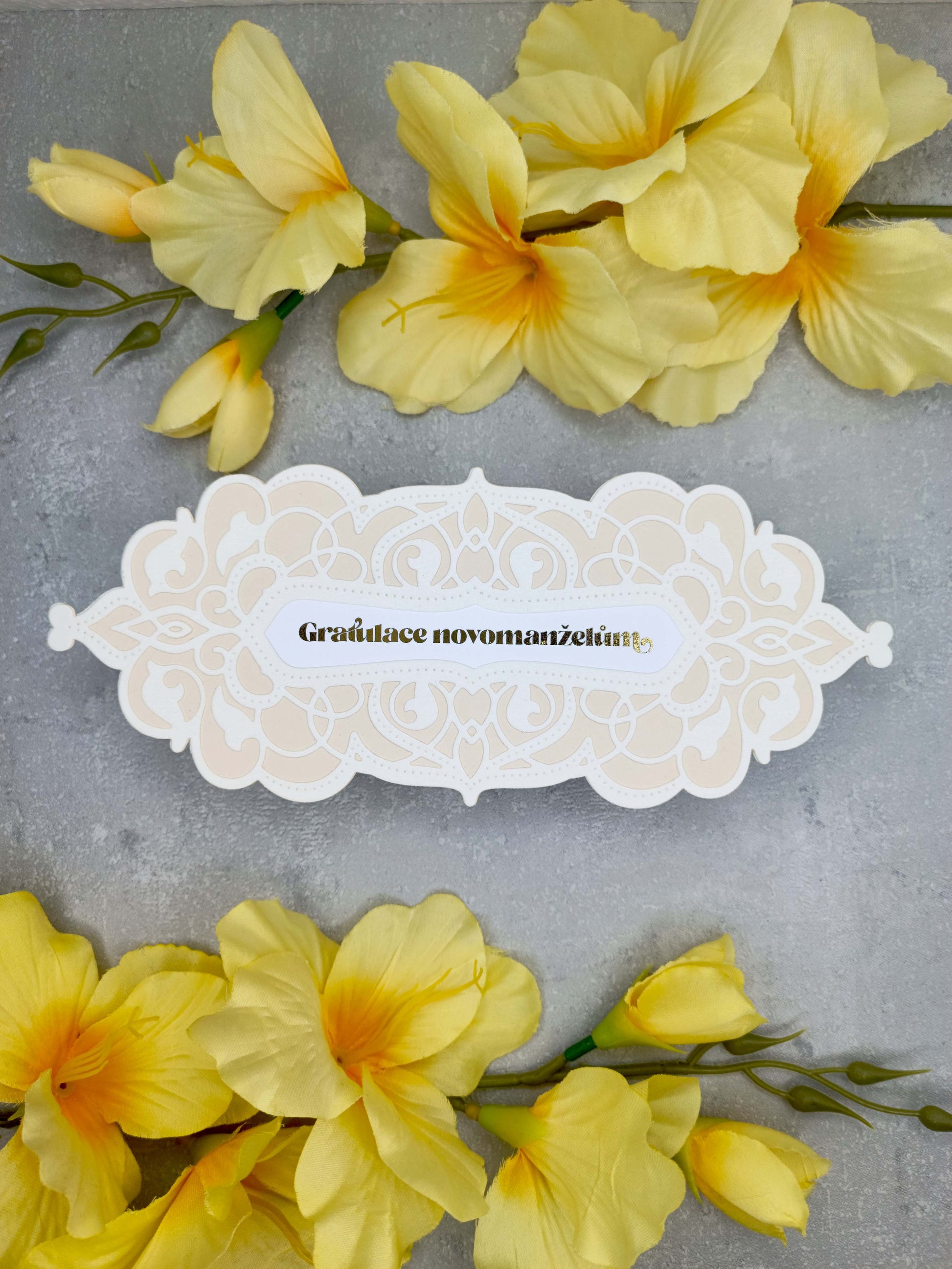 - Přání je zdobeno bílým, lehce třpytivým papírem a zlatým nápisem