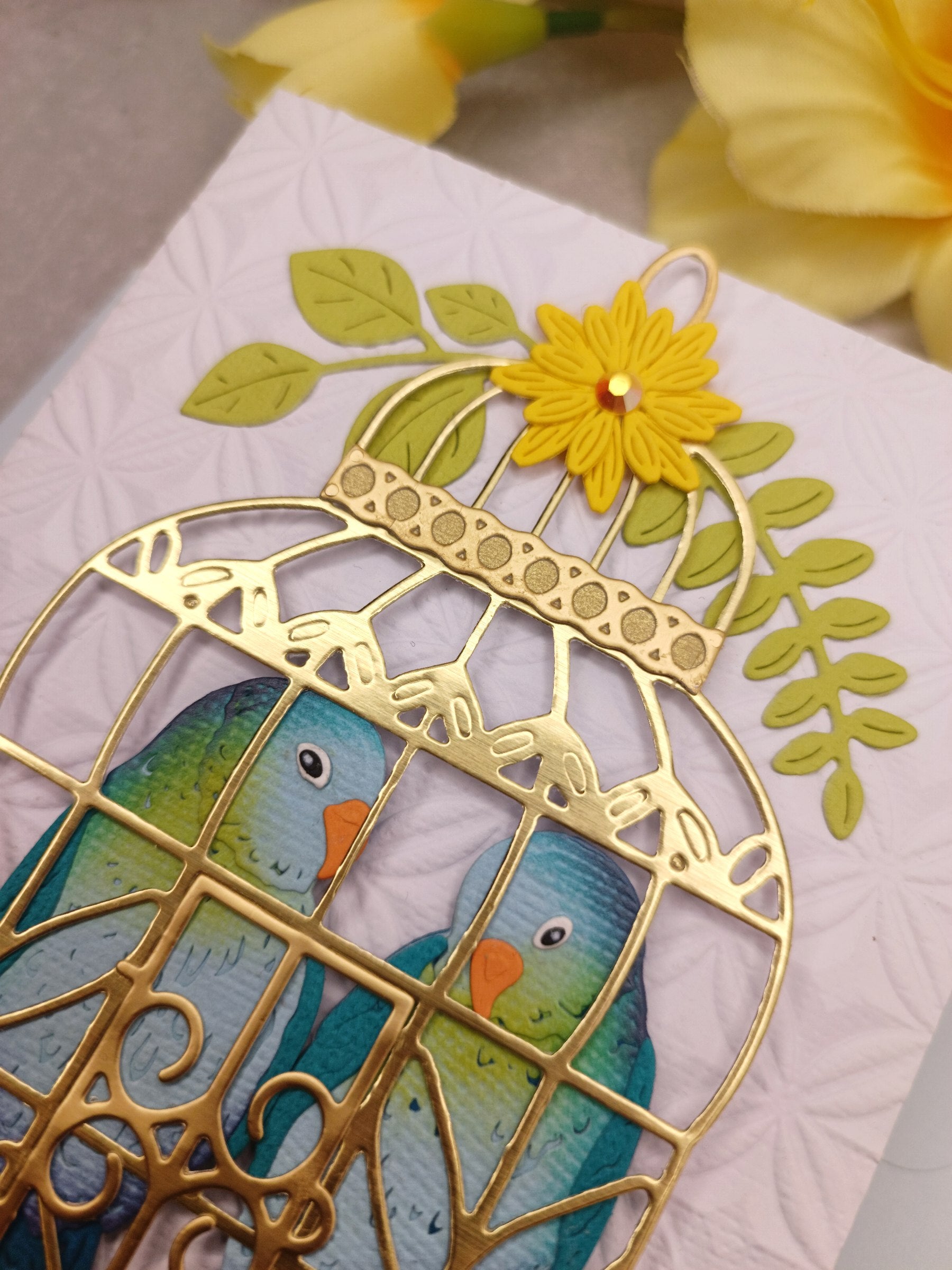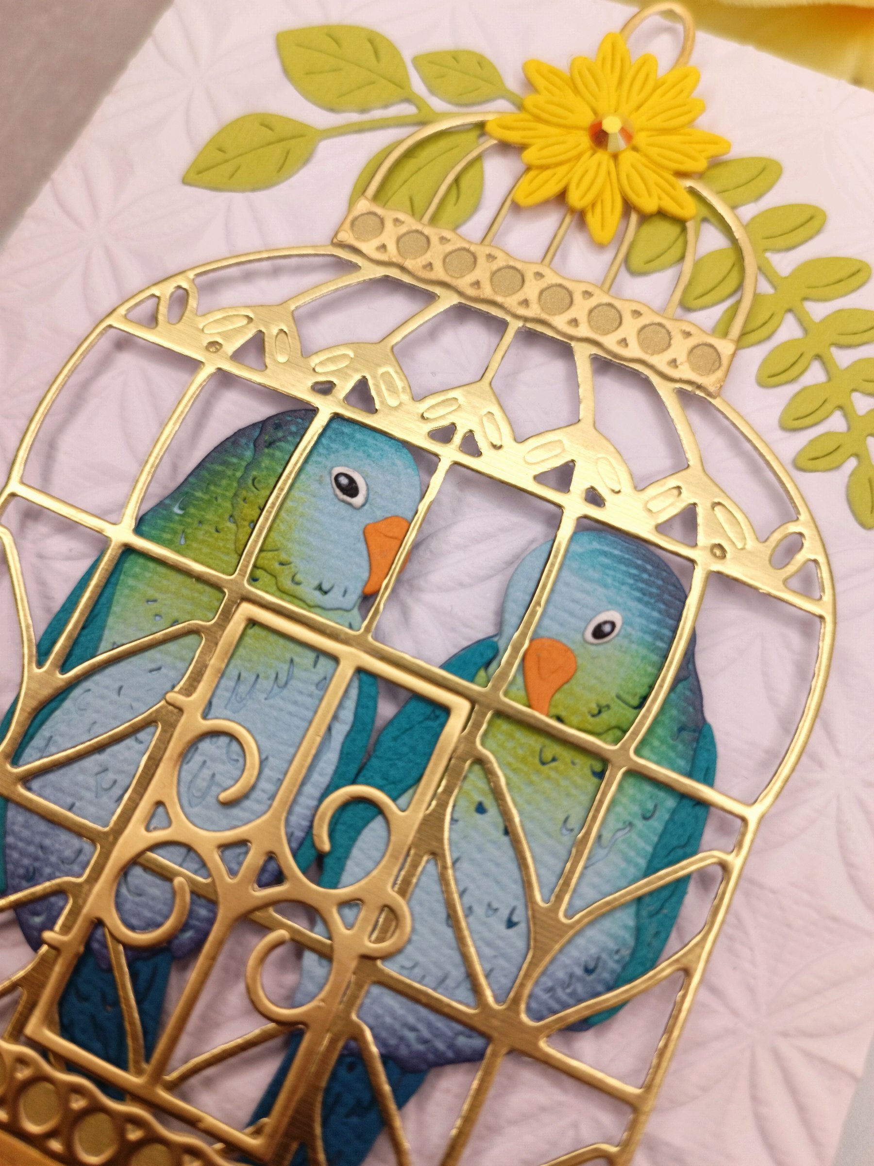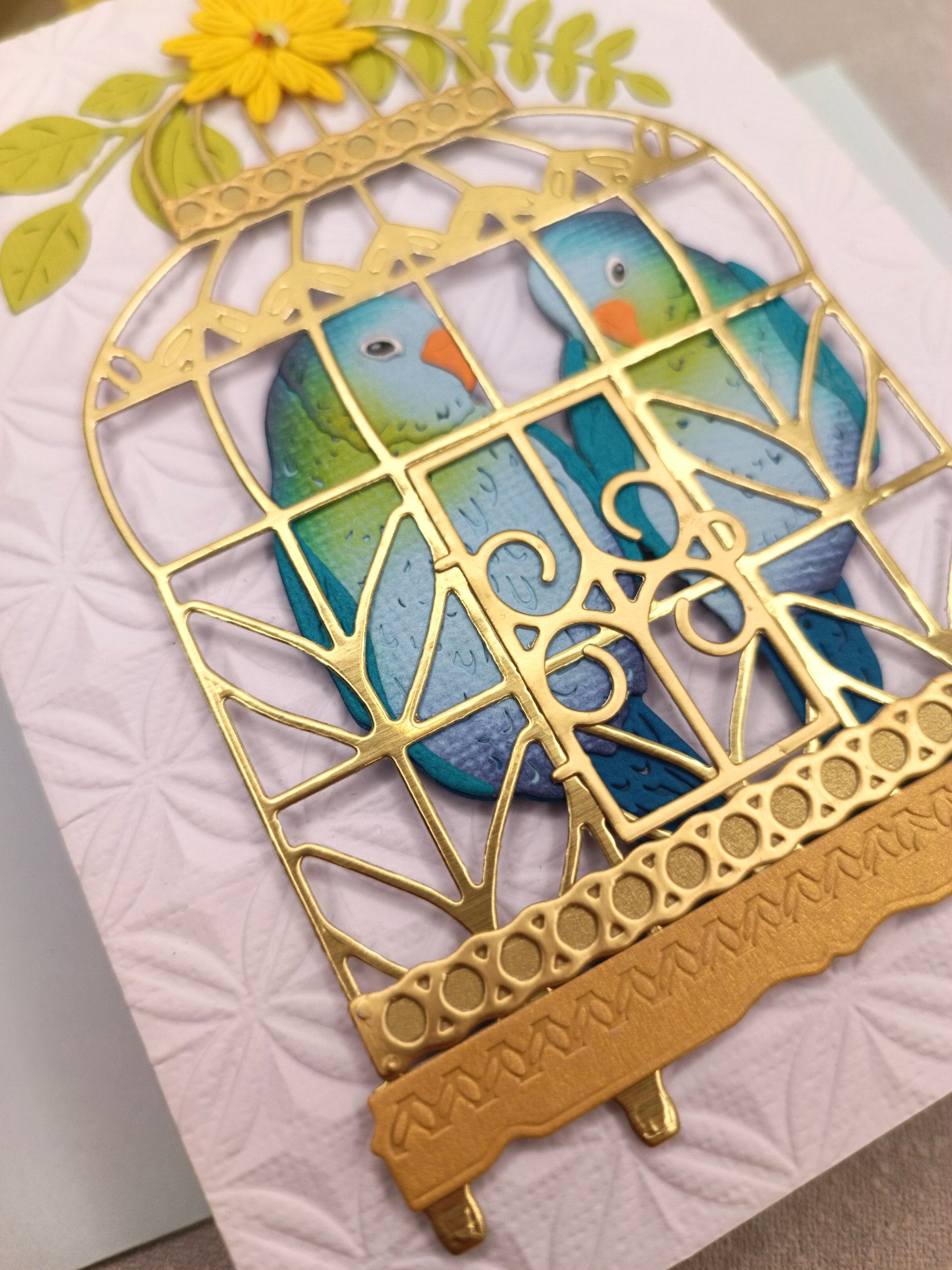 - Bílé pozadí je zdobeno geometrickým reliéfem, přání zdobí modré andulky ve zlaté klícce