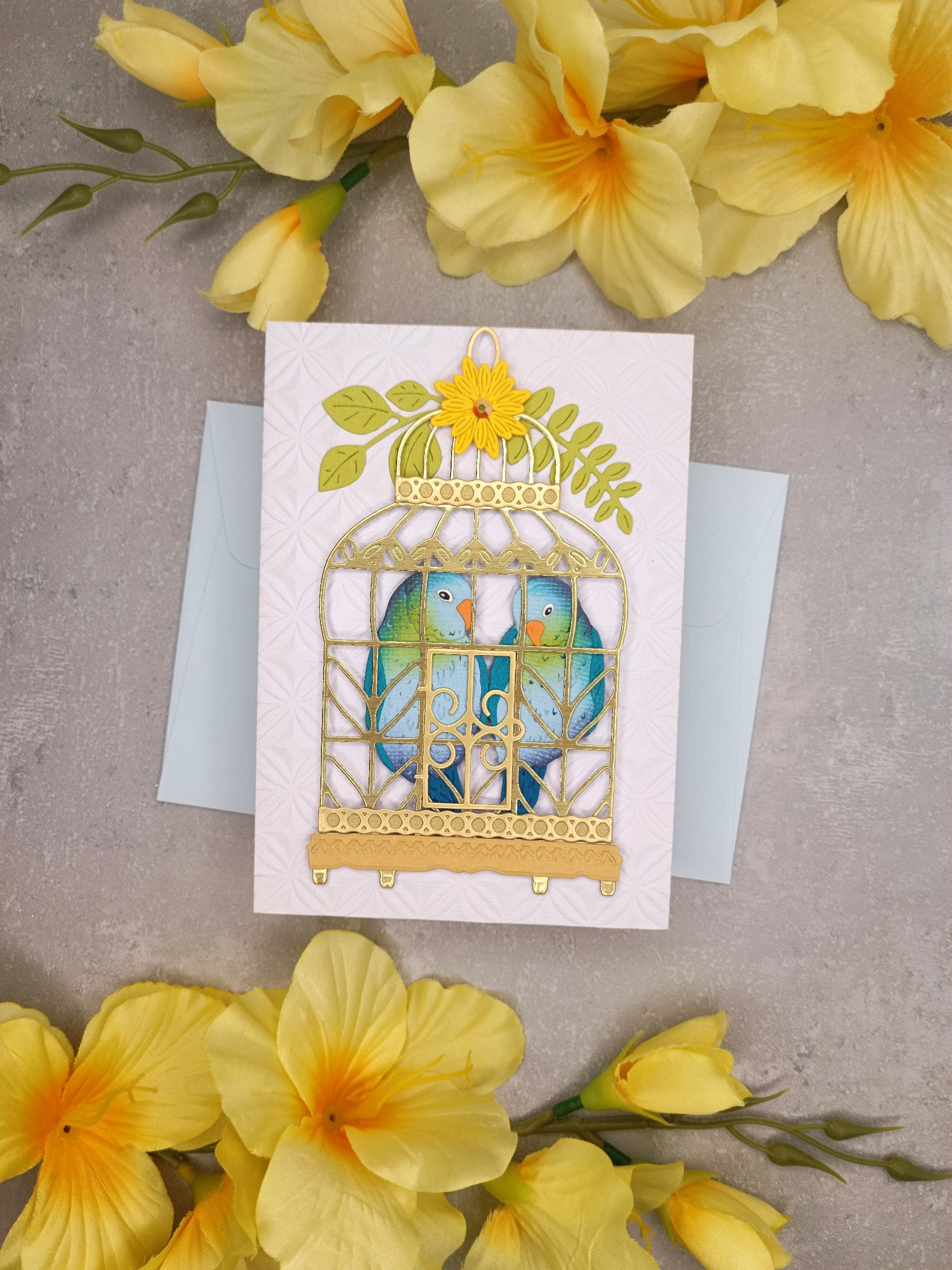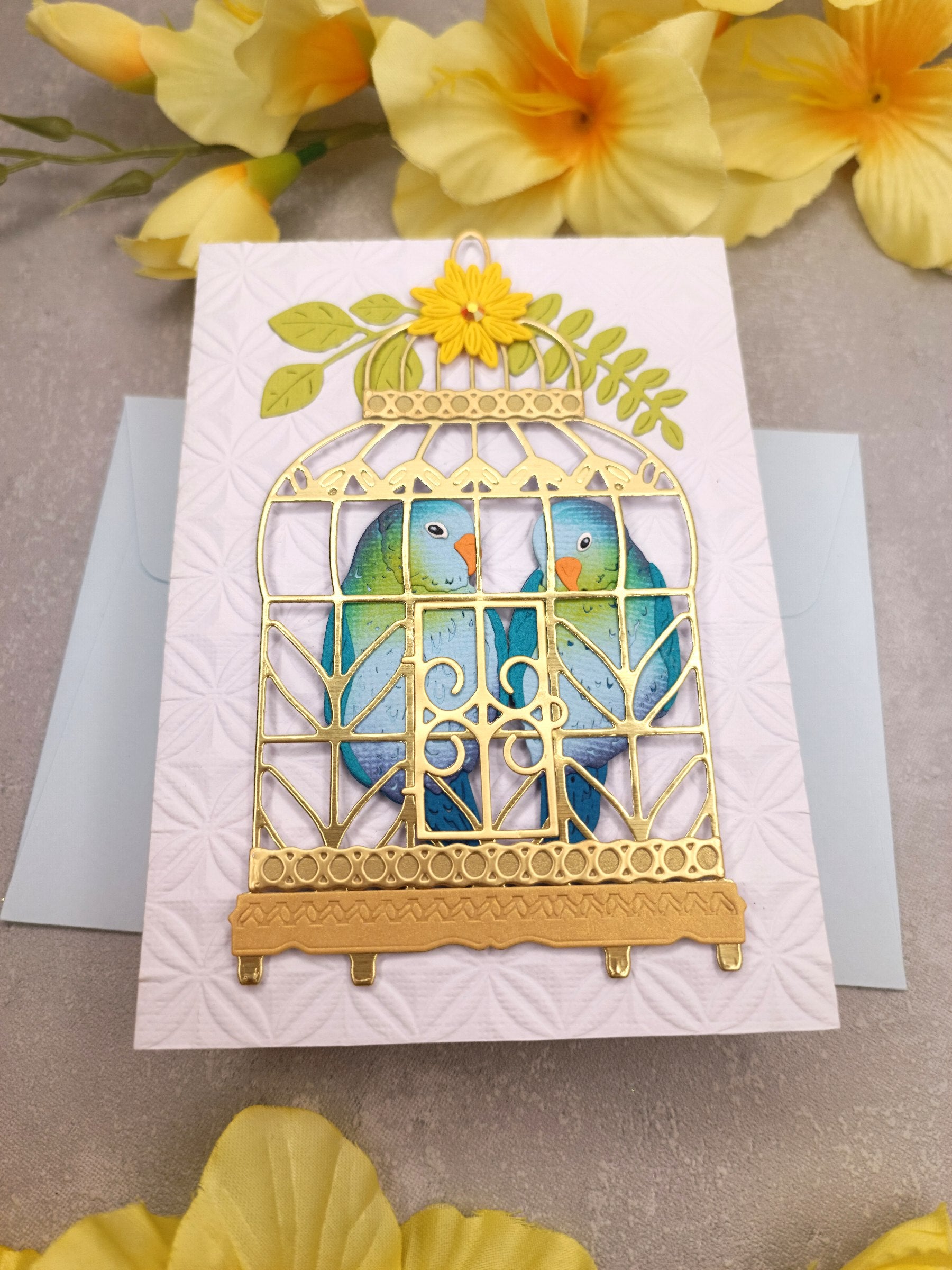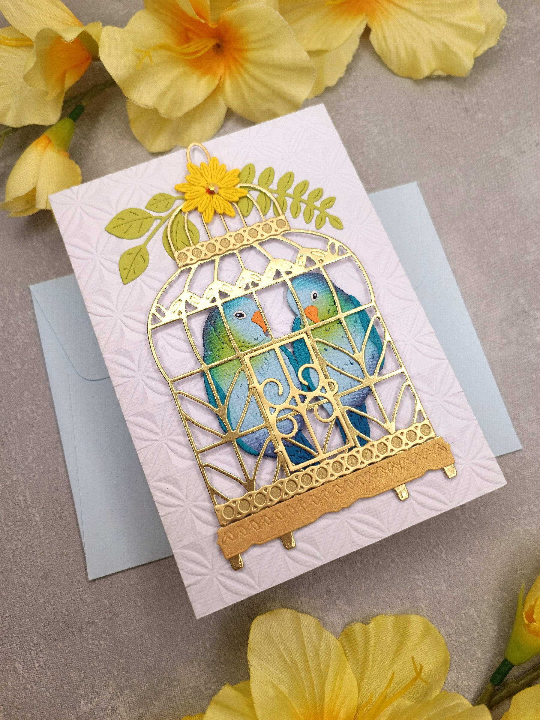 - Bílé pozadí je zdobeno geometrickým reliéfem, přání zdobí modré andulky ve zlaté klícce