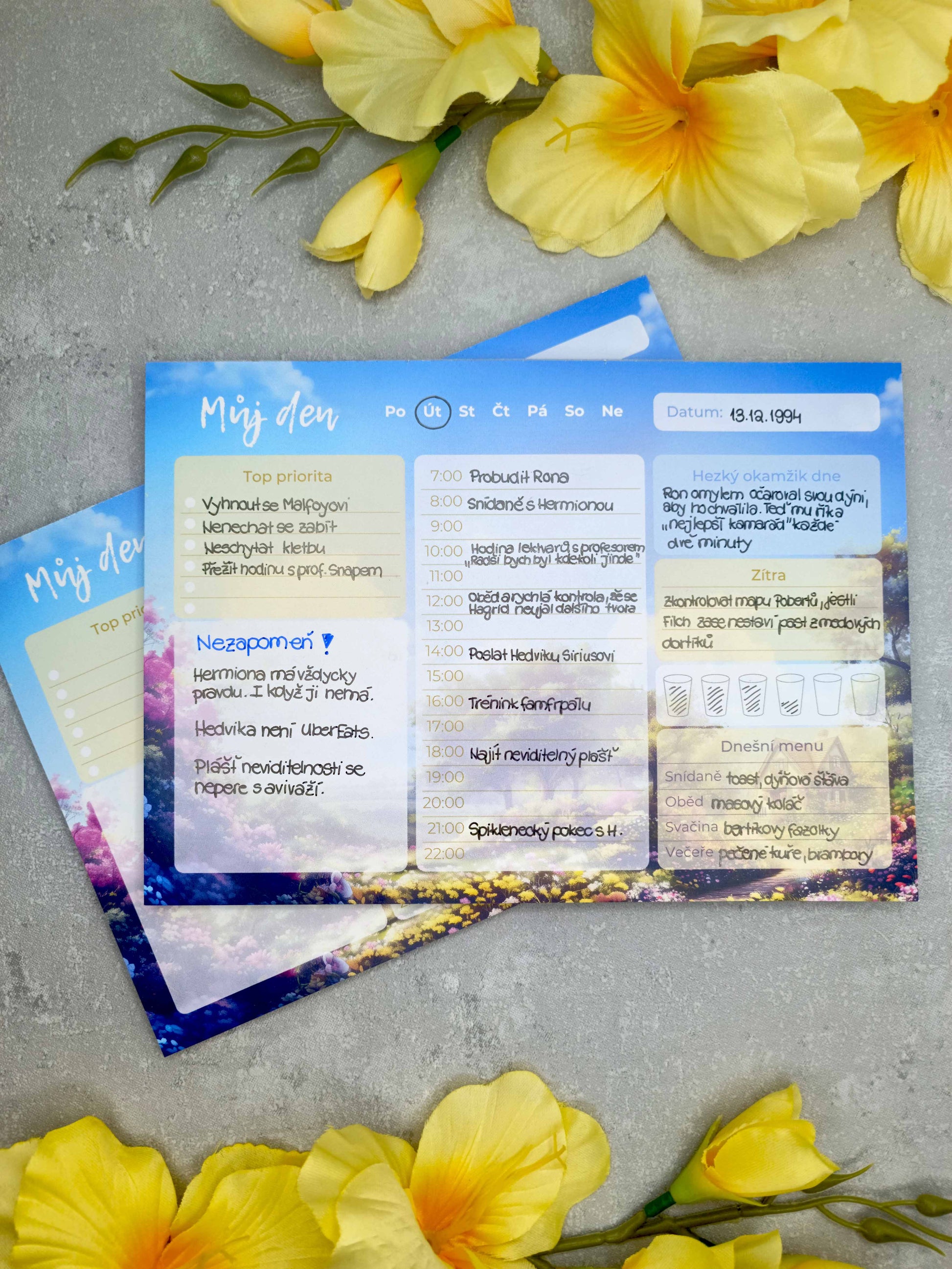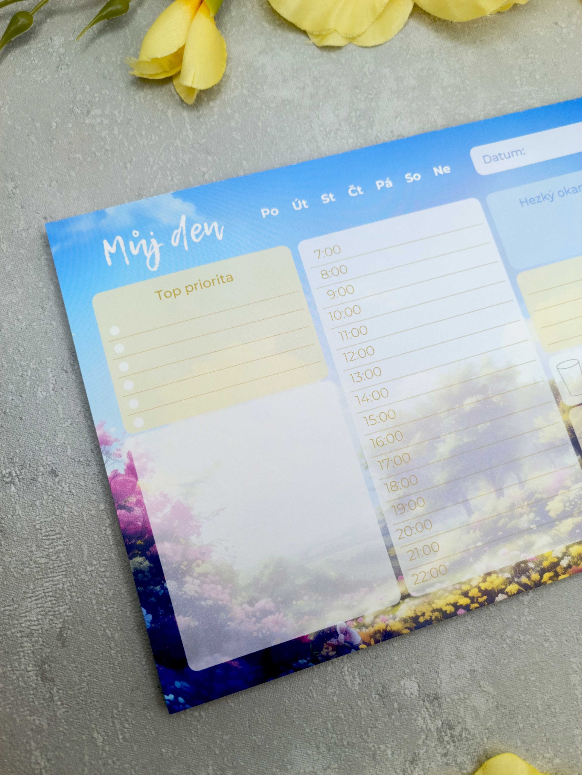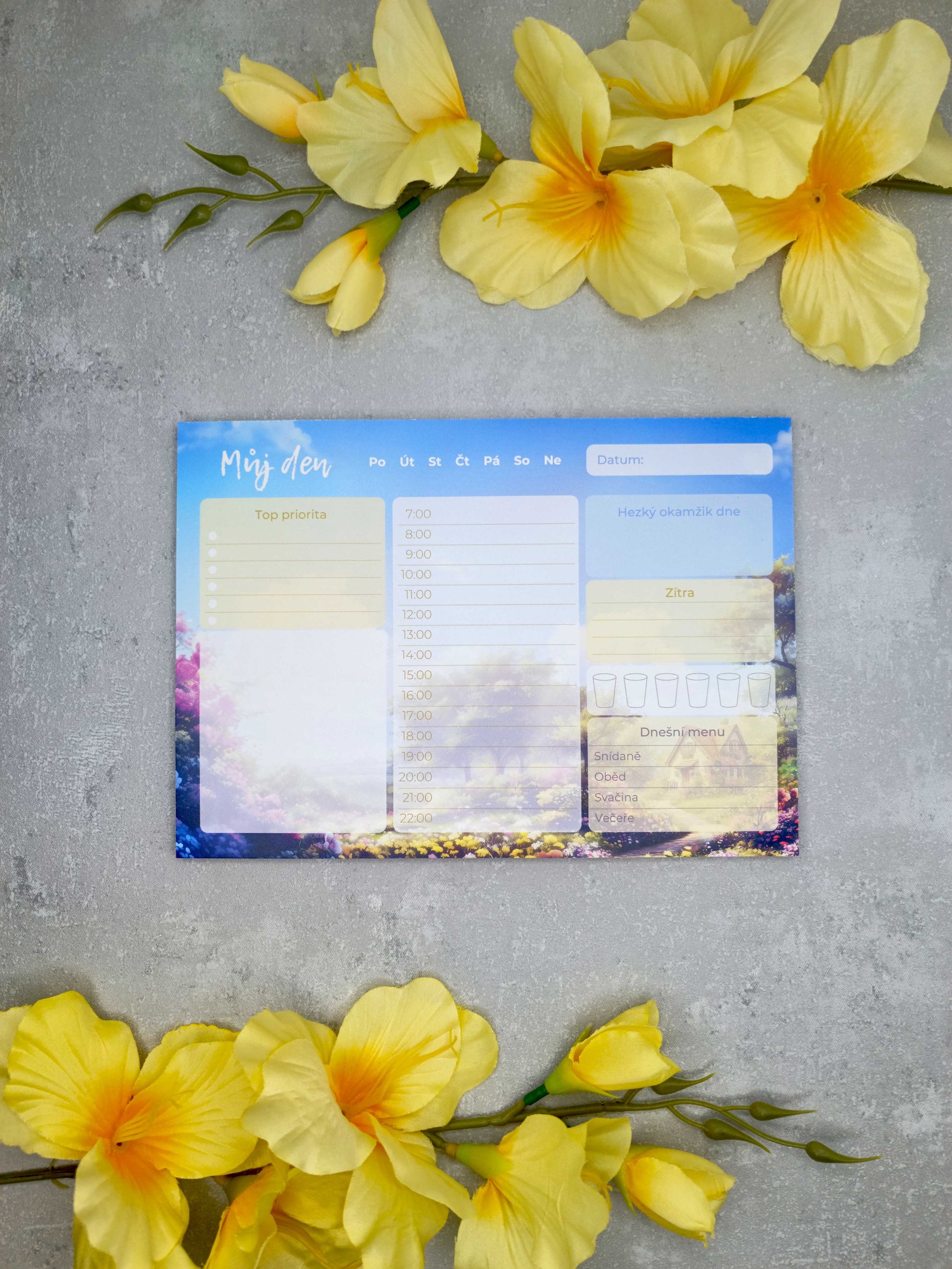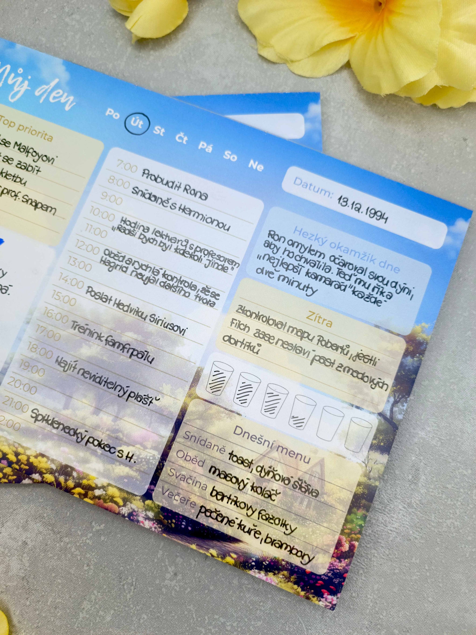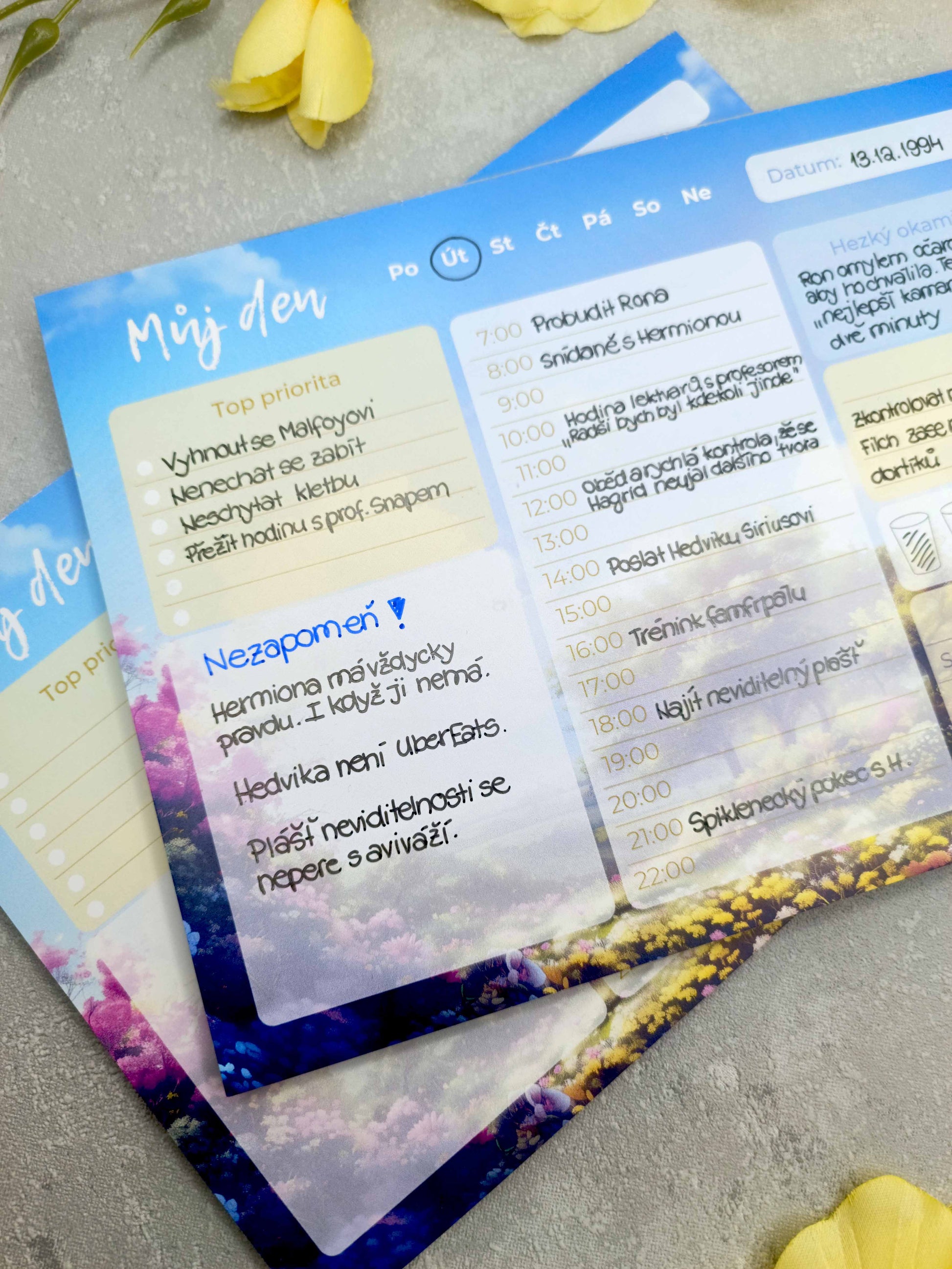 Každý list nabízí prostor pro denní harmonogram, priority, záznam hezkých okamžiků i drobné poznámky. Po vyplnění si ho můžete vytrhnout a připnout na nástěnku, lednici nebo si ho ponechat v bloku jako osobní deník.