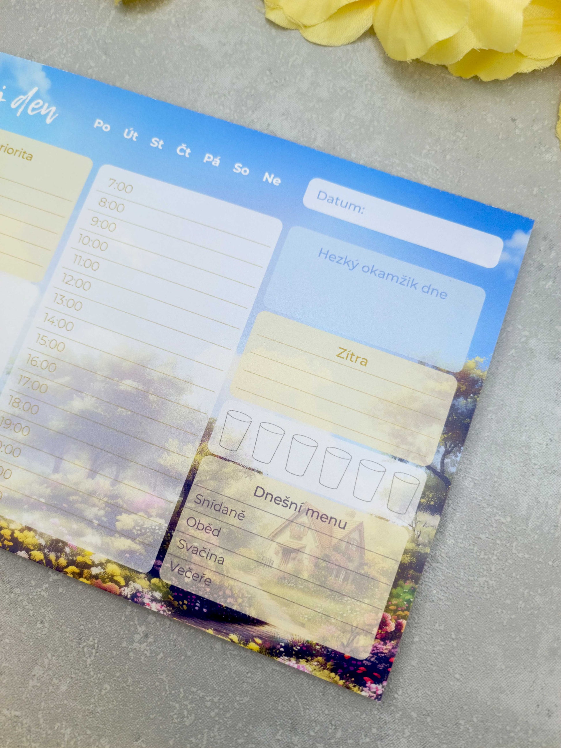 Začněte každý den s klidem a přehledem díky tomuto dennímu plánovači s jemným motivem krajiny s chaloupkou a modrou oblohou.