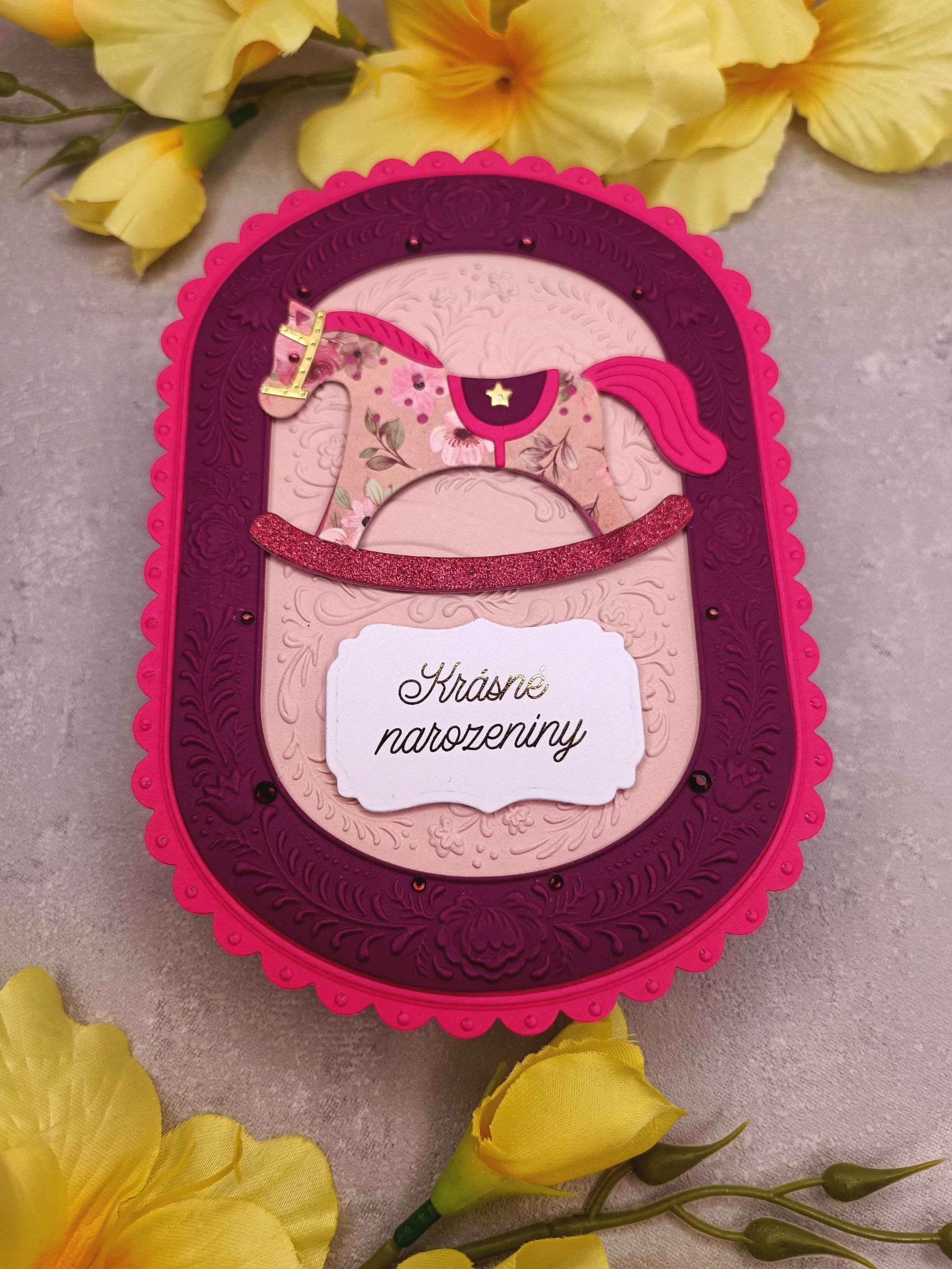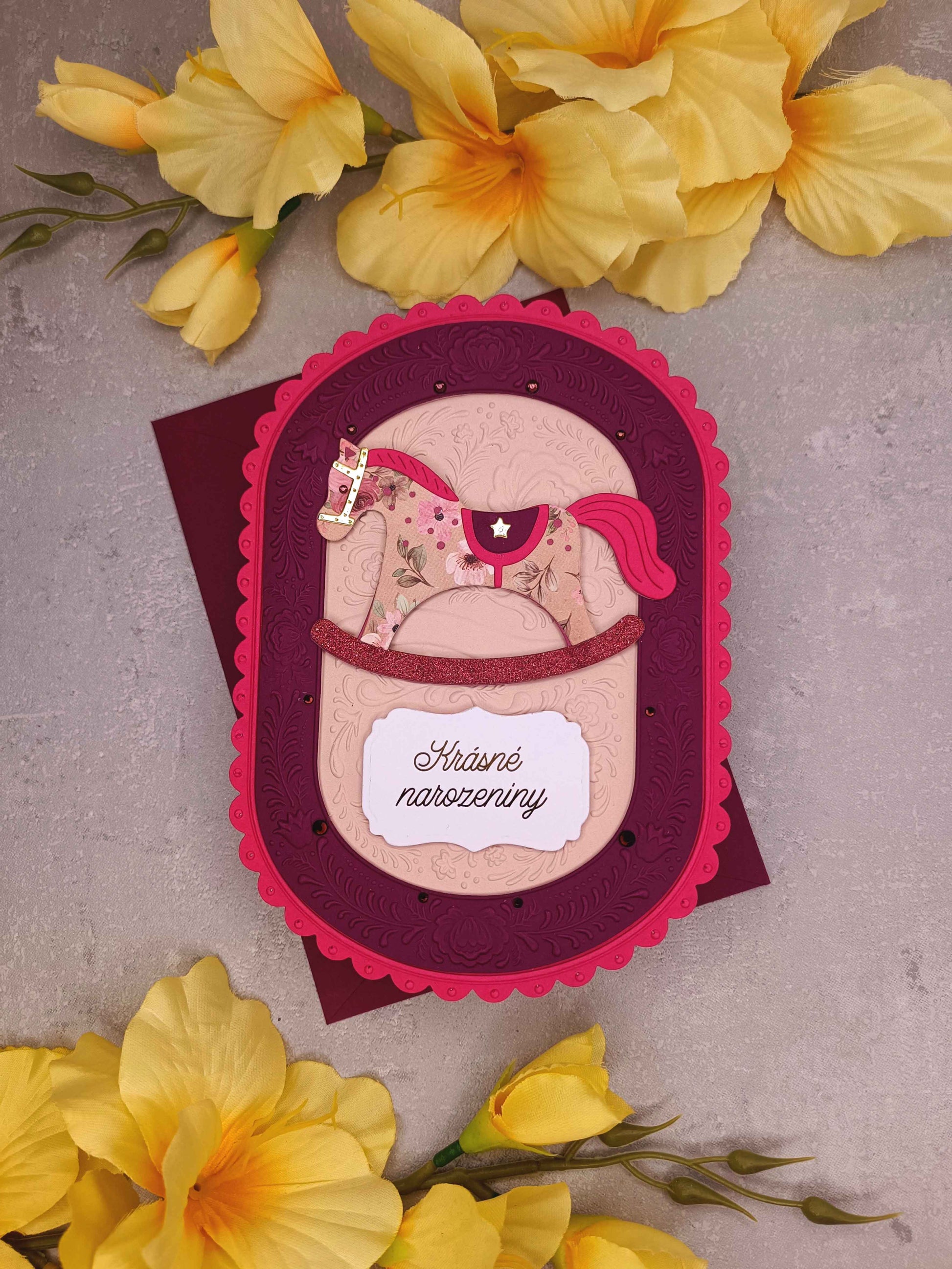 - Ručně vyrobené dětské přání s motivem houpacího koníka