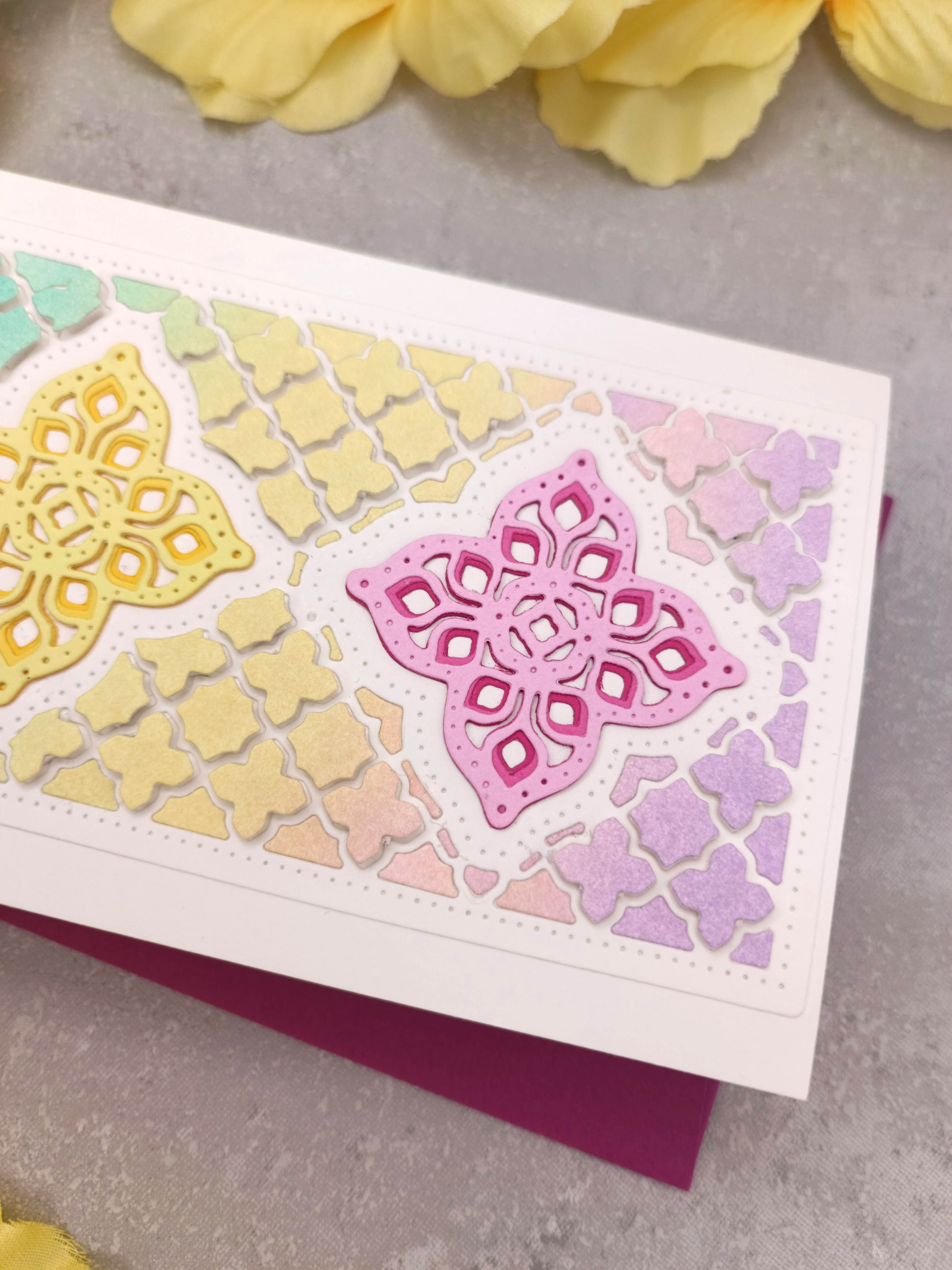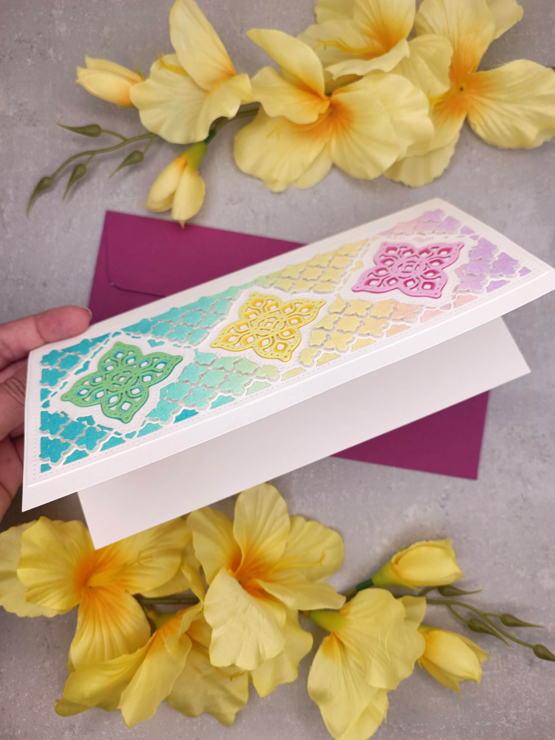 Duhové ručně vyrobené přáníčko s jemným symetrickým motivem, které svou univerzálností potěší při jakékoliv příležitosti. Jednoduchý, nadčasový design bez nápisu umožňuje doplnit vaše osobní přání přesně podle události – ať už jde o narozeniny, svatbu, výročí či poděkování. Přání je možné využít jak na výšku, tak na šířku.