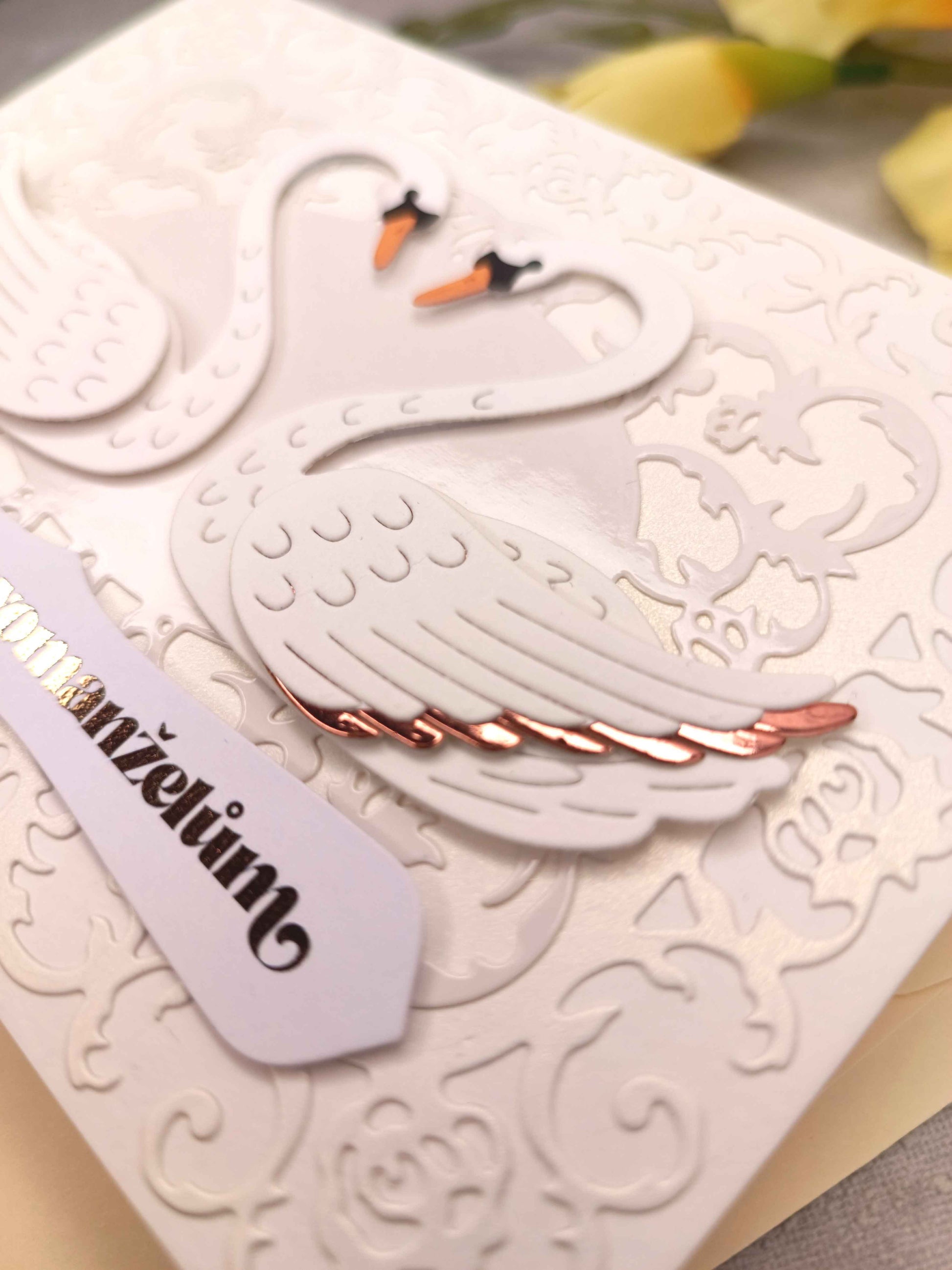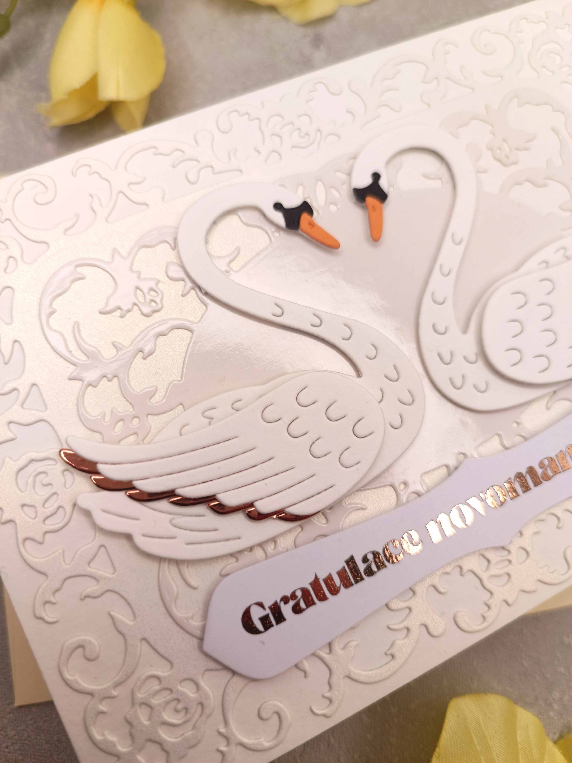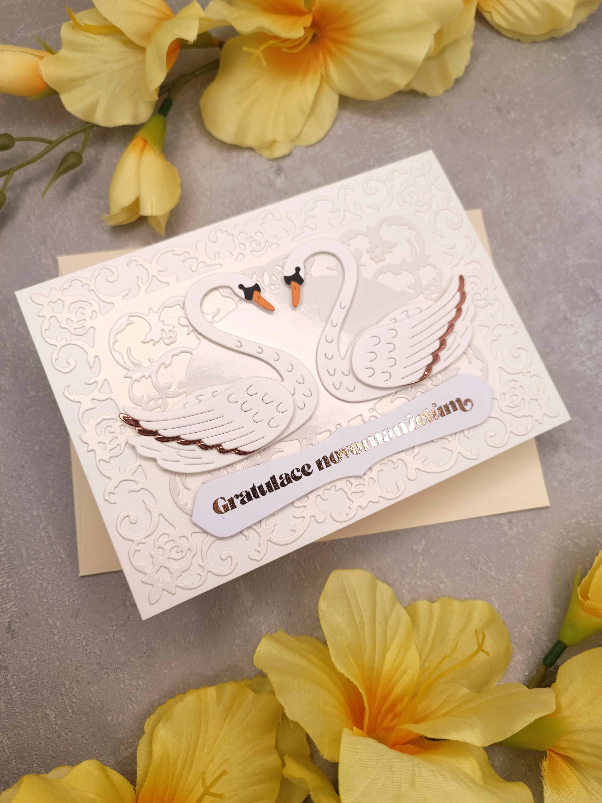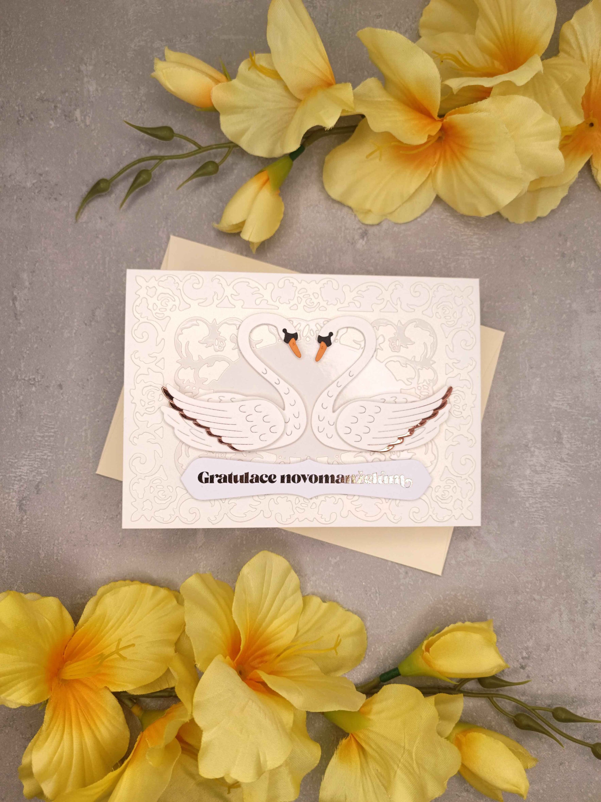 - Bílé pozadí je vyrobeno z lehce třpytivých a lesklých papírů, přání je zdobeno zlatým nápisem "Gratulace novomanželům"