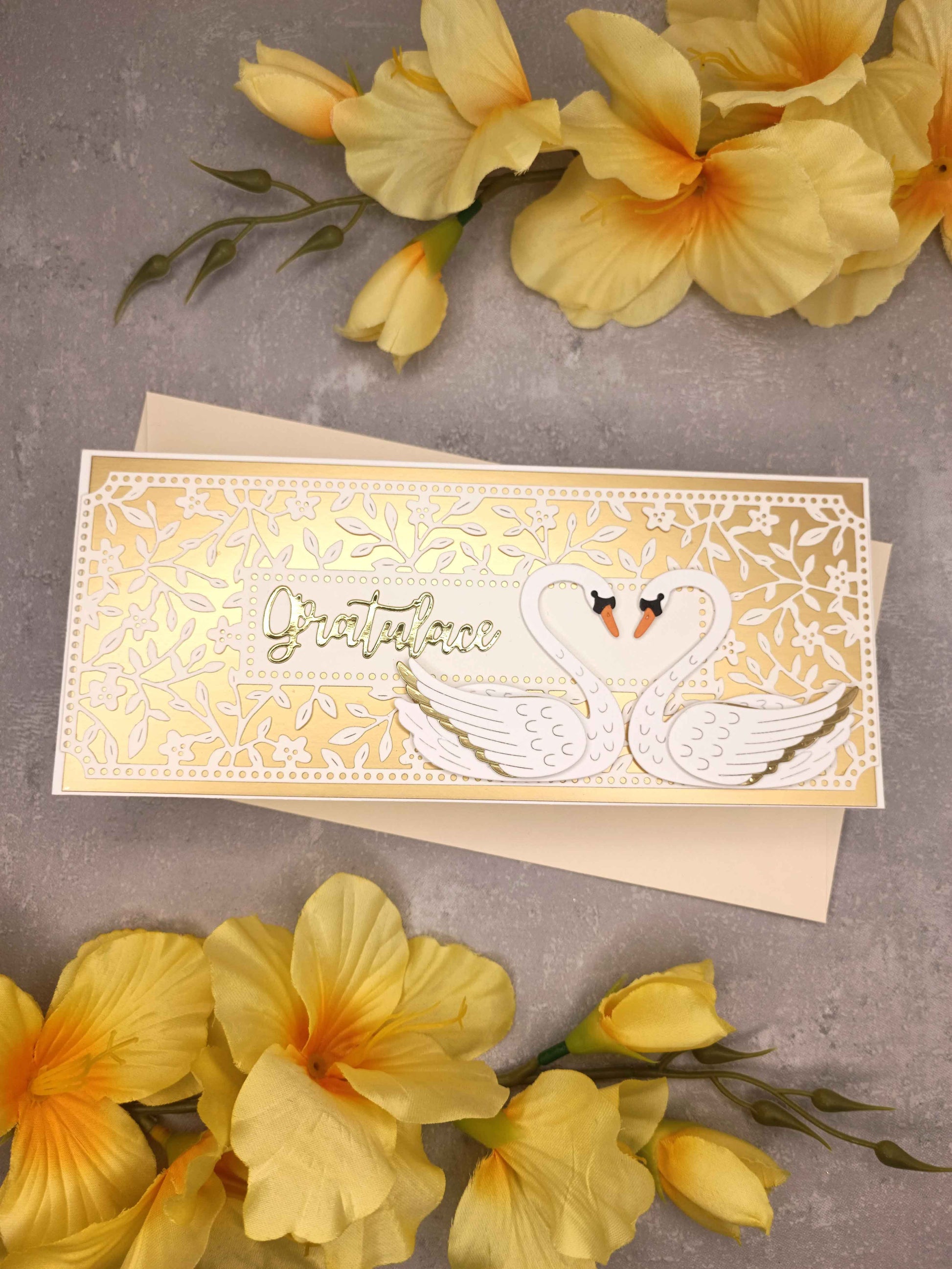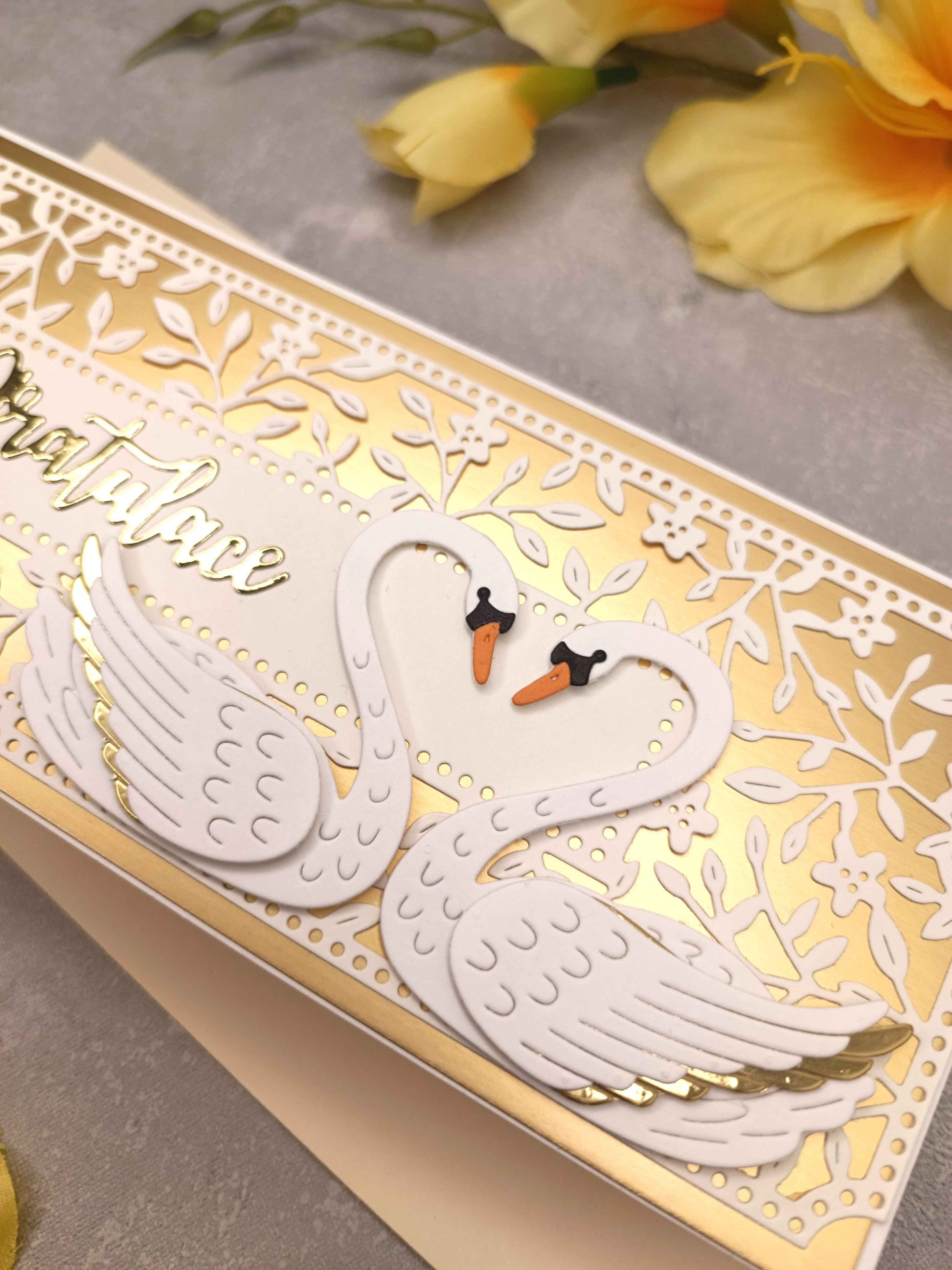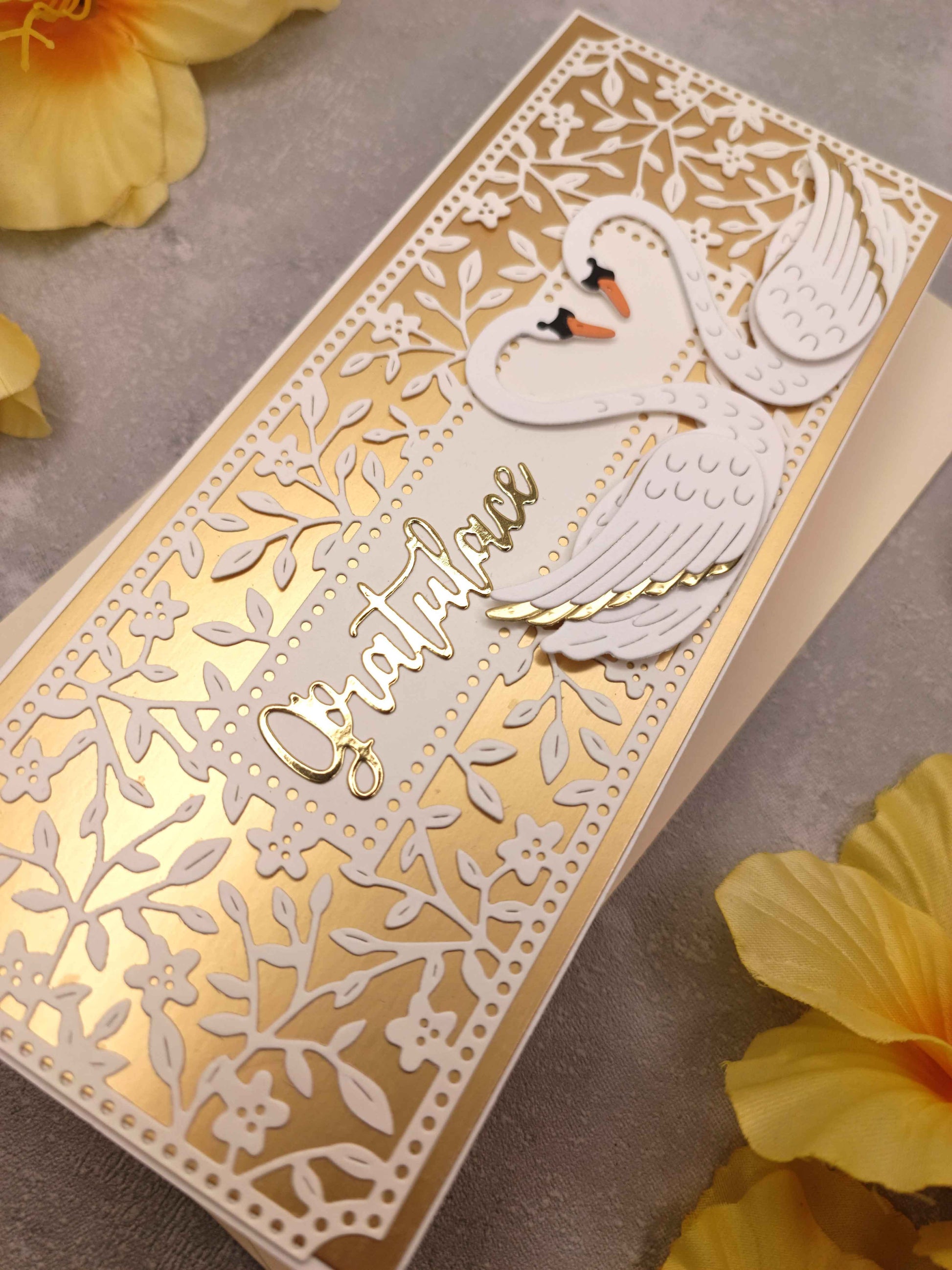- Přání je laděno do matné zlaté a bílé barvy, zdobeno květinovým pozadím a labutěmi