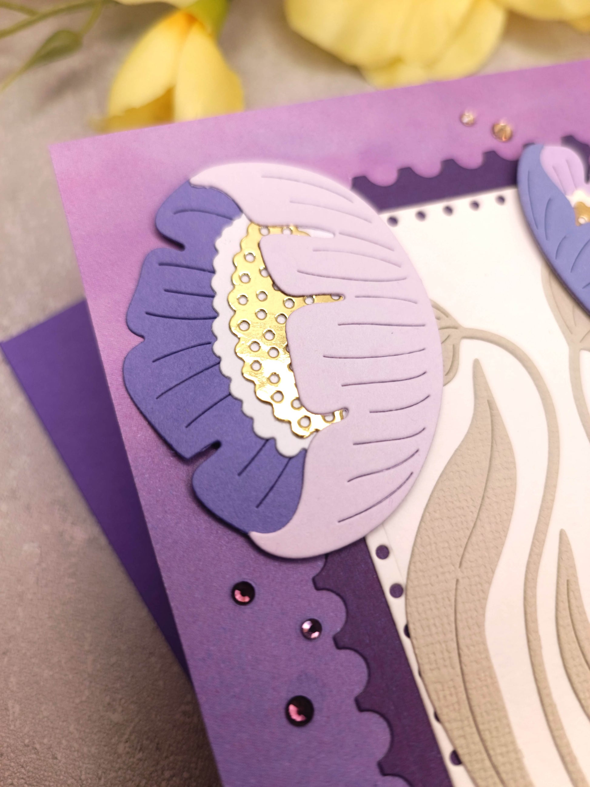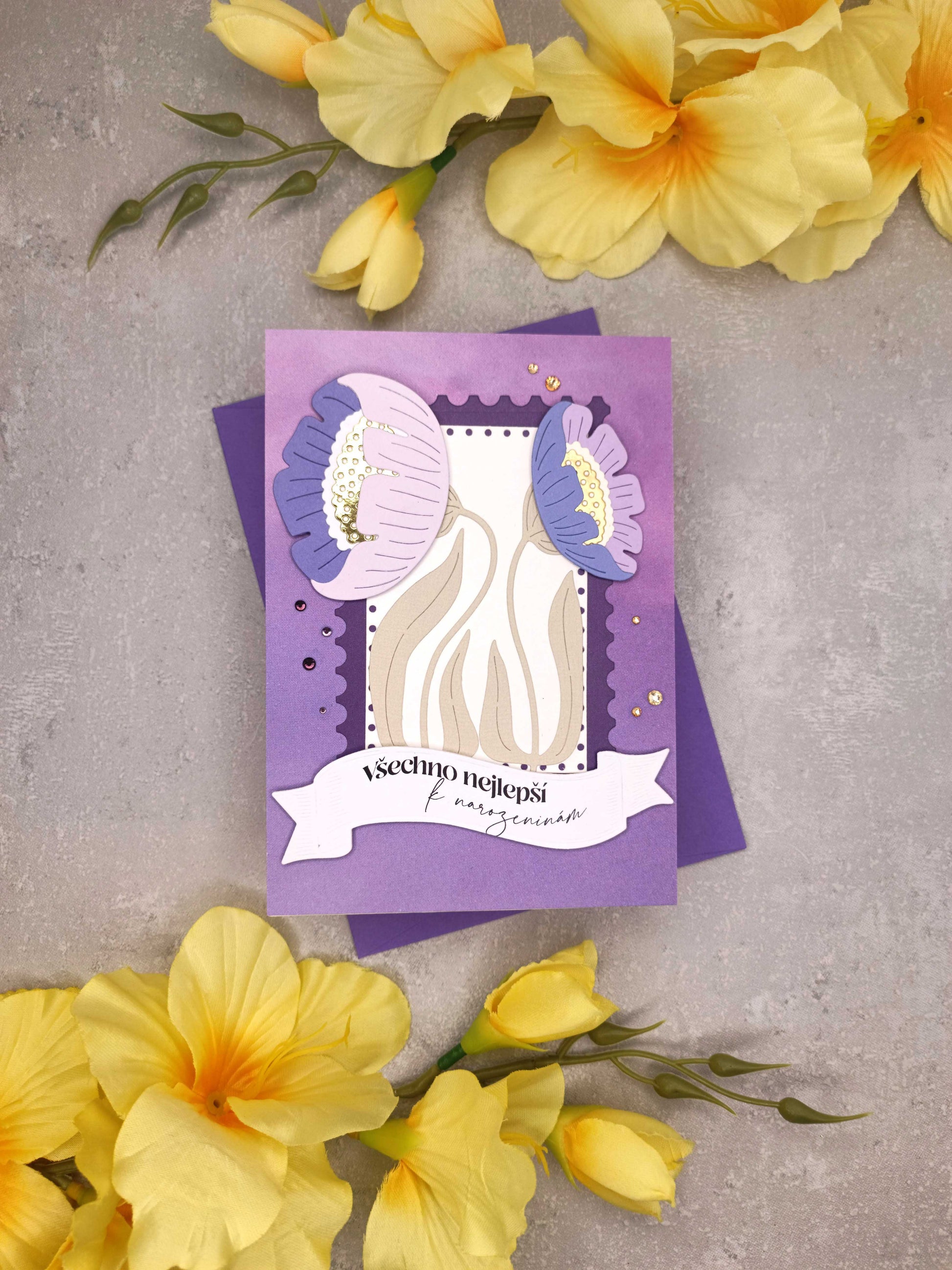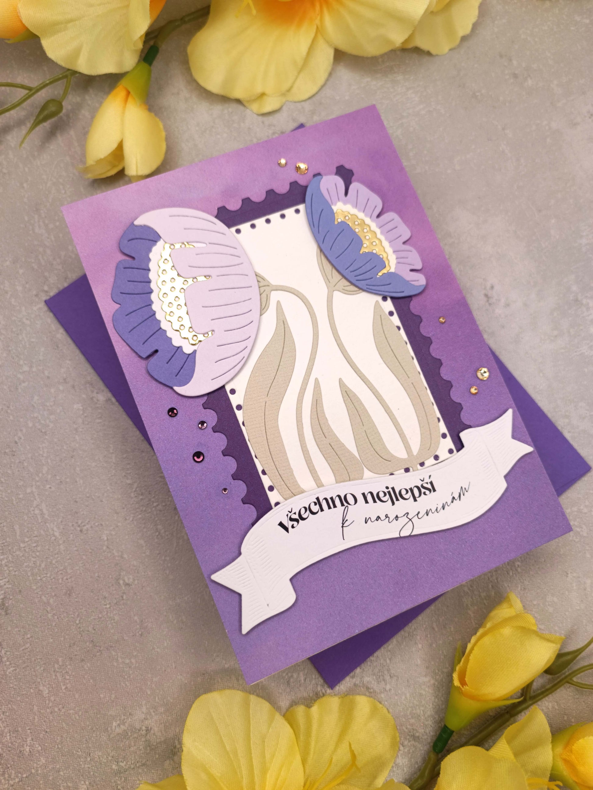- Přání je laděno do fialové barvy a zdobeno pastelovými sasankami, zlatými elementy a kamínky