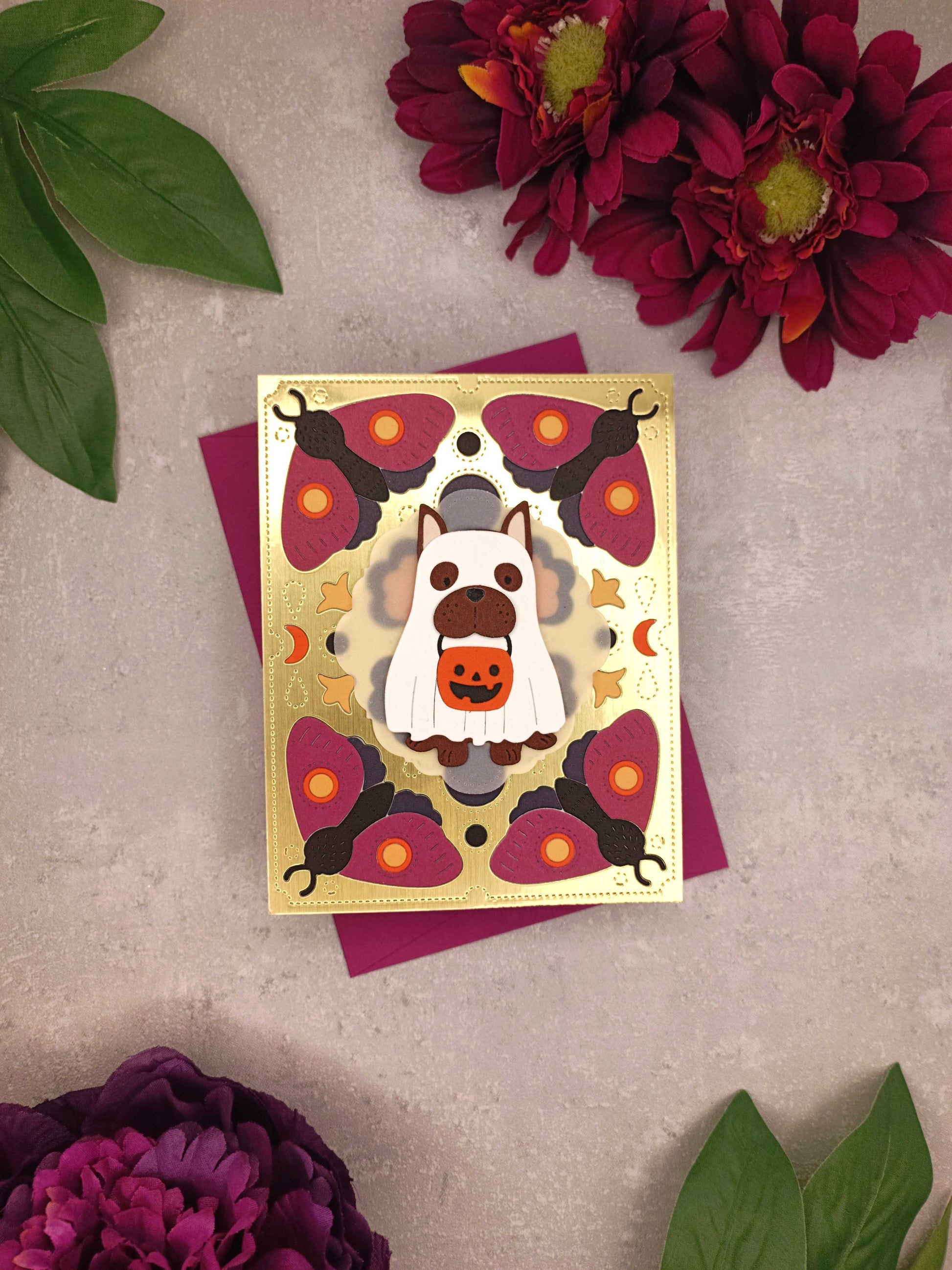 - Přání je ve zlaté barvě a zdobí ho pergamenový rámeček za pejskem