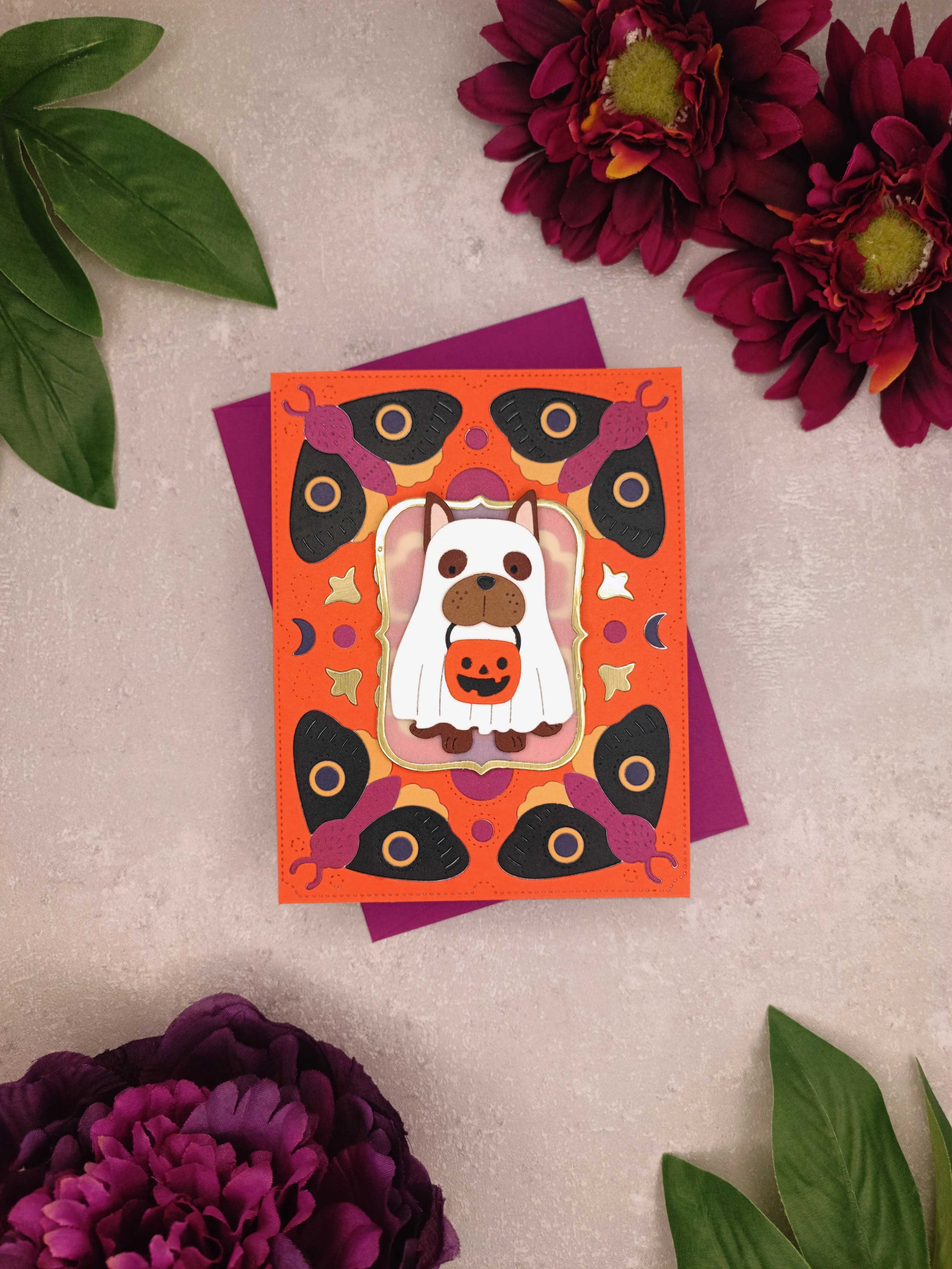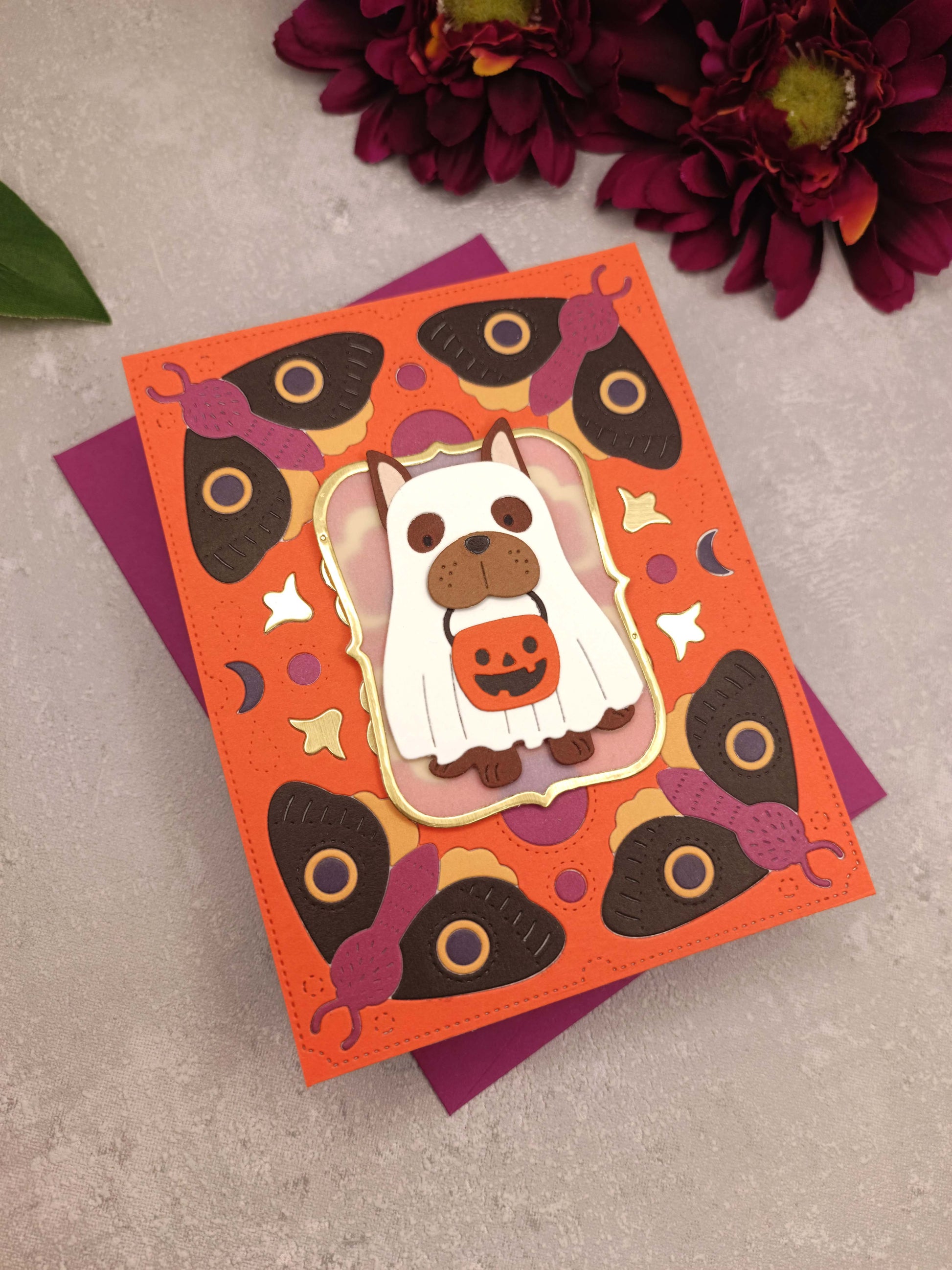 - Přání je sytě oranžové a zdobí ho pergamenový rámeček za pejskem