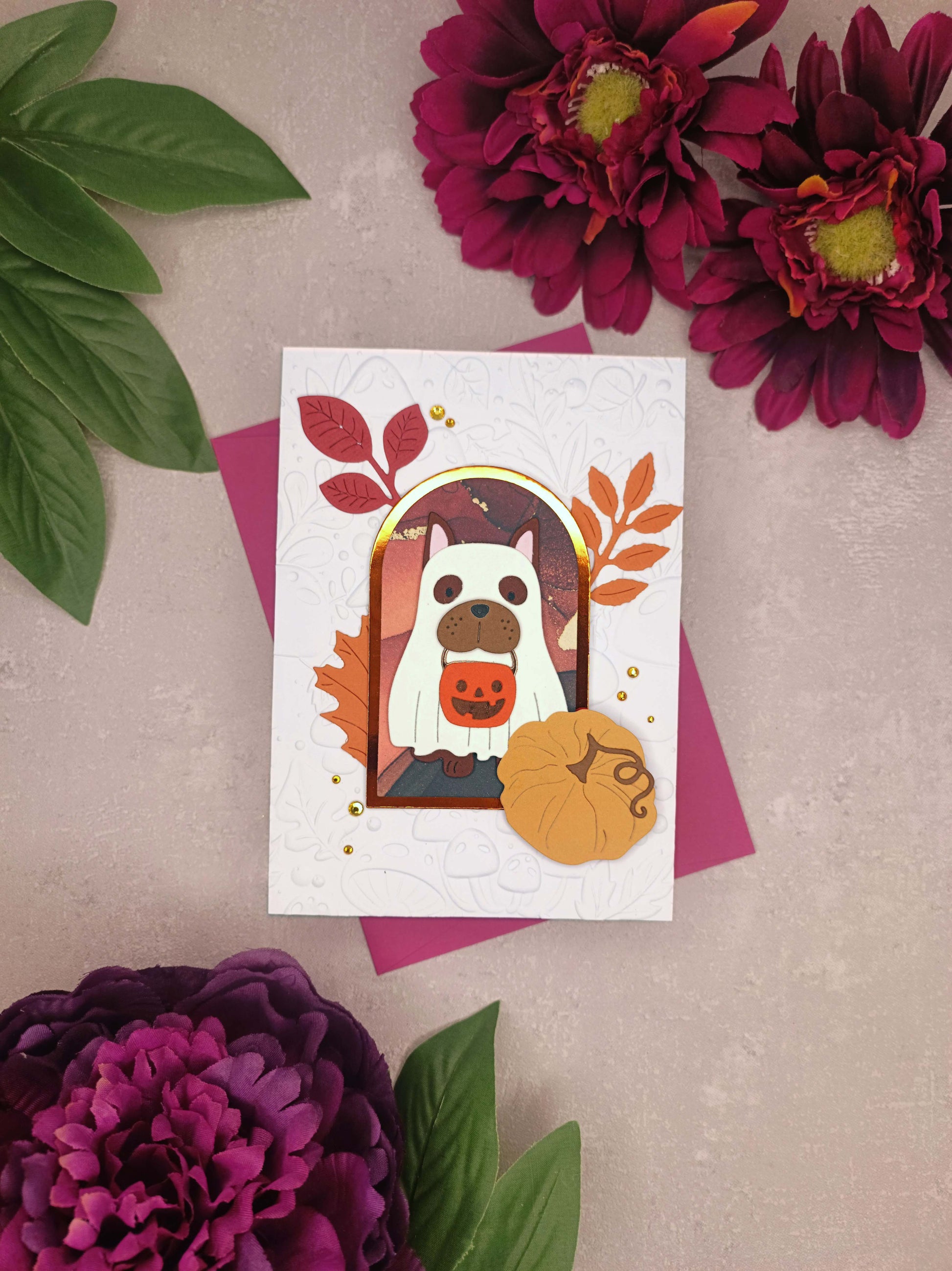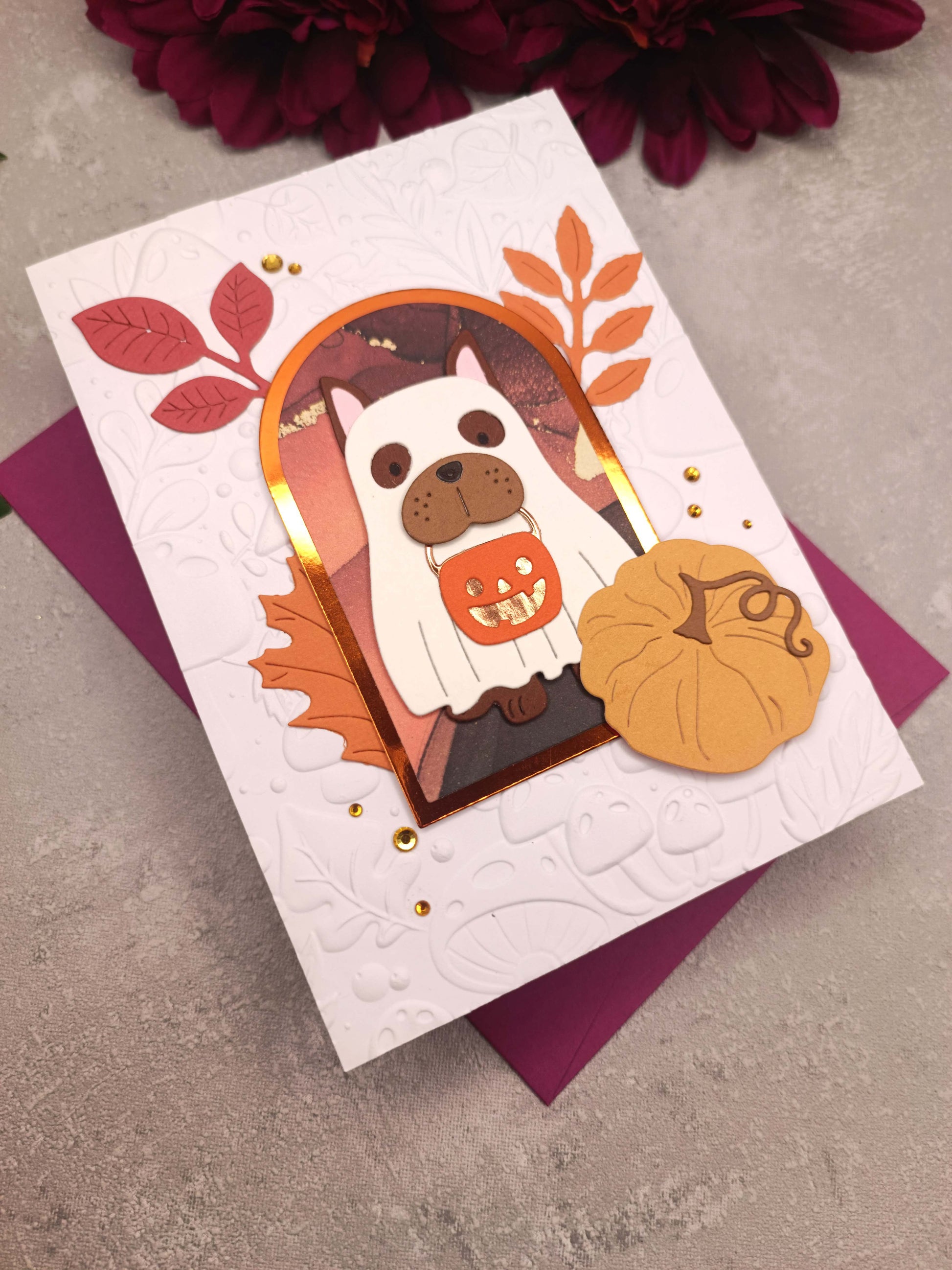- Přání zdobí embosované pozadí s podzimním motivem a podzimní lístečky okolo měděného rámečku