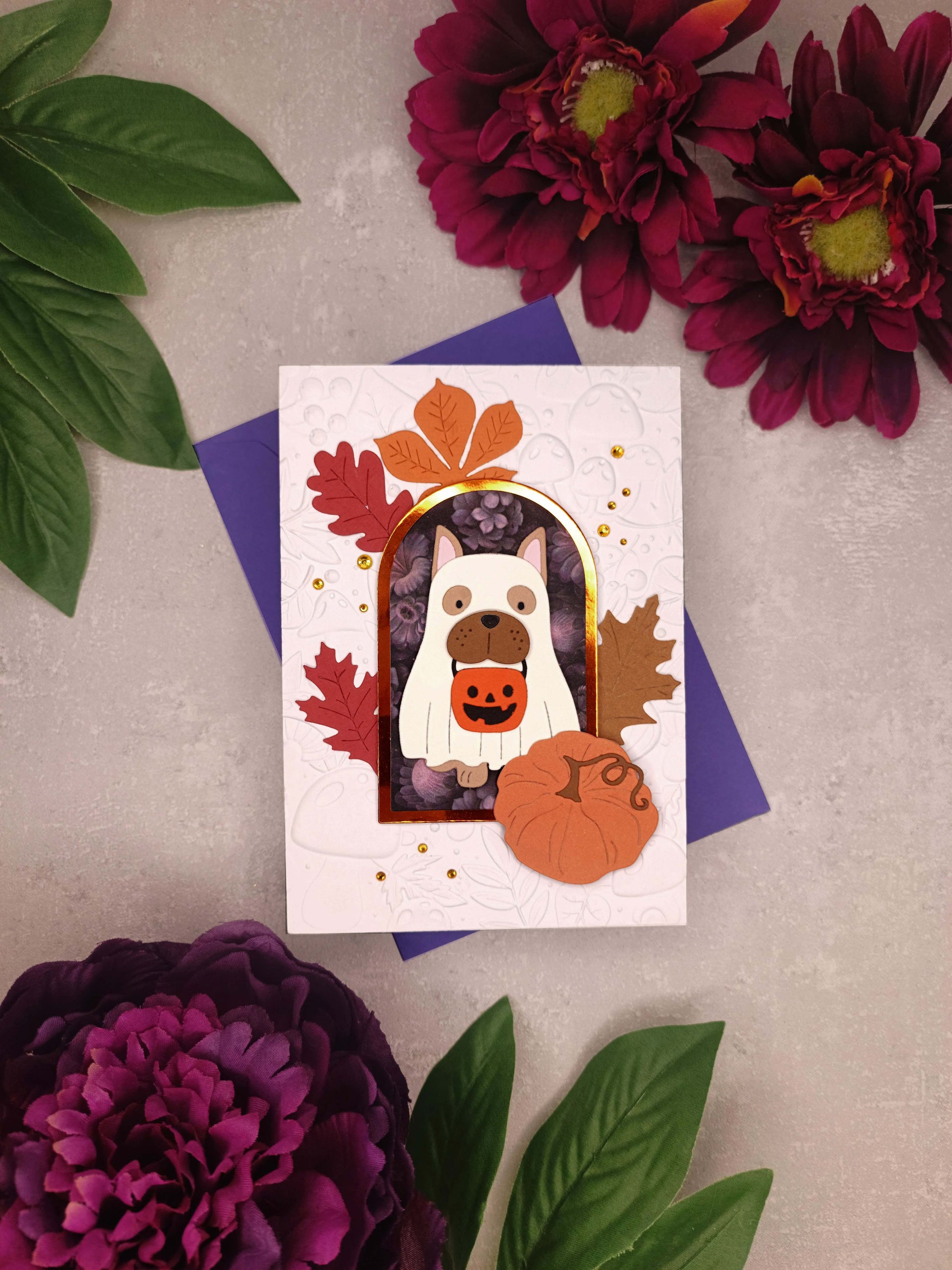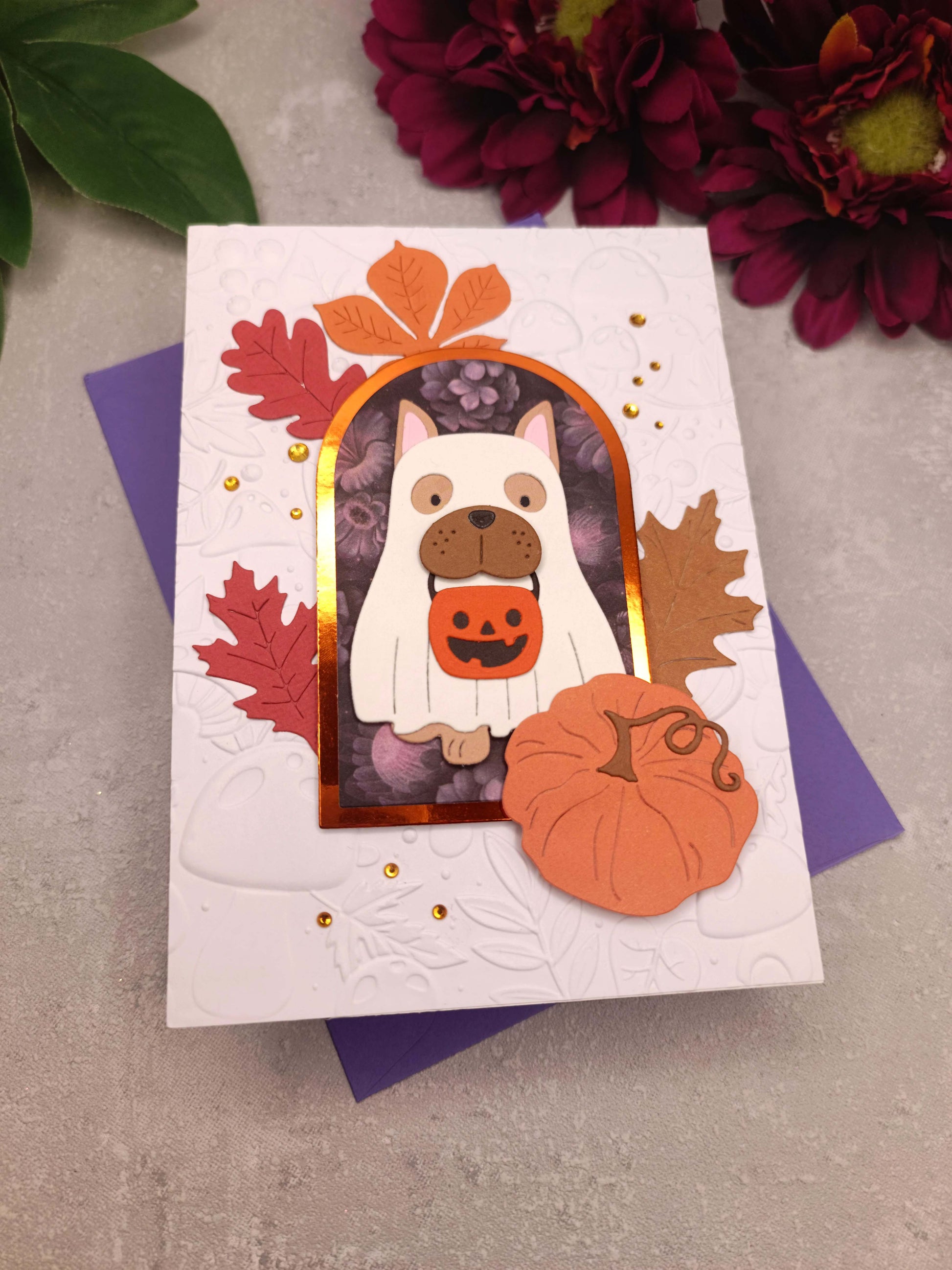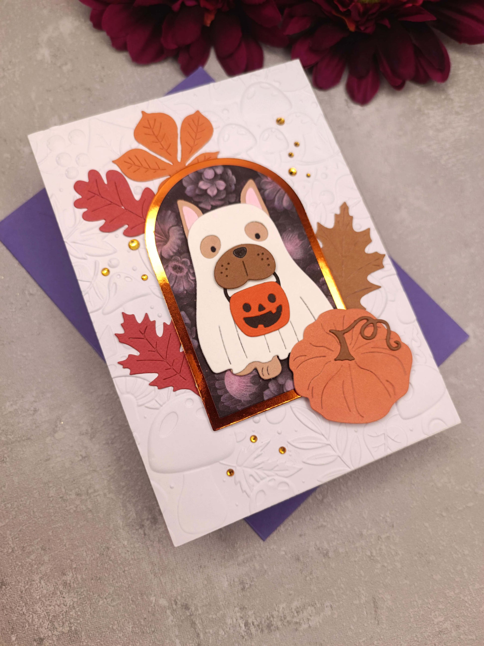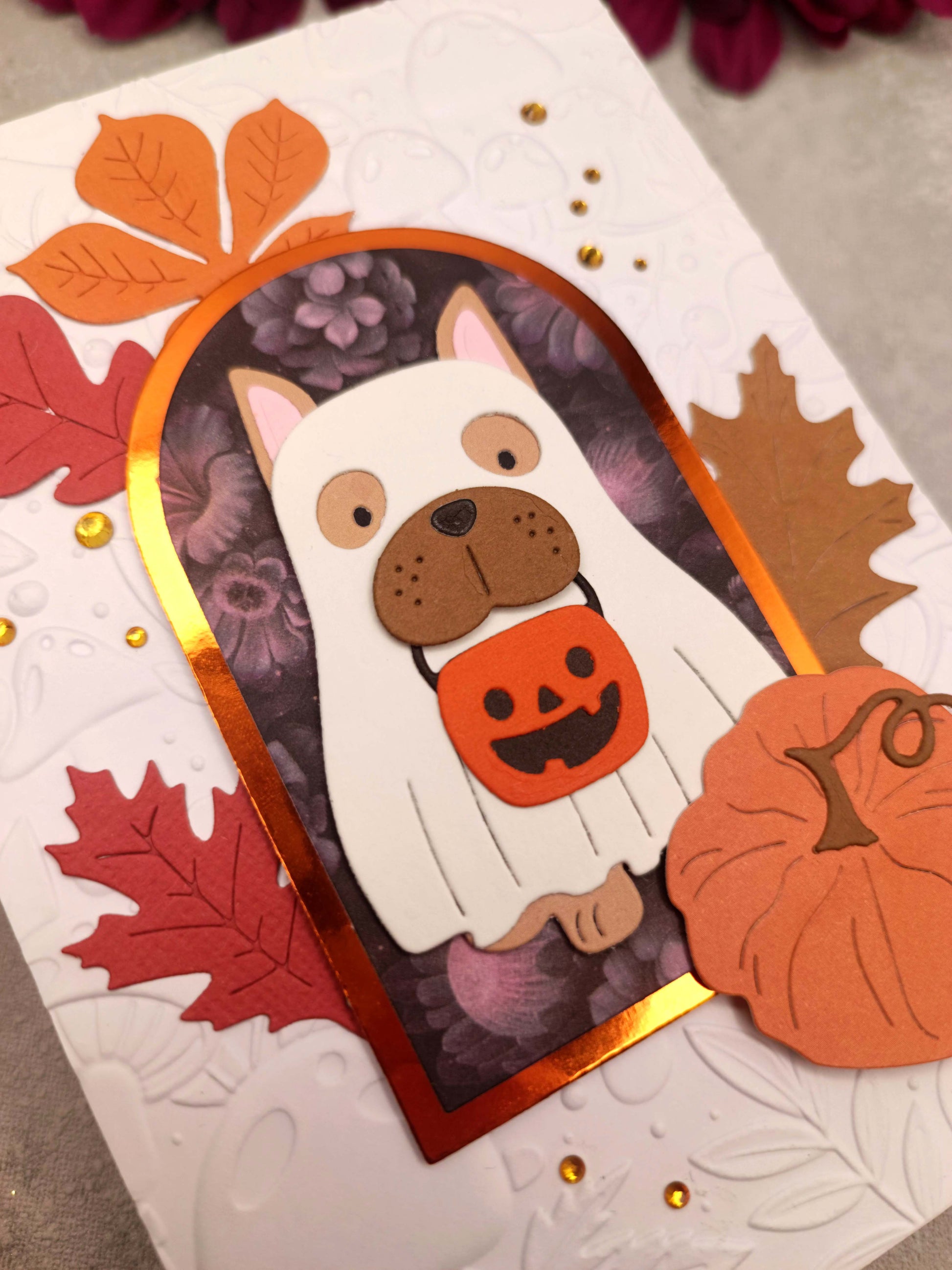 - Přání zdobí embosované pozadí s podzimním motivem a podzimní lístečky okolo měděného rámečku