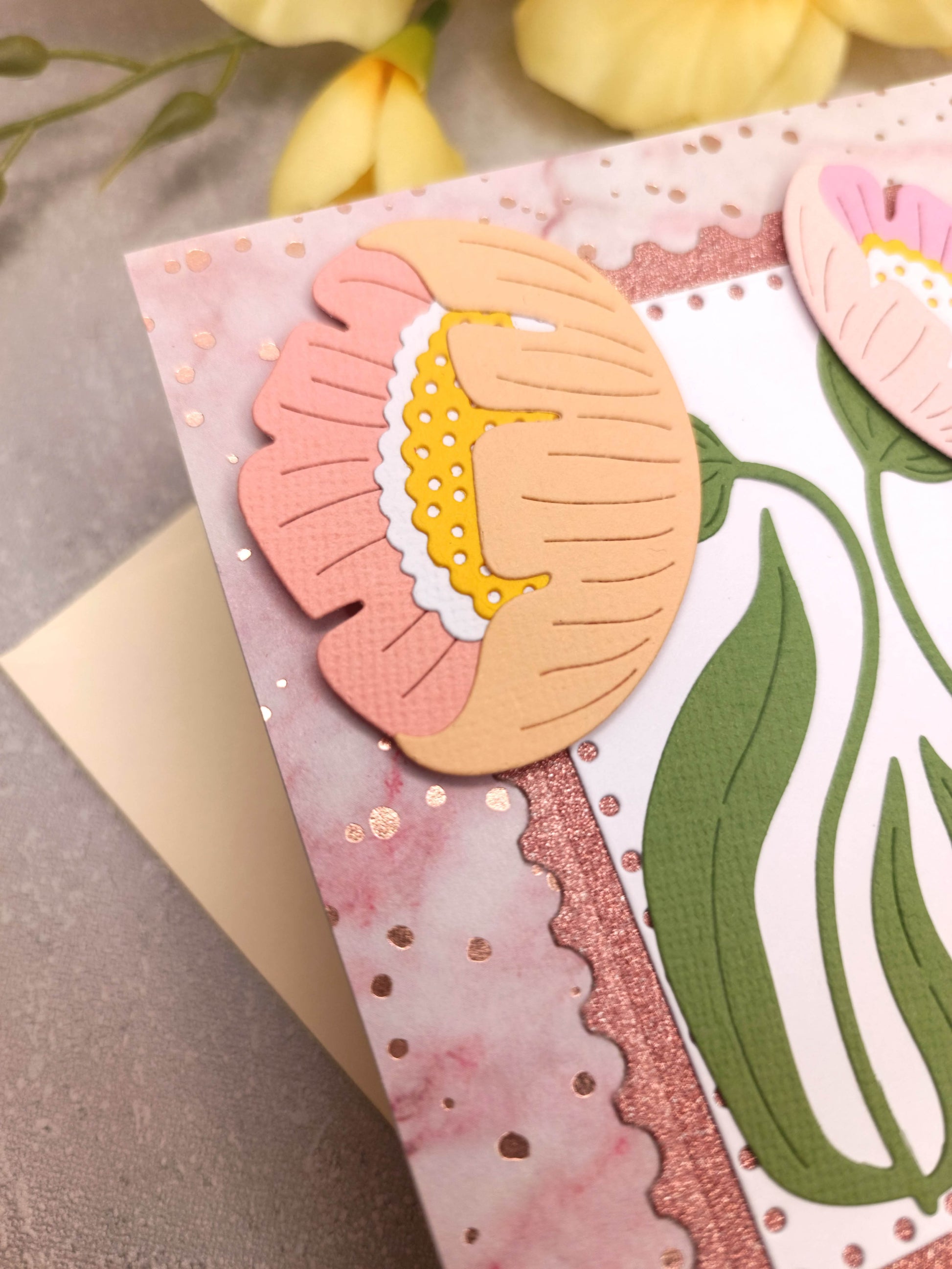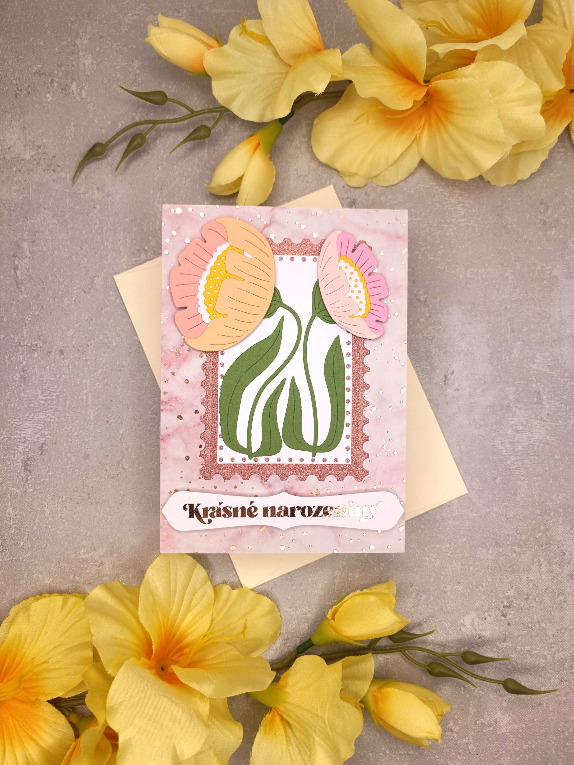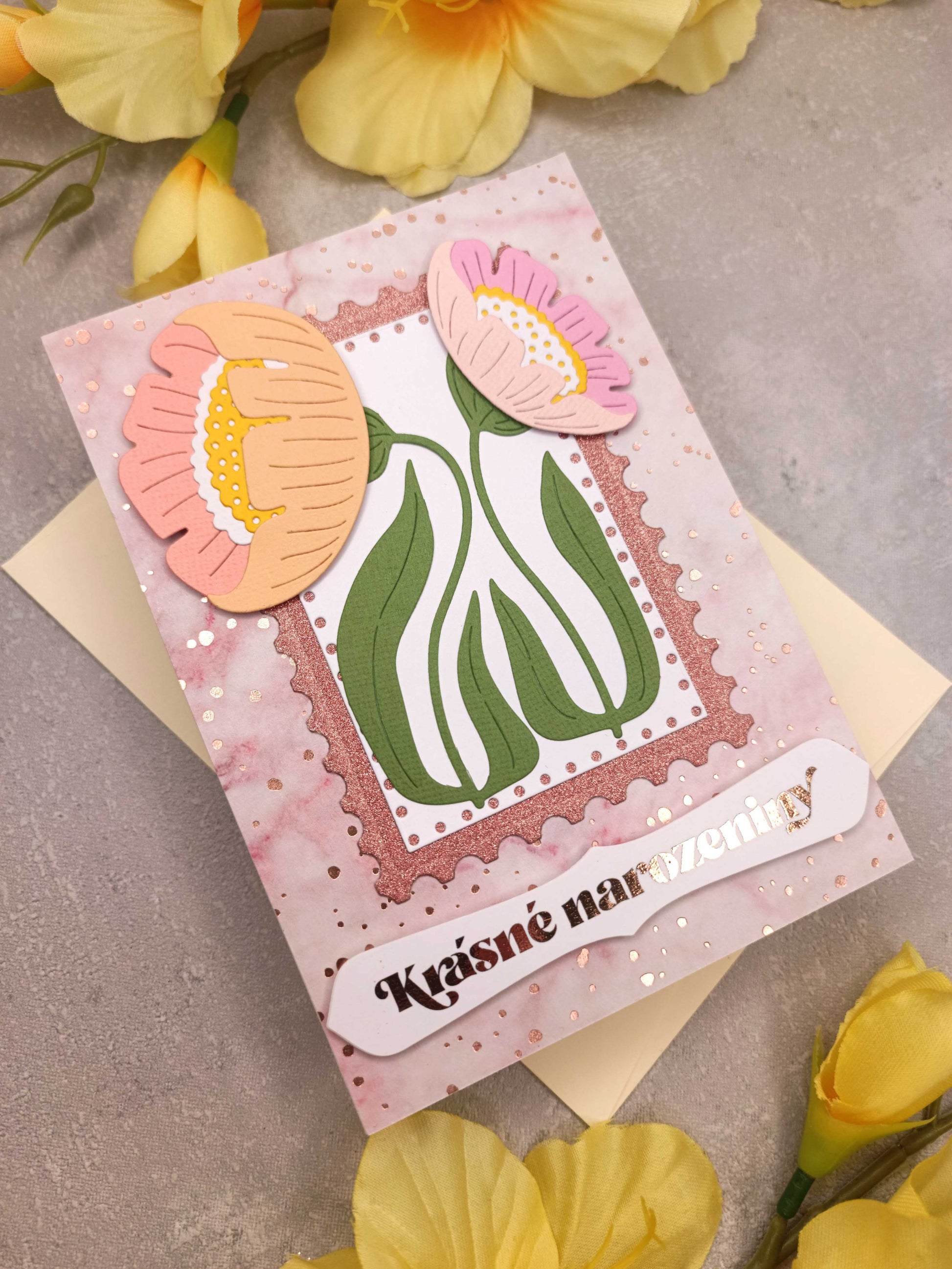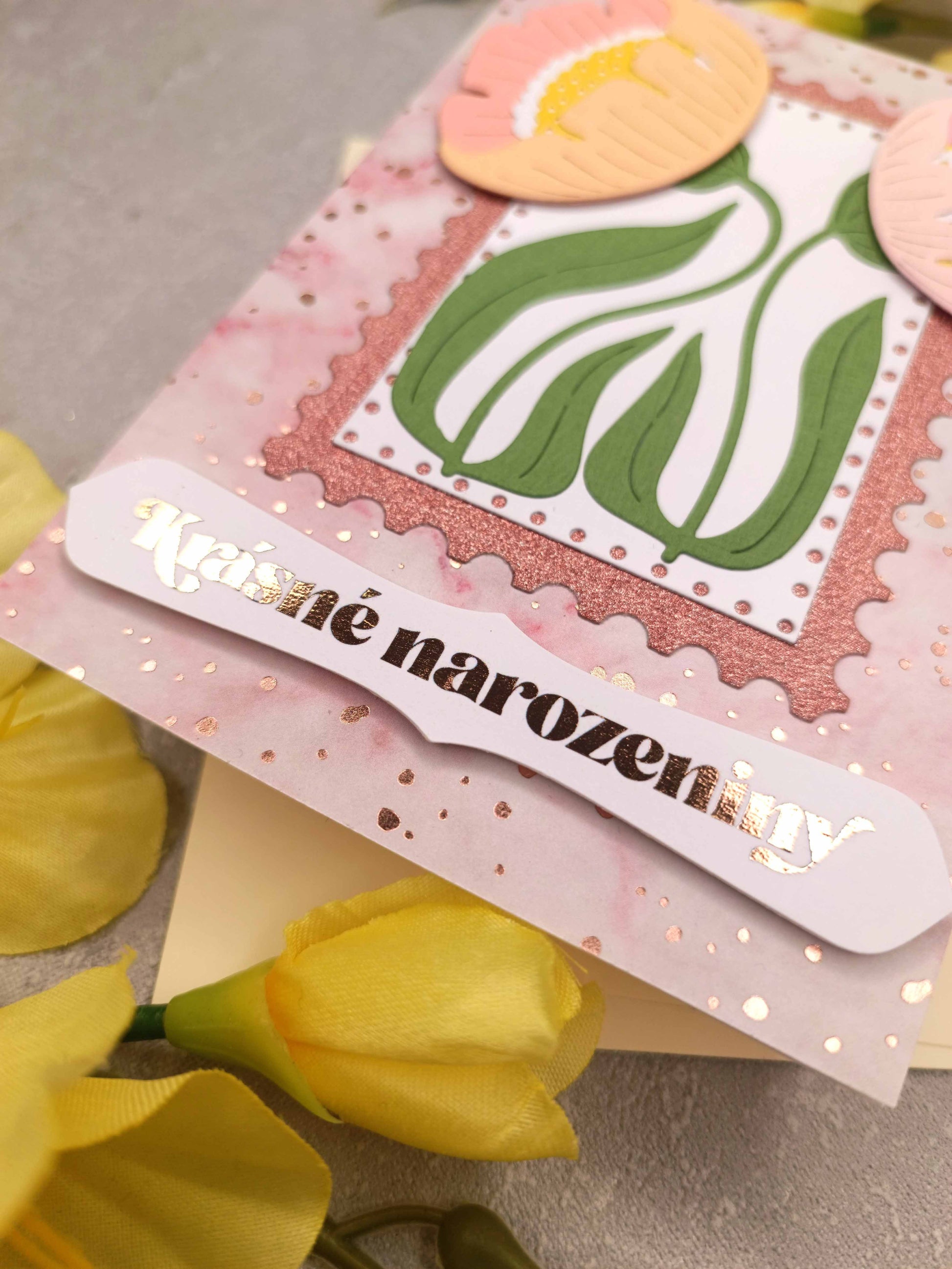 - Přání je laděno do světle růžové barvy a zdobeno růžovo-zlatými elementy