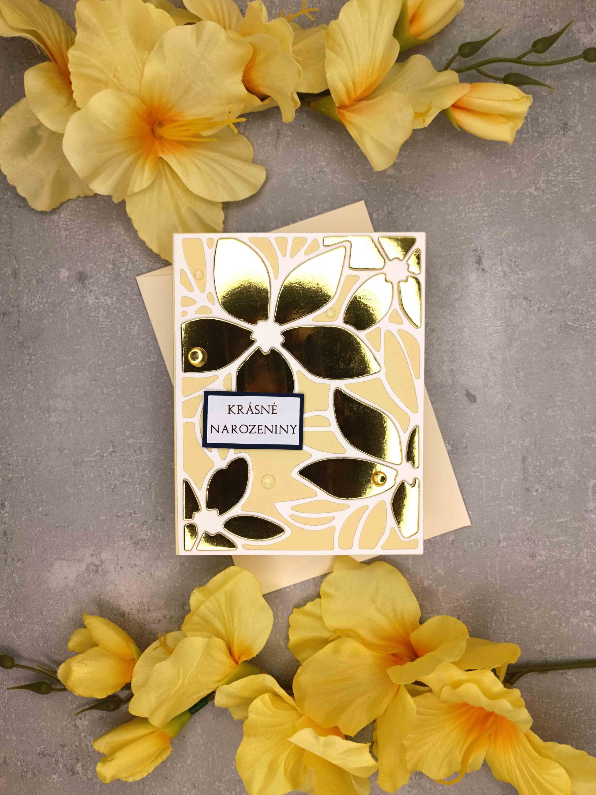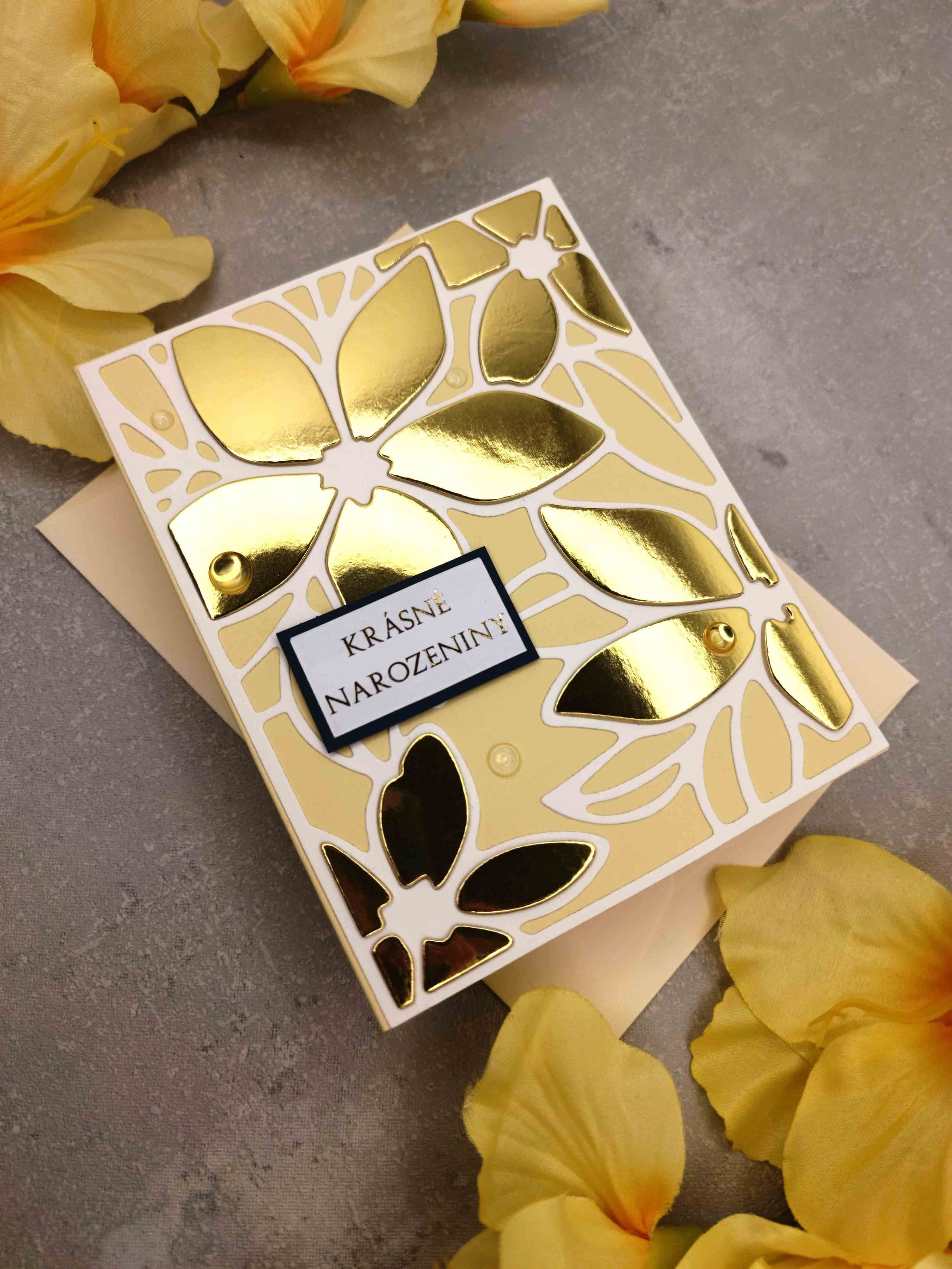- Přání je laděno do krémové barvy a zdobeno zlatými květinami a zlatým textem