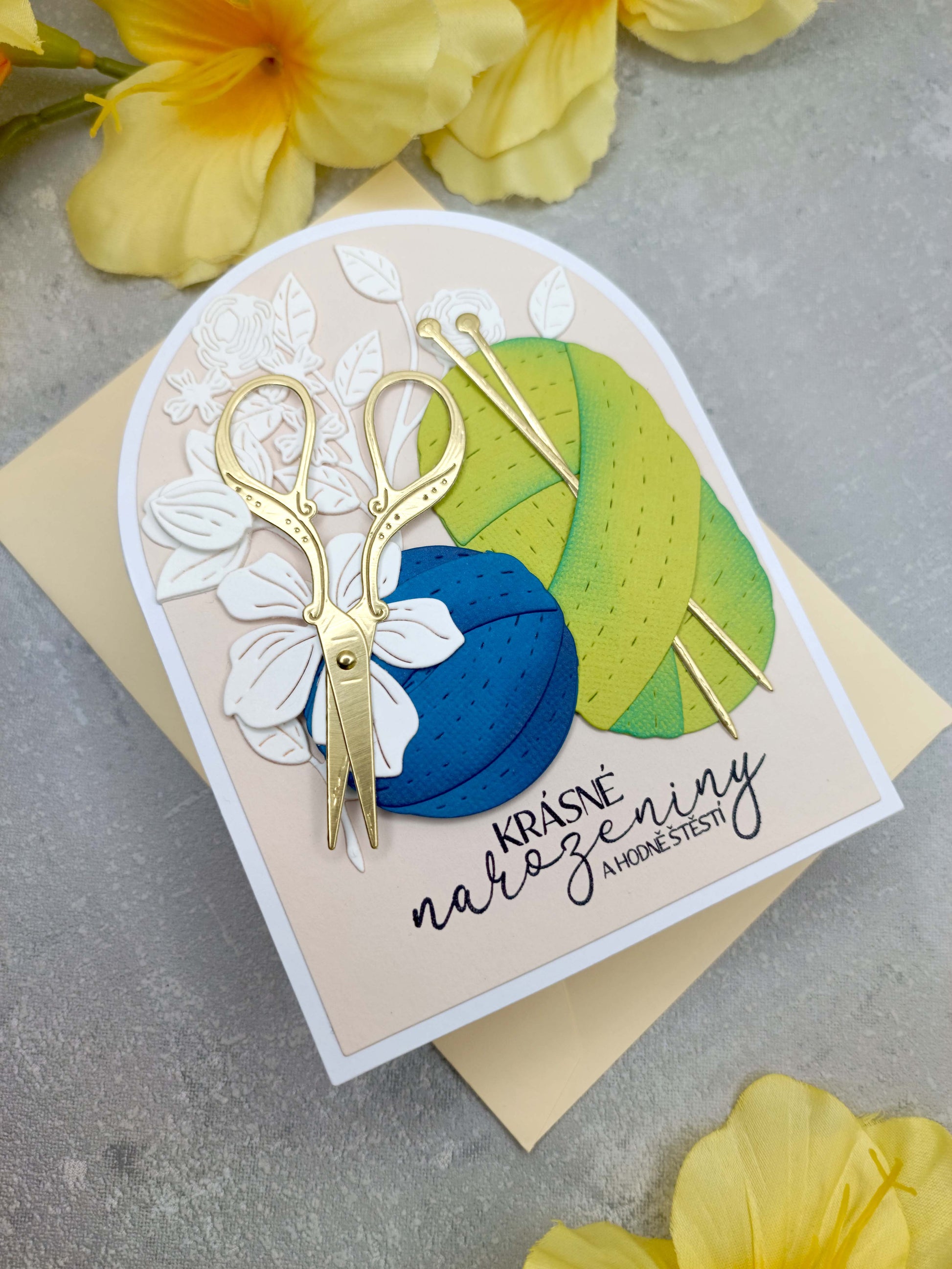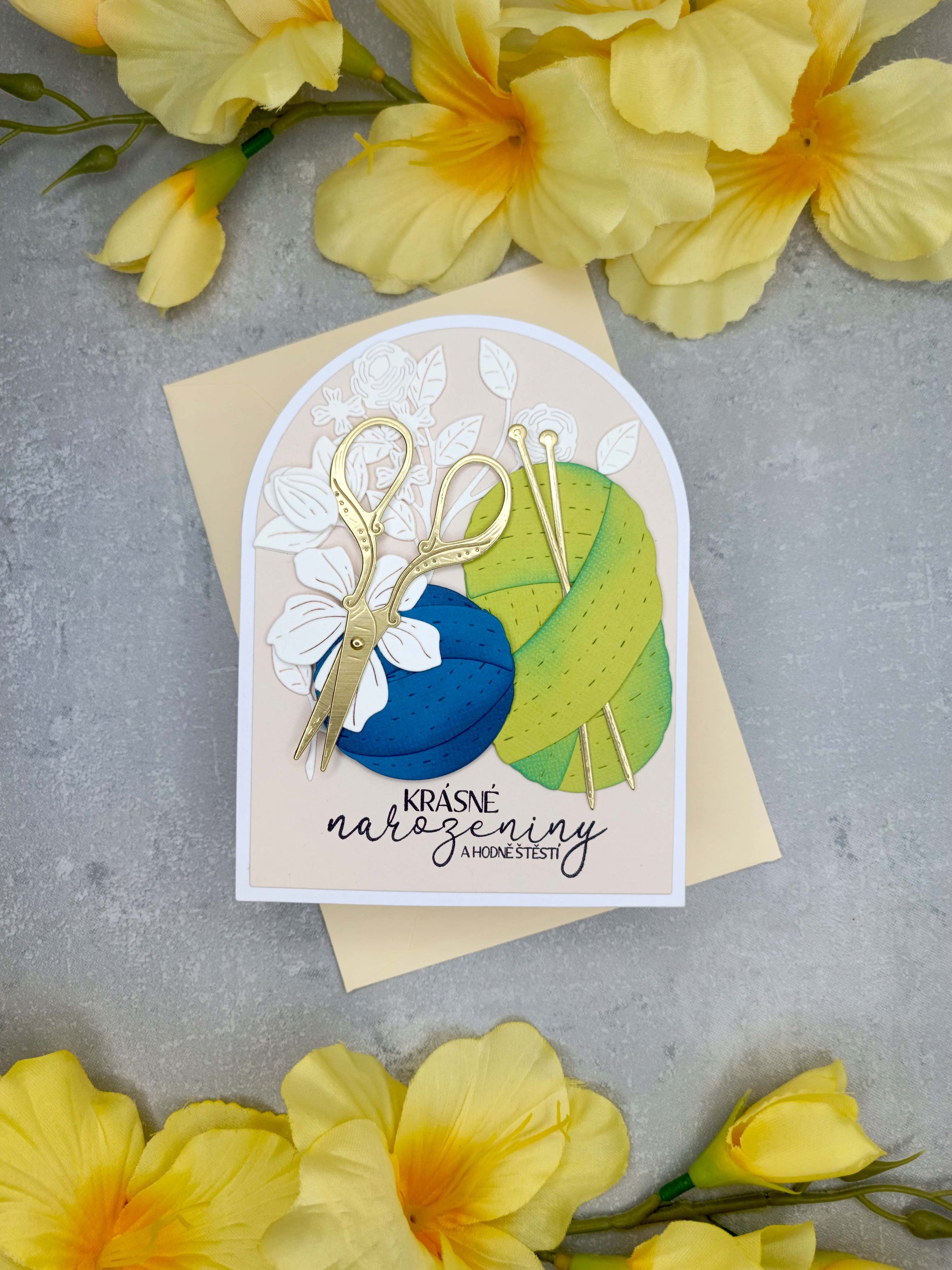 - Přání je v krémové barvě, zdobeno barevnými klubíčky, zlatými nůžkami, se kterými lze hýbat a jehlicemi