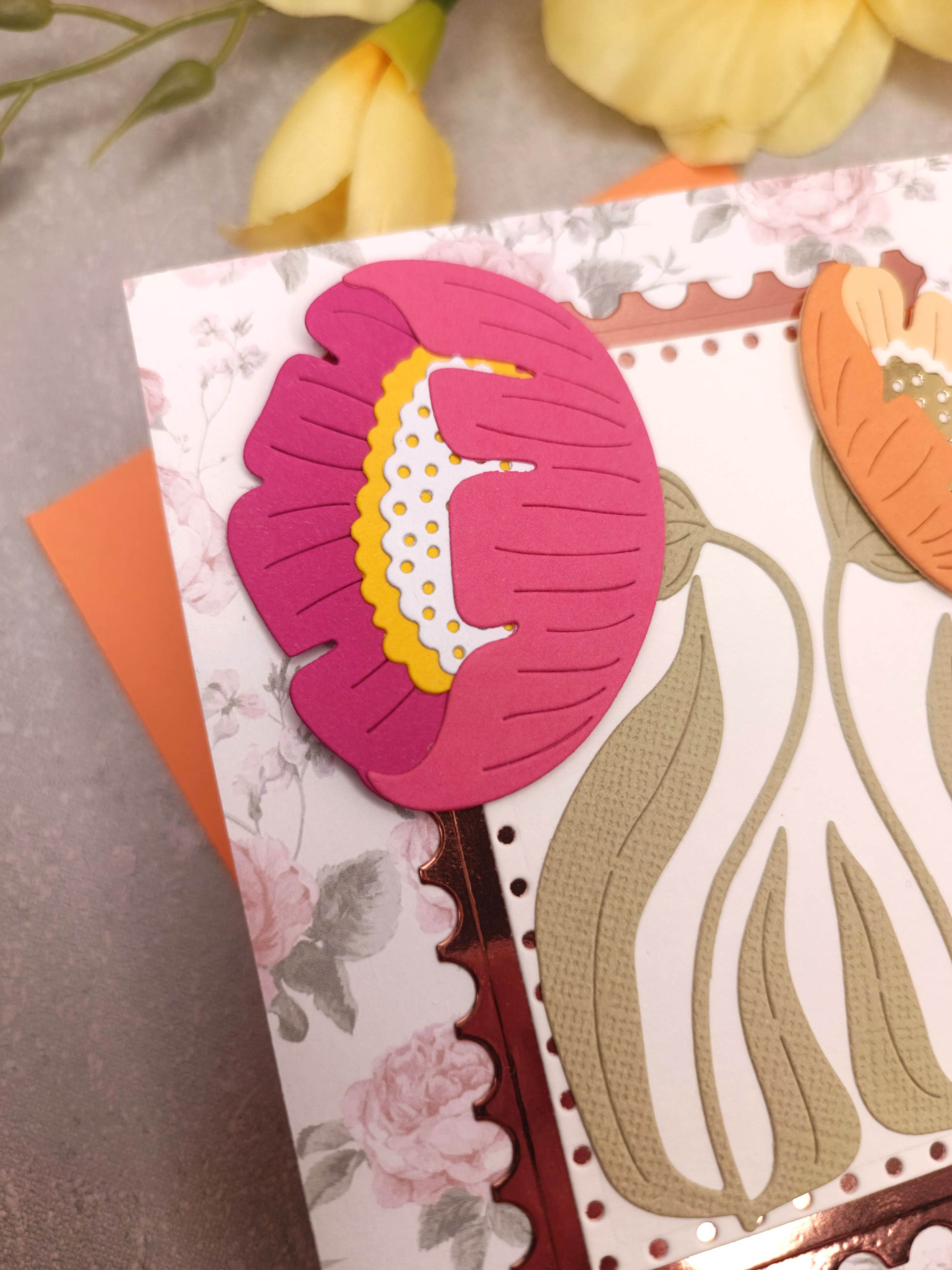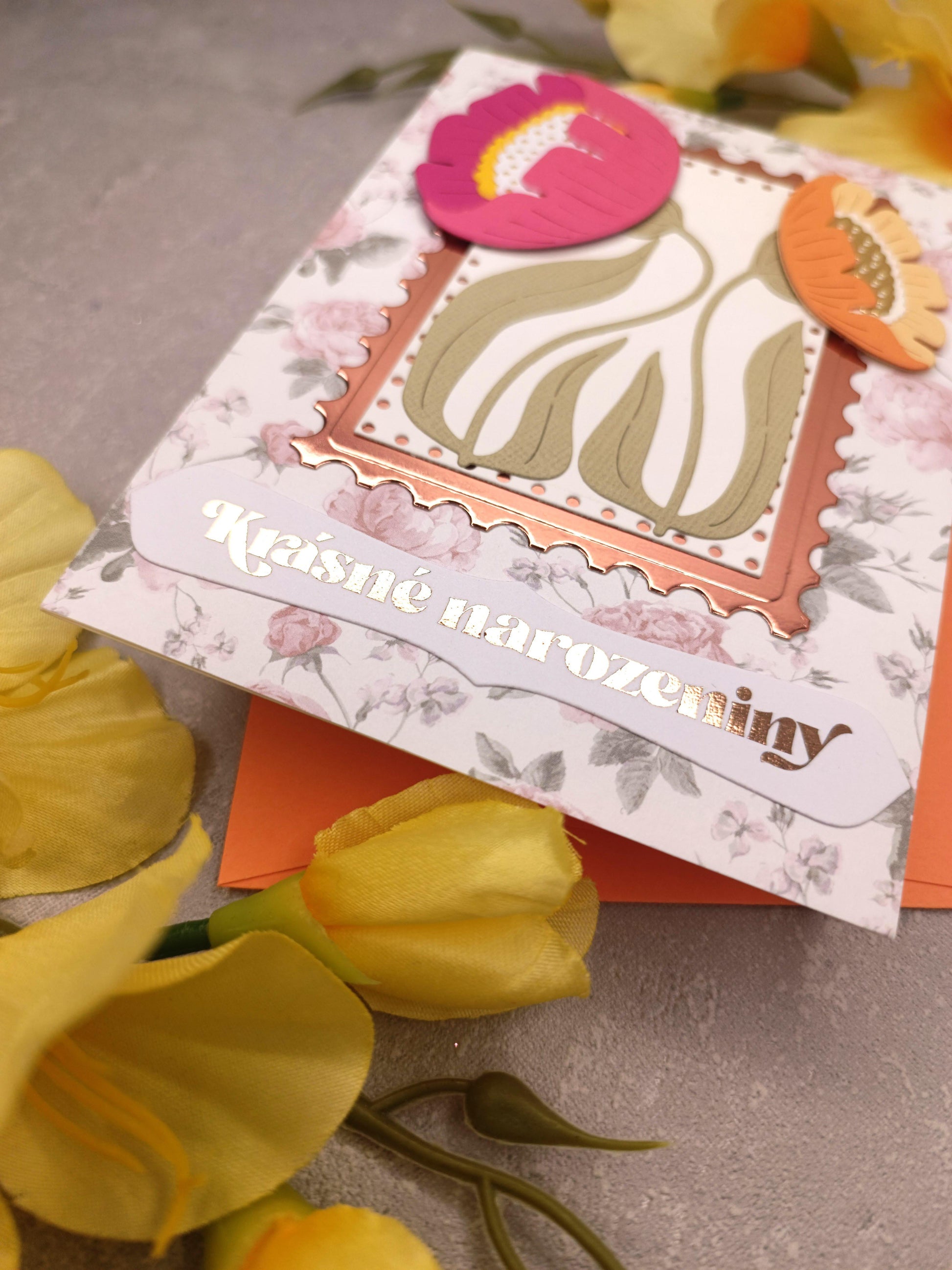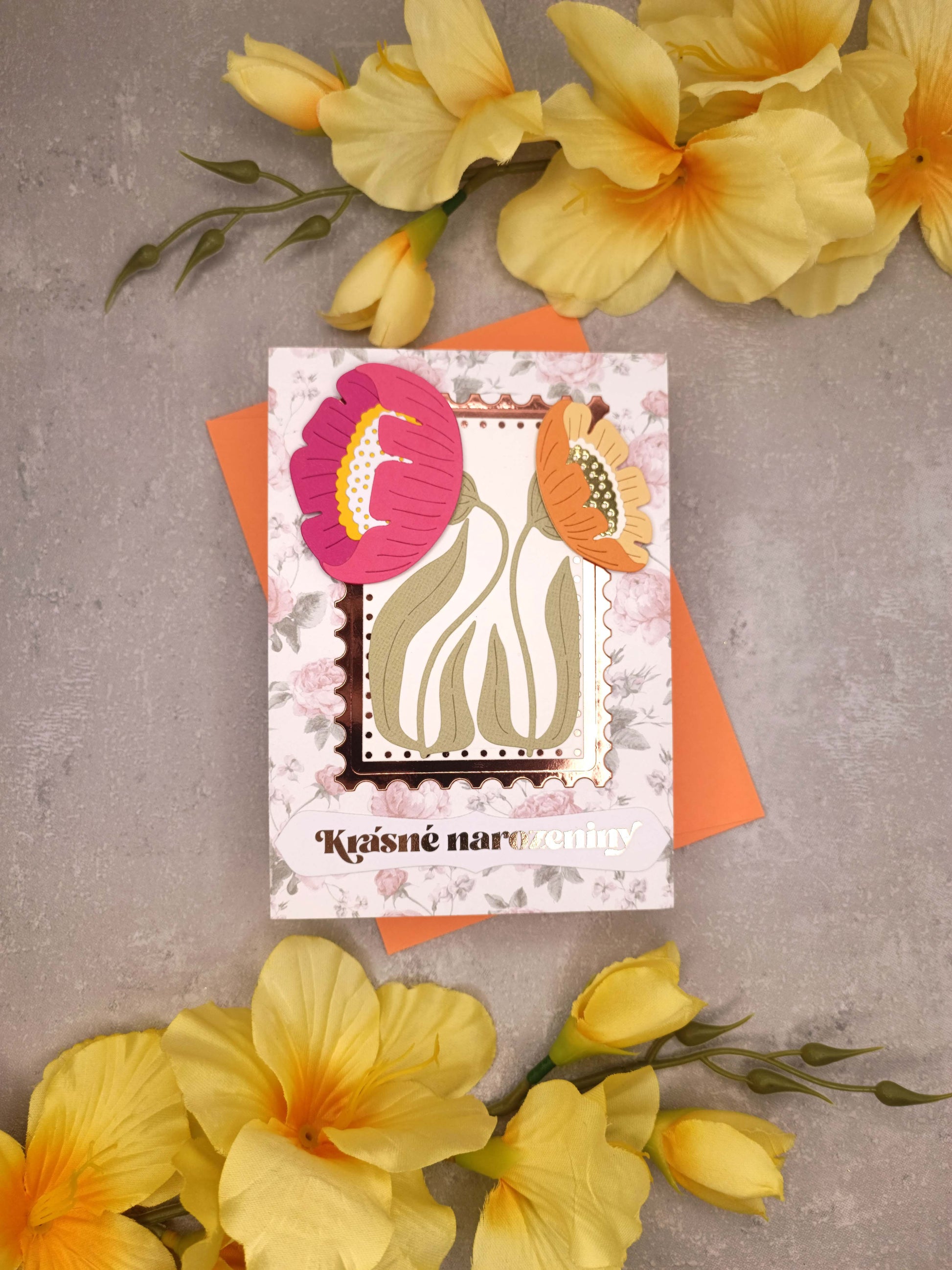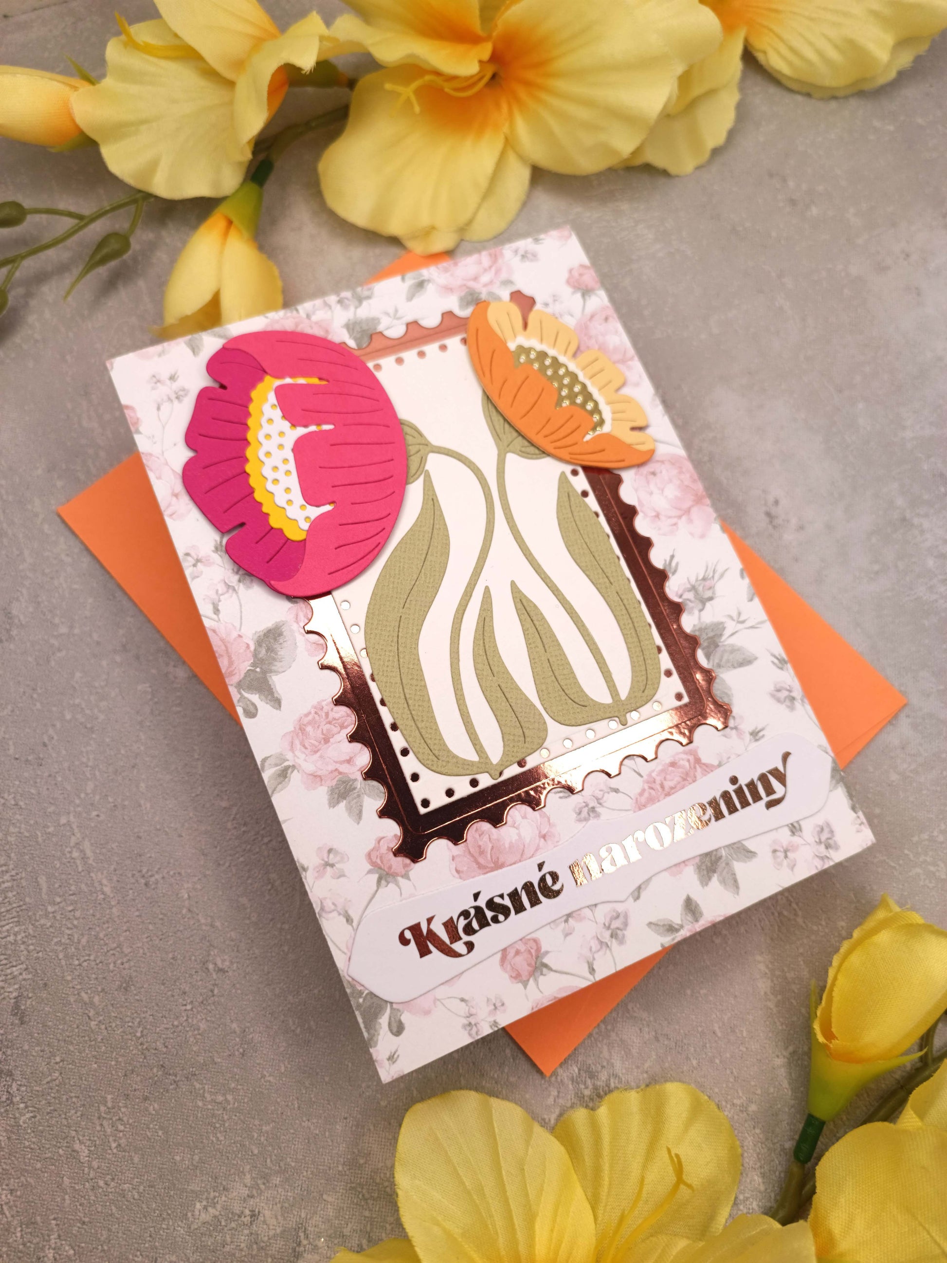 Květinové narozeninové přání se sasankami a oranžovou obálkou