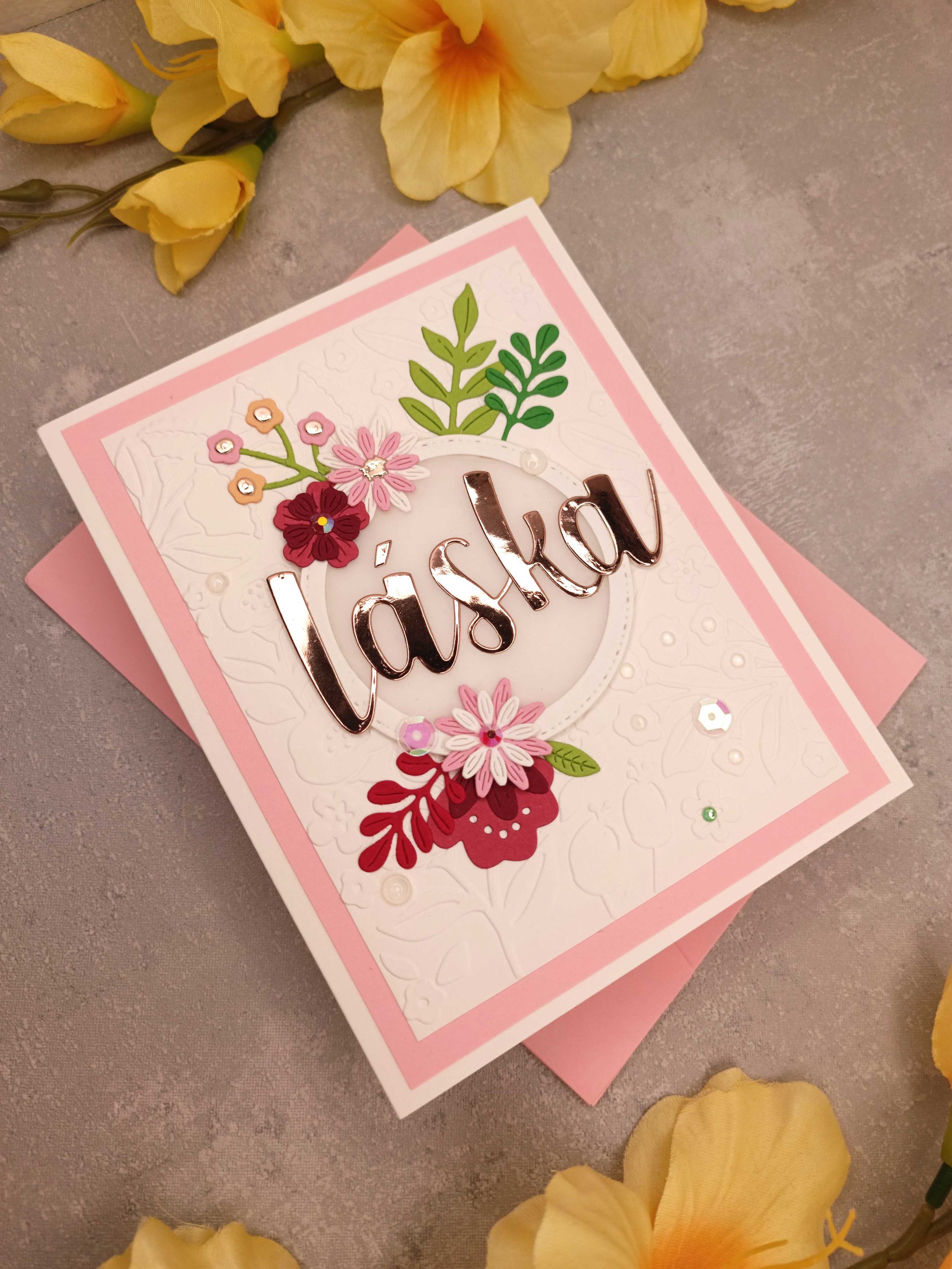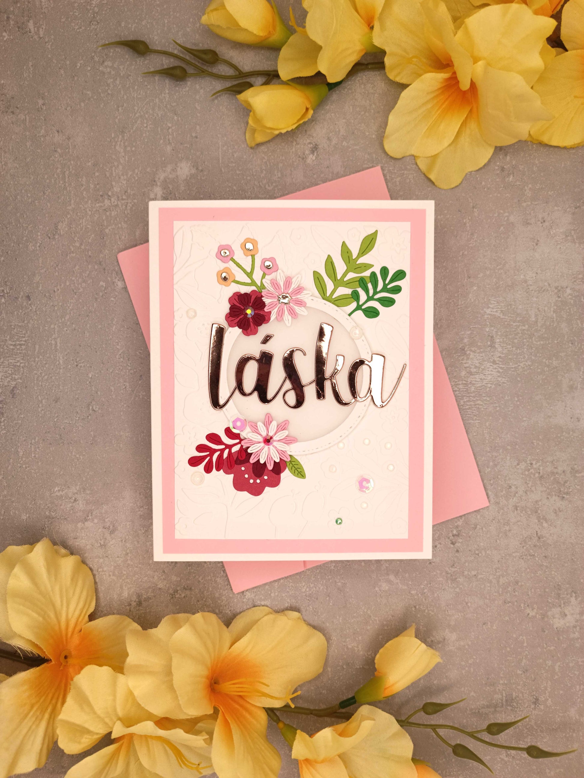 - Přáníčko je zdobeno růžovo-zlatým nápisem láska a růžovým rámečkem