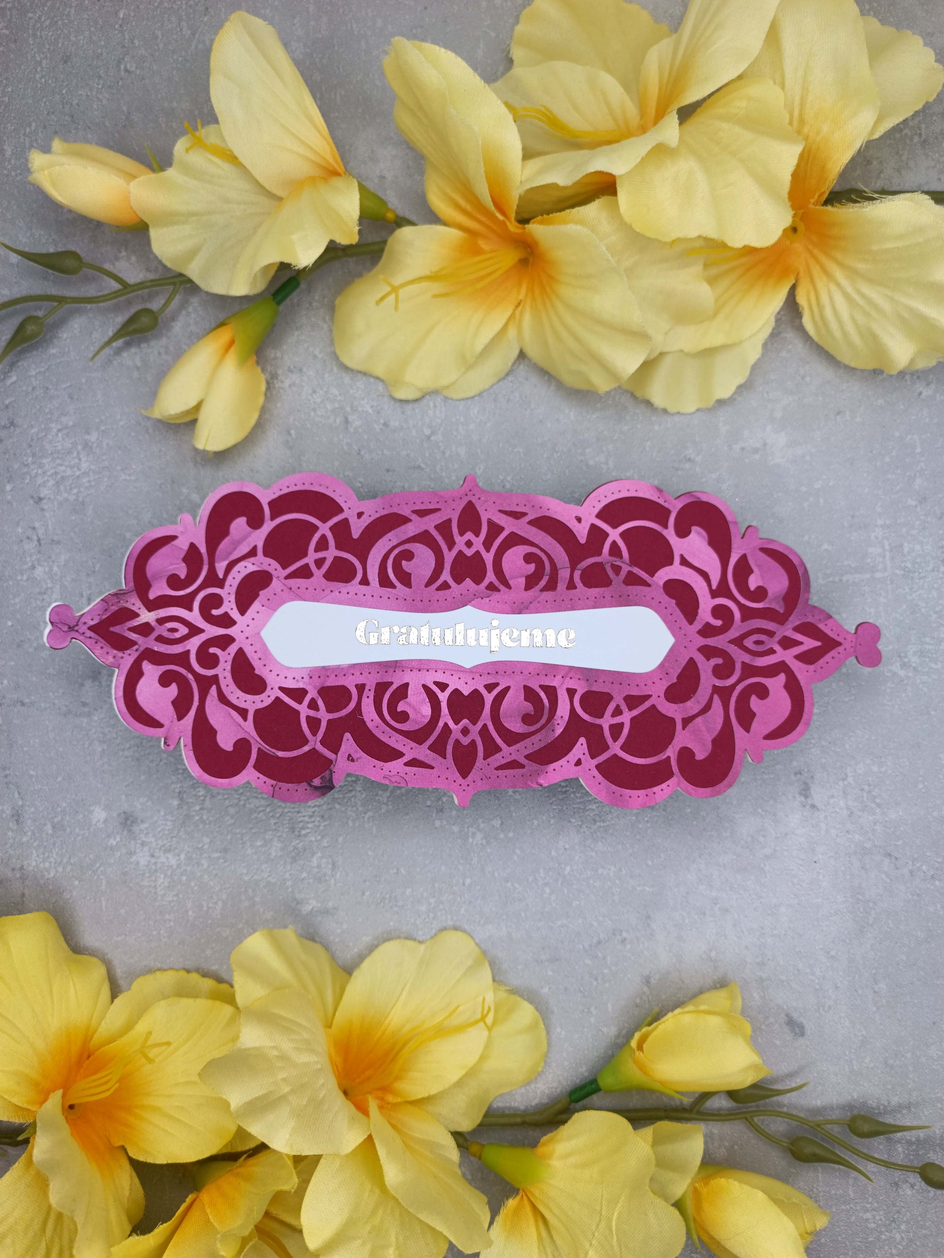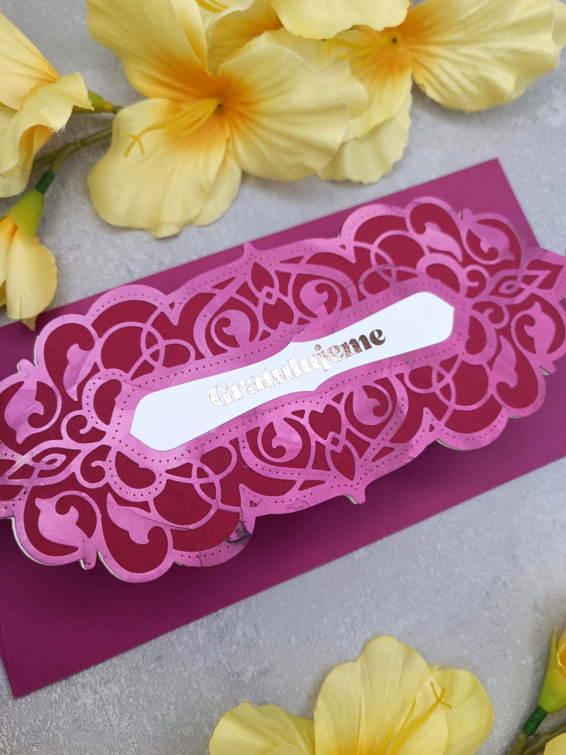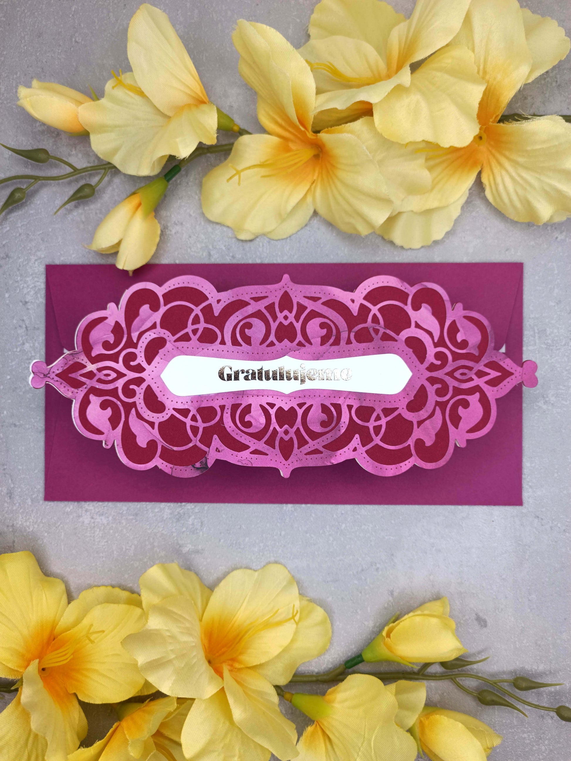 - Přání je laděno do malinovo-vínové barvy a je zdobeno růžovo-zlatým nápisem