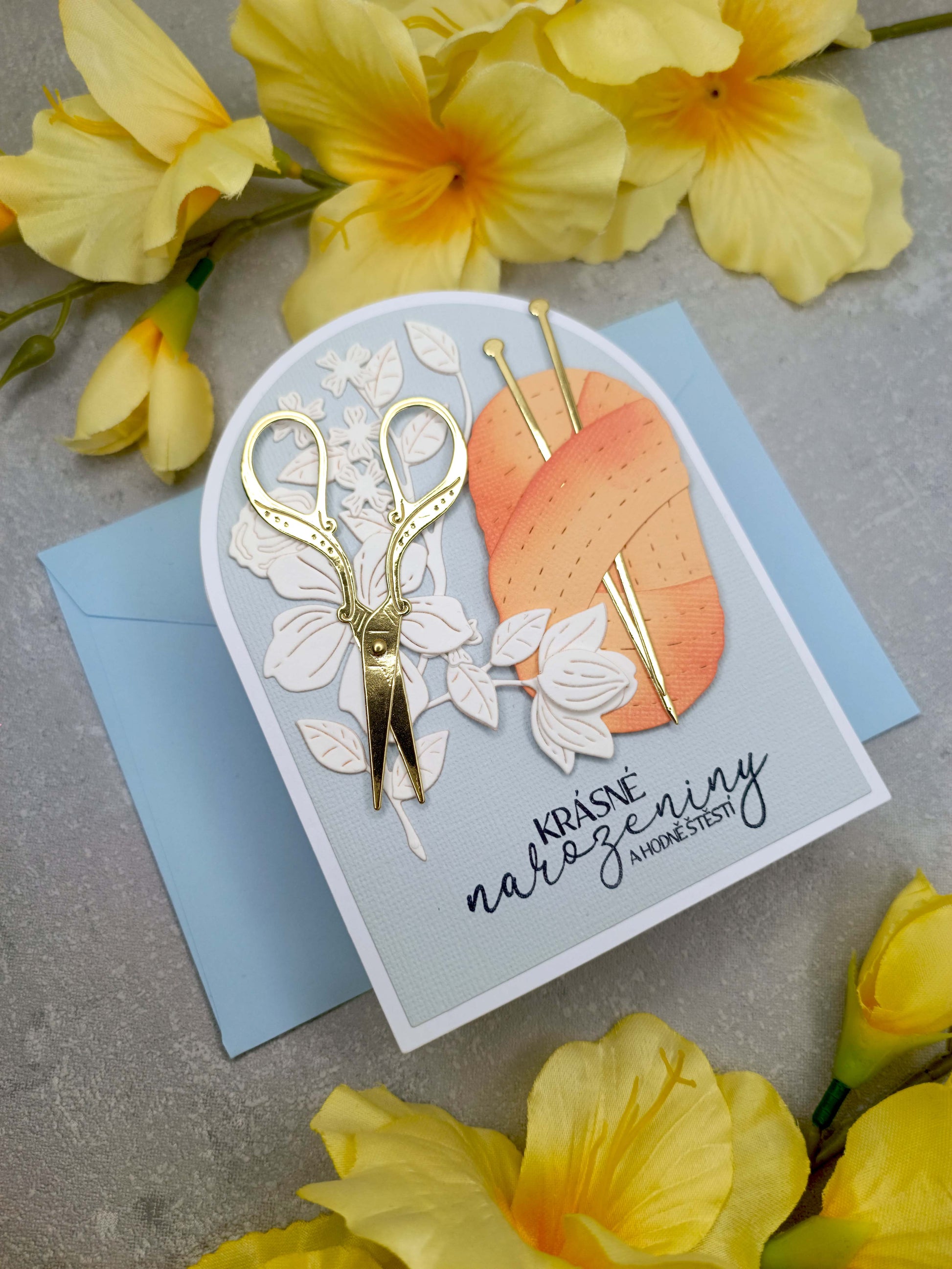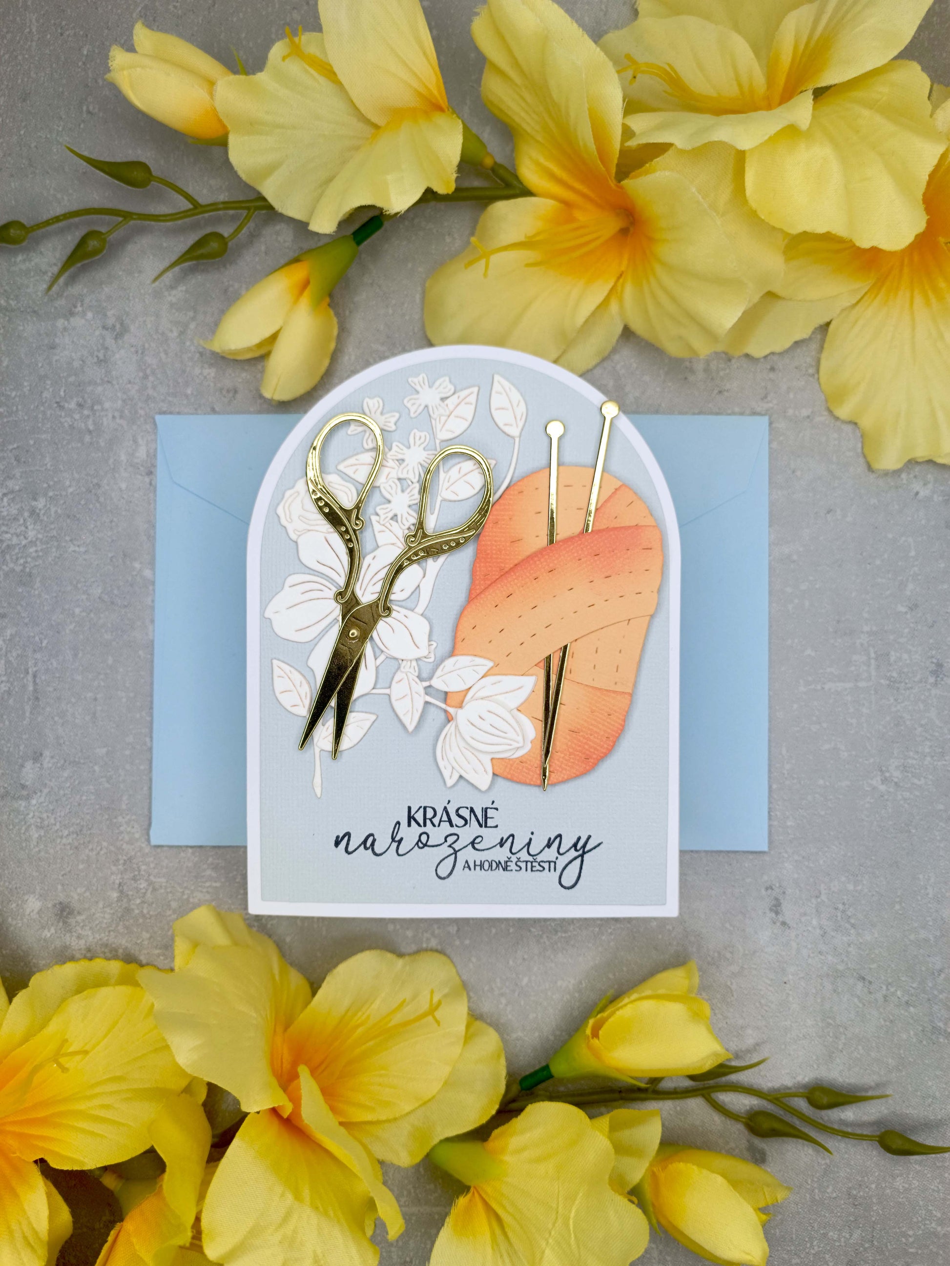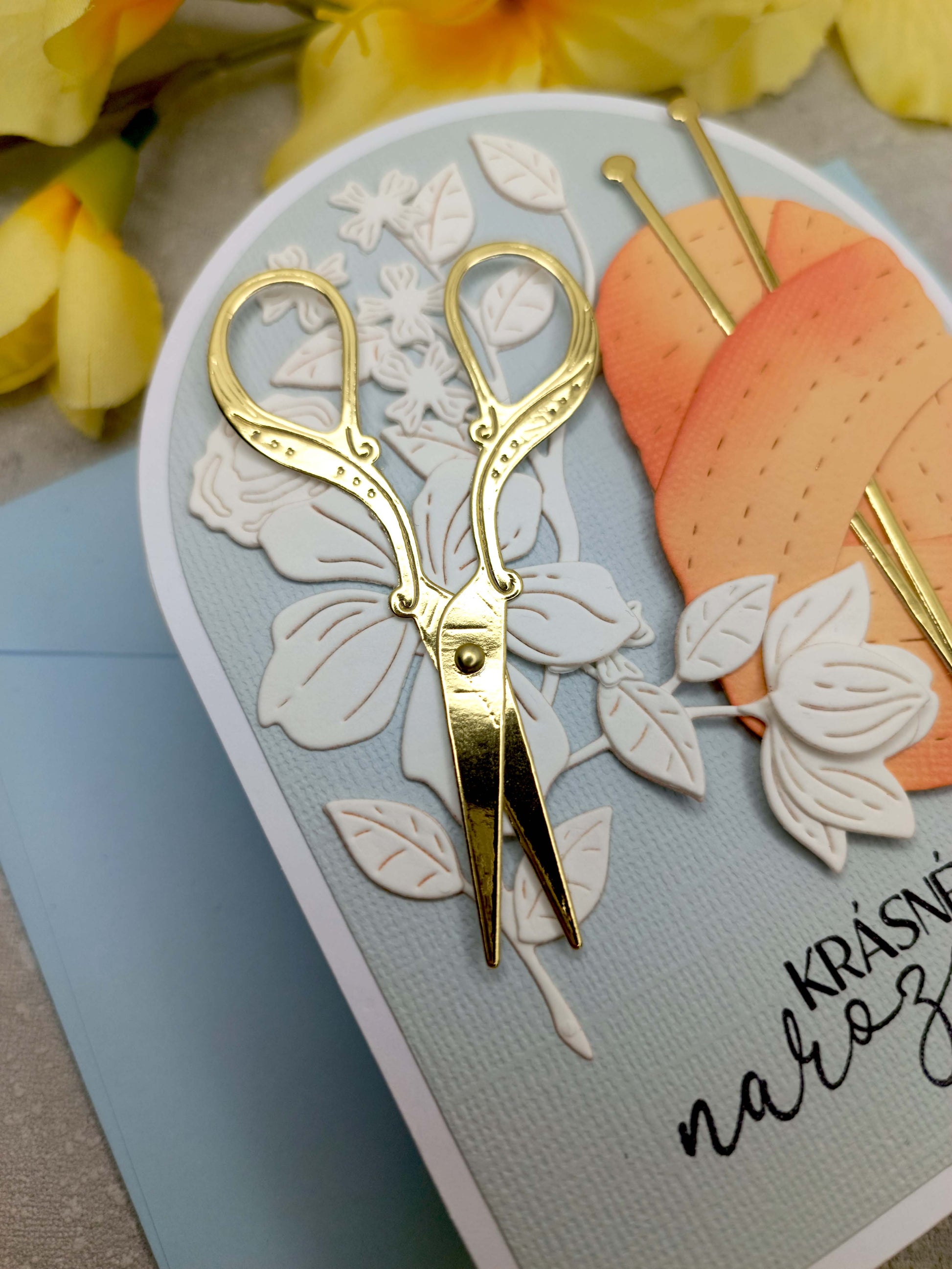 - Přání je ve světle modré barvě, zdobeno barevnými klubíčky, zlatými nůžkami, se kterými lze hýbat a jehlicemi