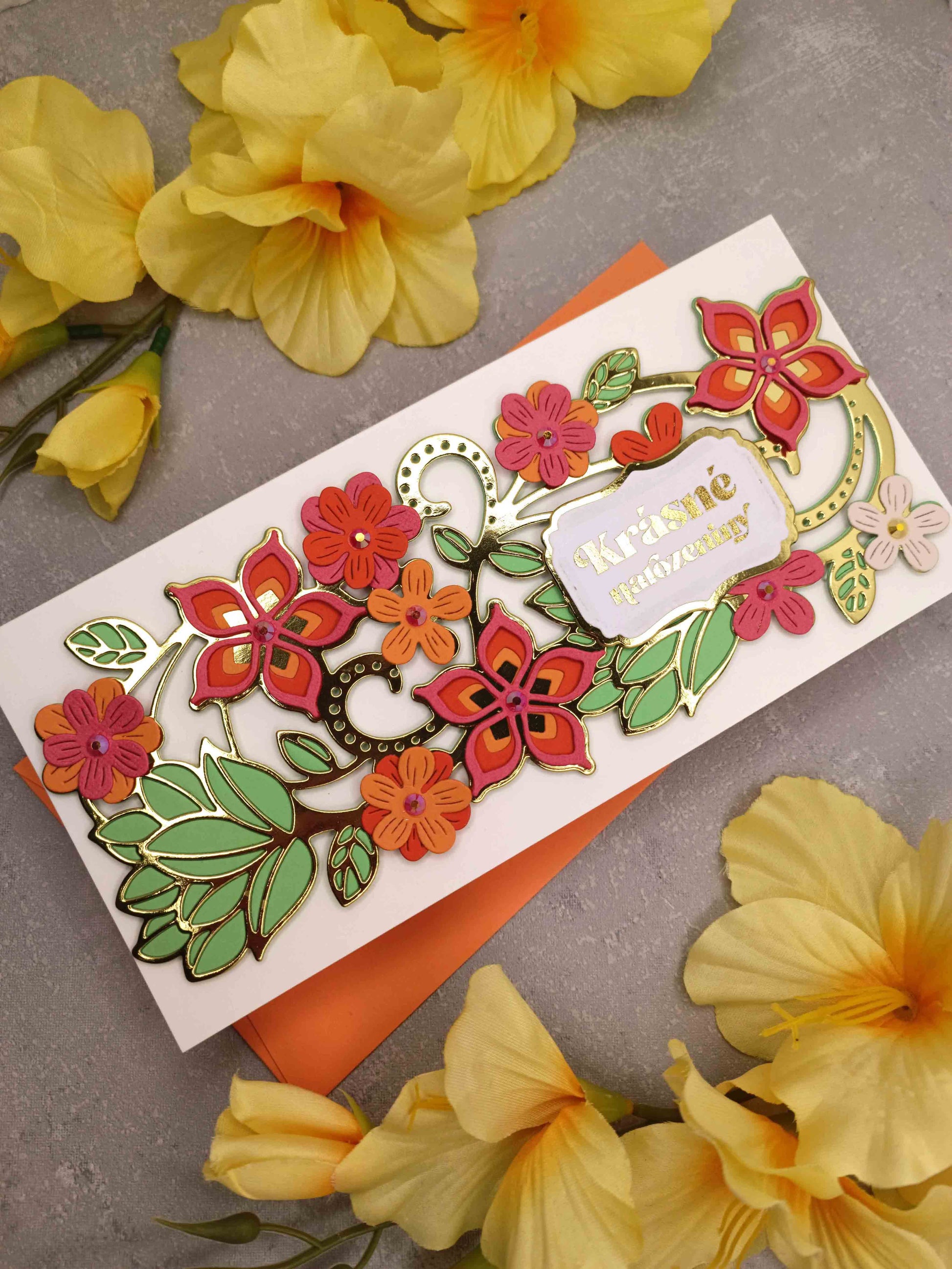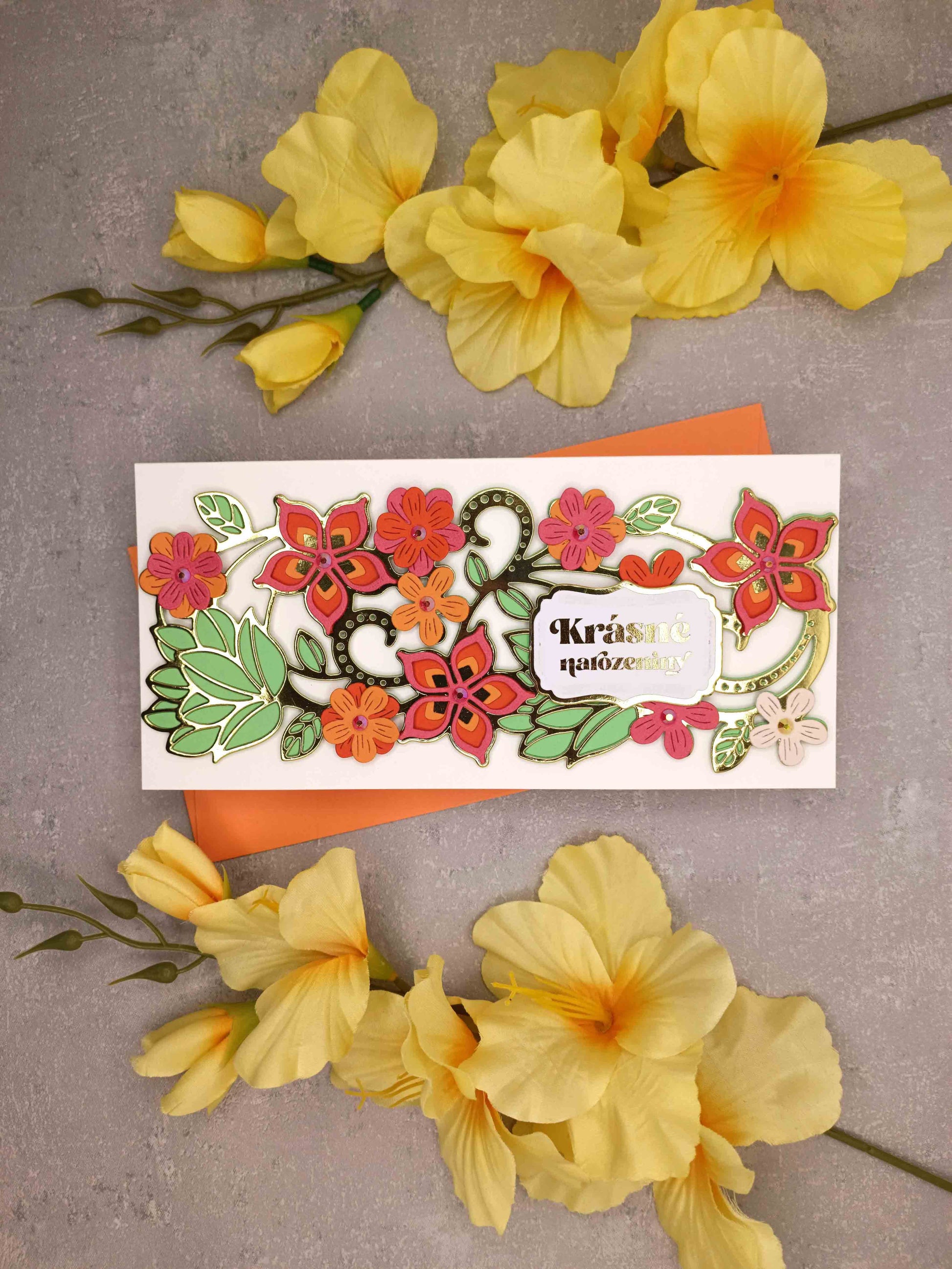 - Přání je podlouhlého tvaru s bílým podkladem s oranžovo zlatými květinami a zlatým nápisem