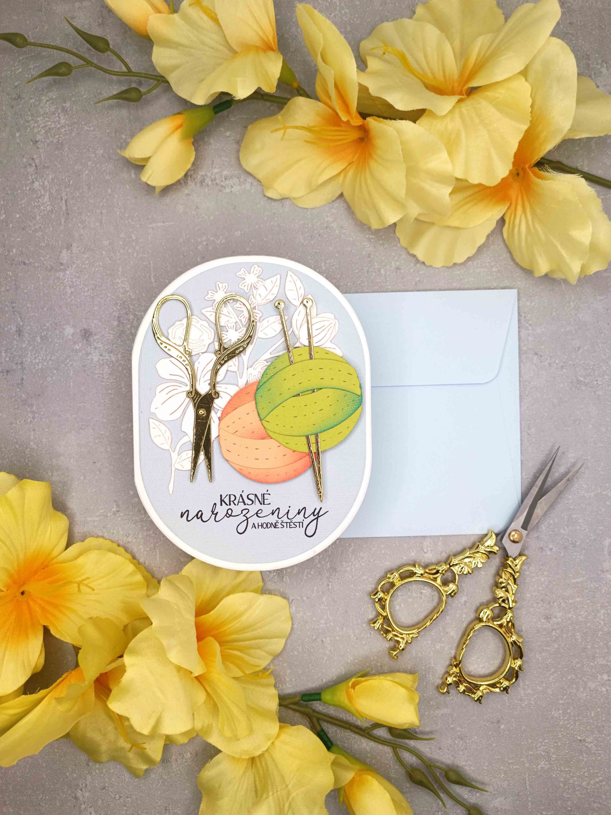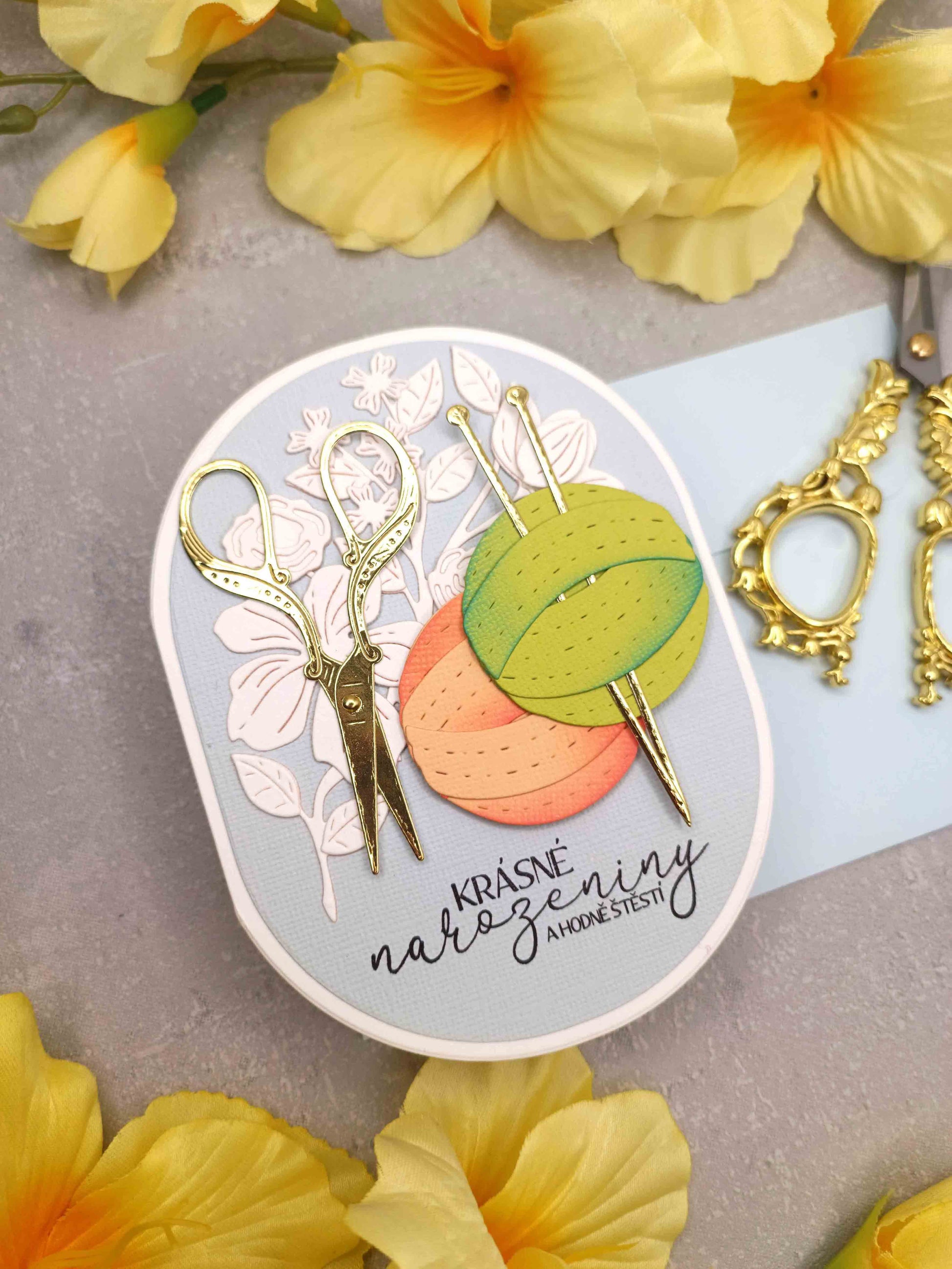 - Přání je v pastelově modré barvě, zdobeno barevnými klubíčky, zlatými nůžkami, se kterými lze hýbat a jehlicemi