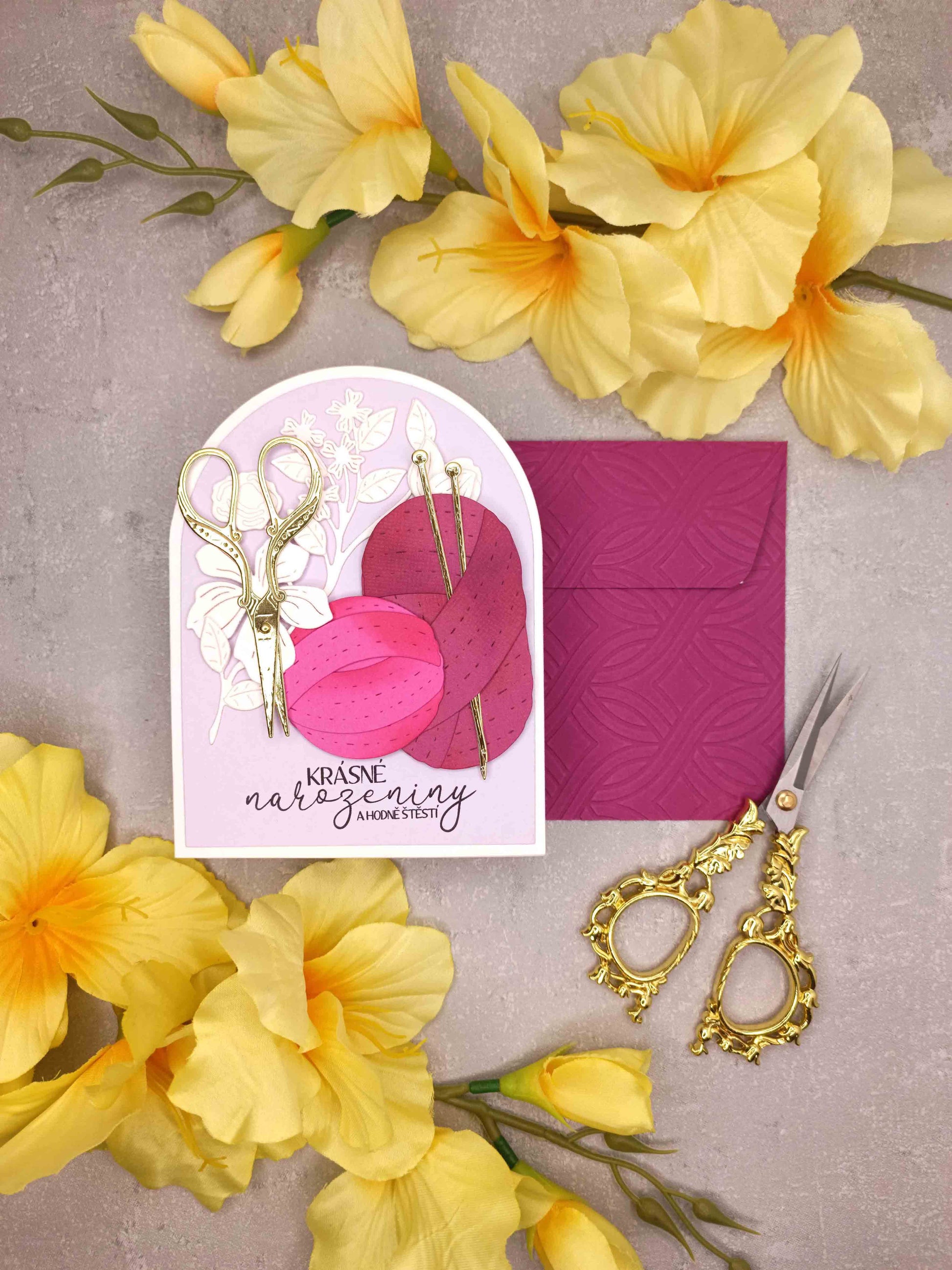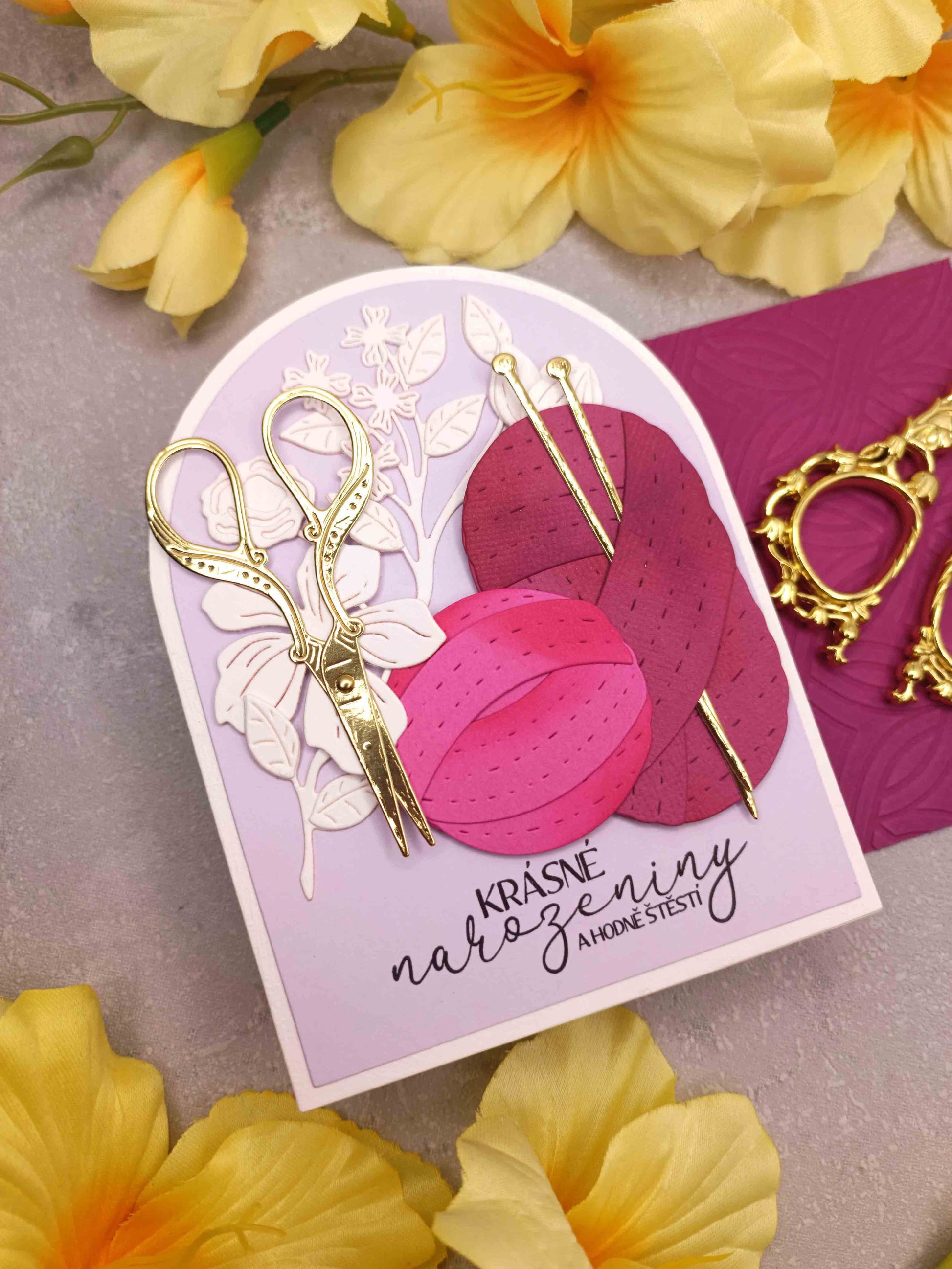 - Přání je v pastelově fialové barvě, zdobeno barevnými klubíčky, zlatými nůžkami, se kterými lze hýbat a jehlicemi