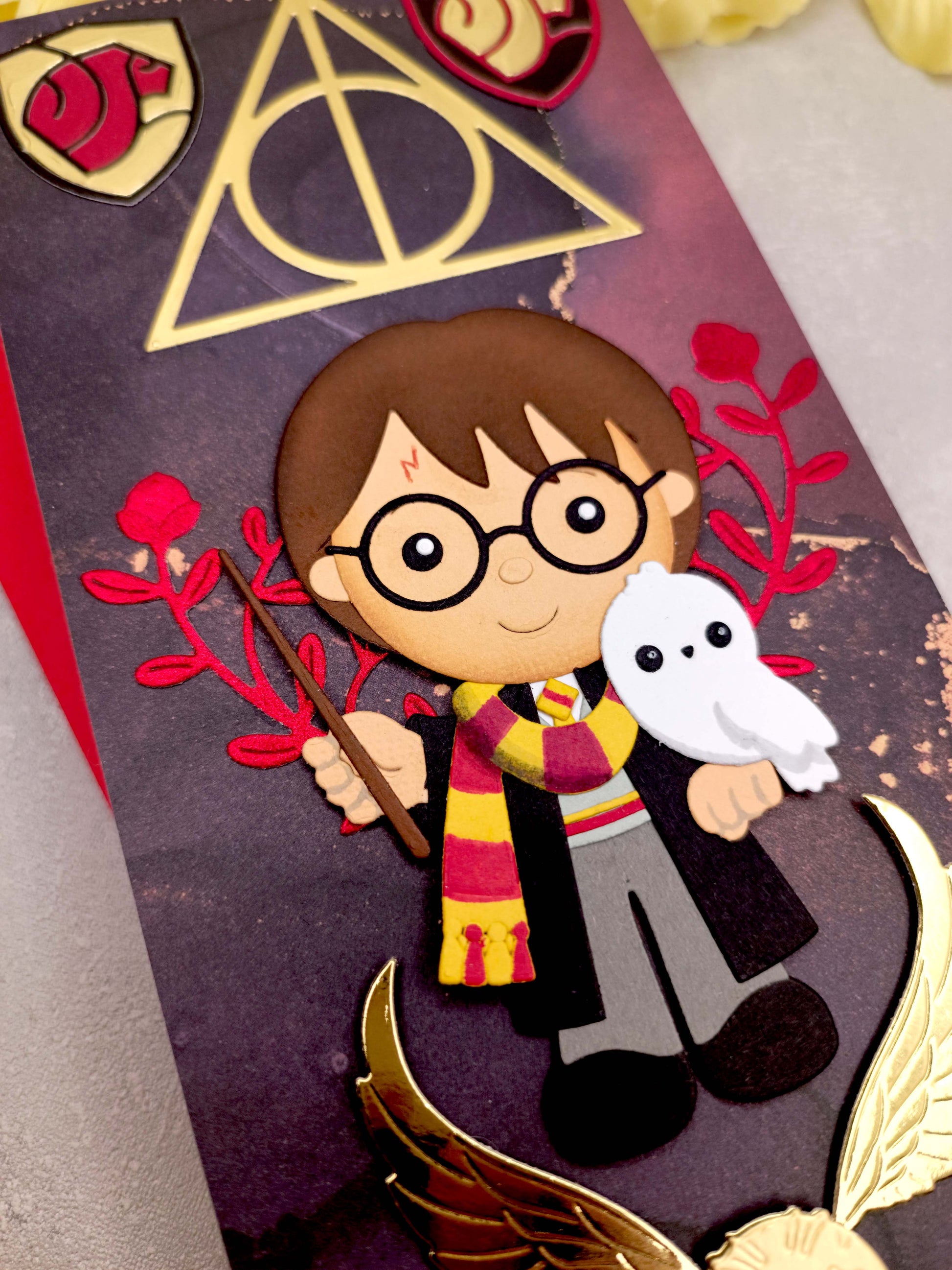 Vítejte v kouzelném světě! Toto ručně vyrobené přání s motivem Harryho Pottera je dokonalým dárkem pro všechny fanoušky čarodějnického světa.