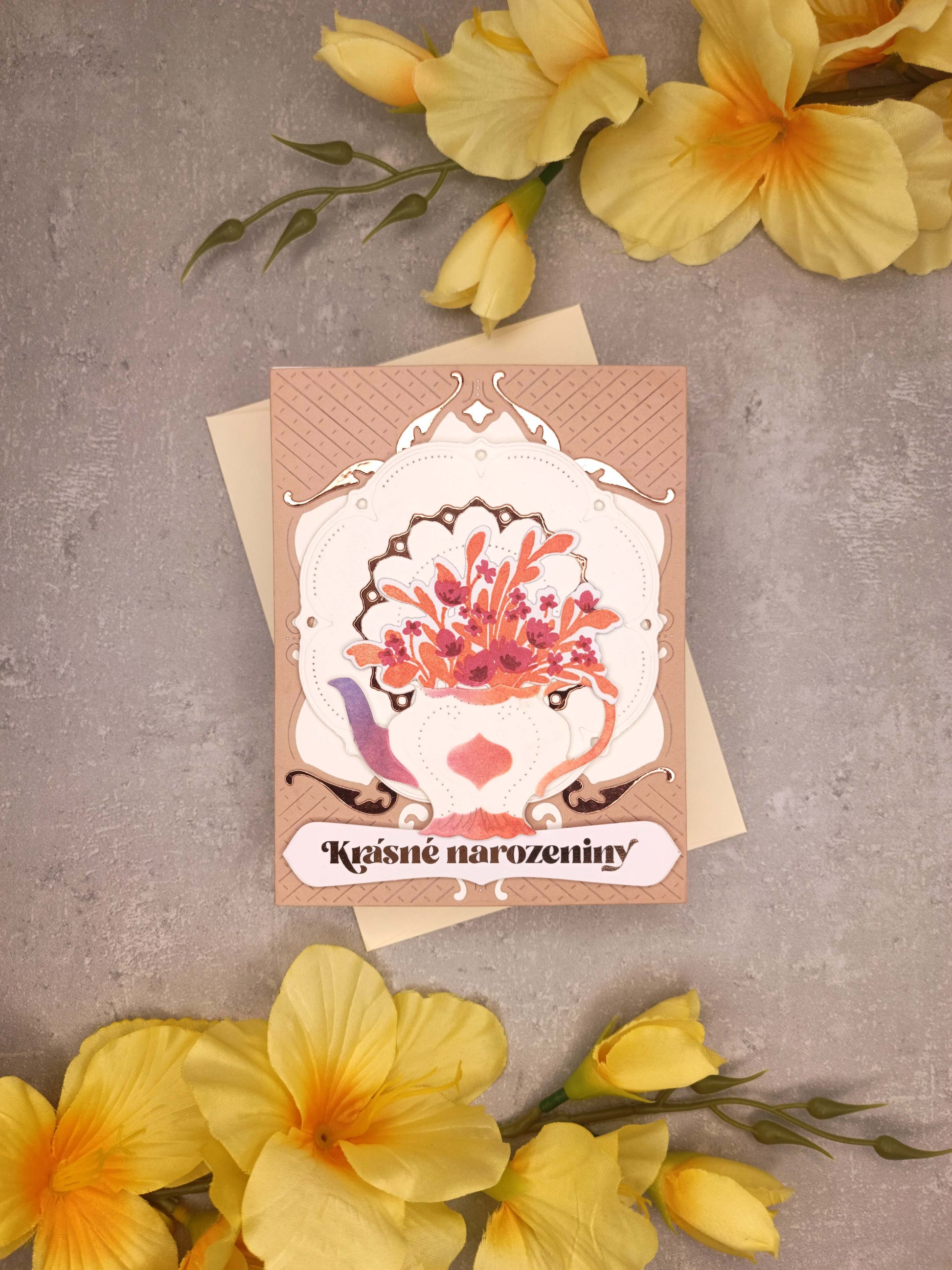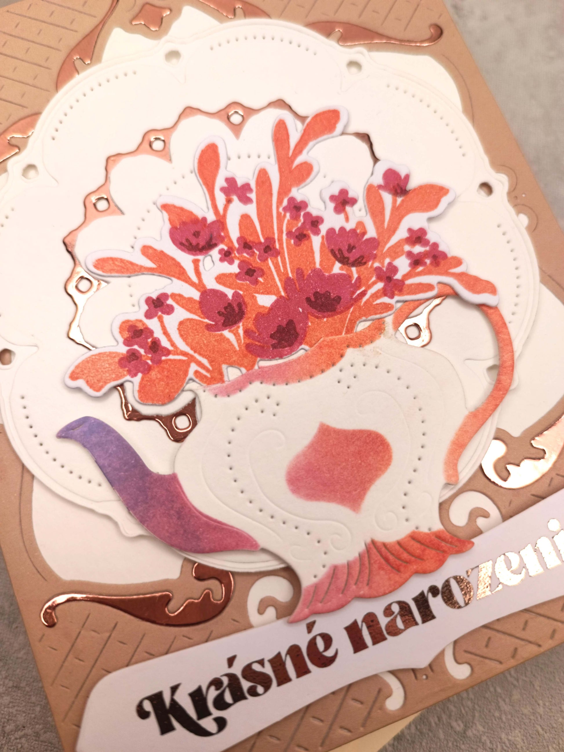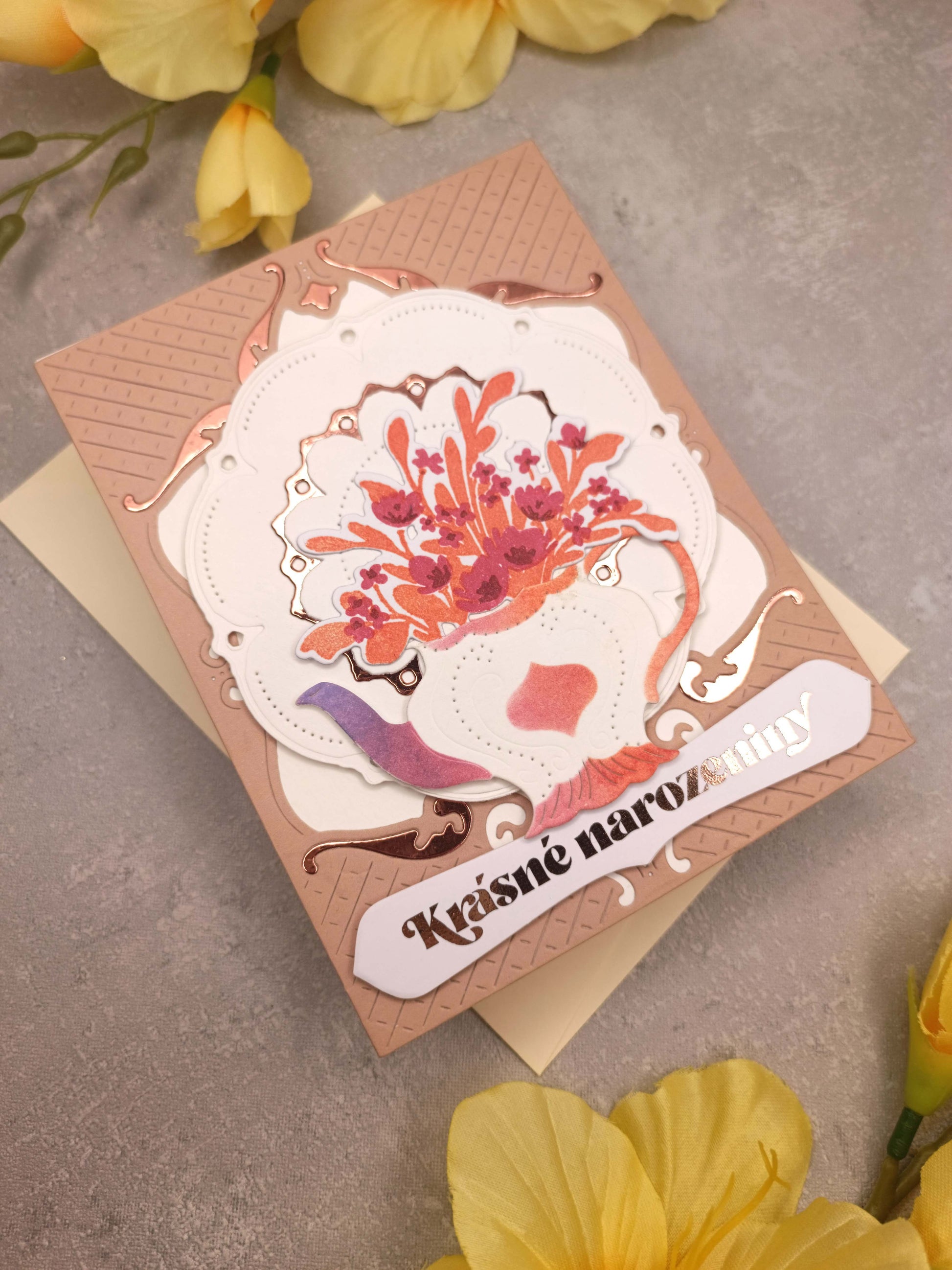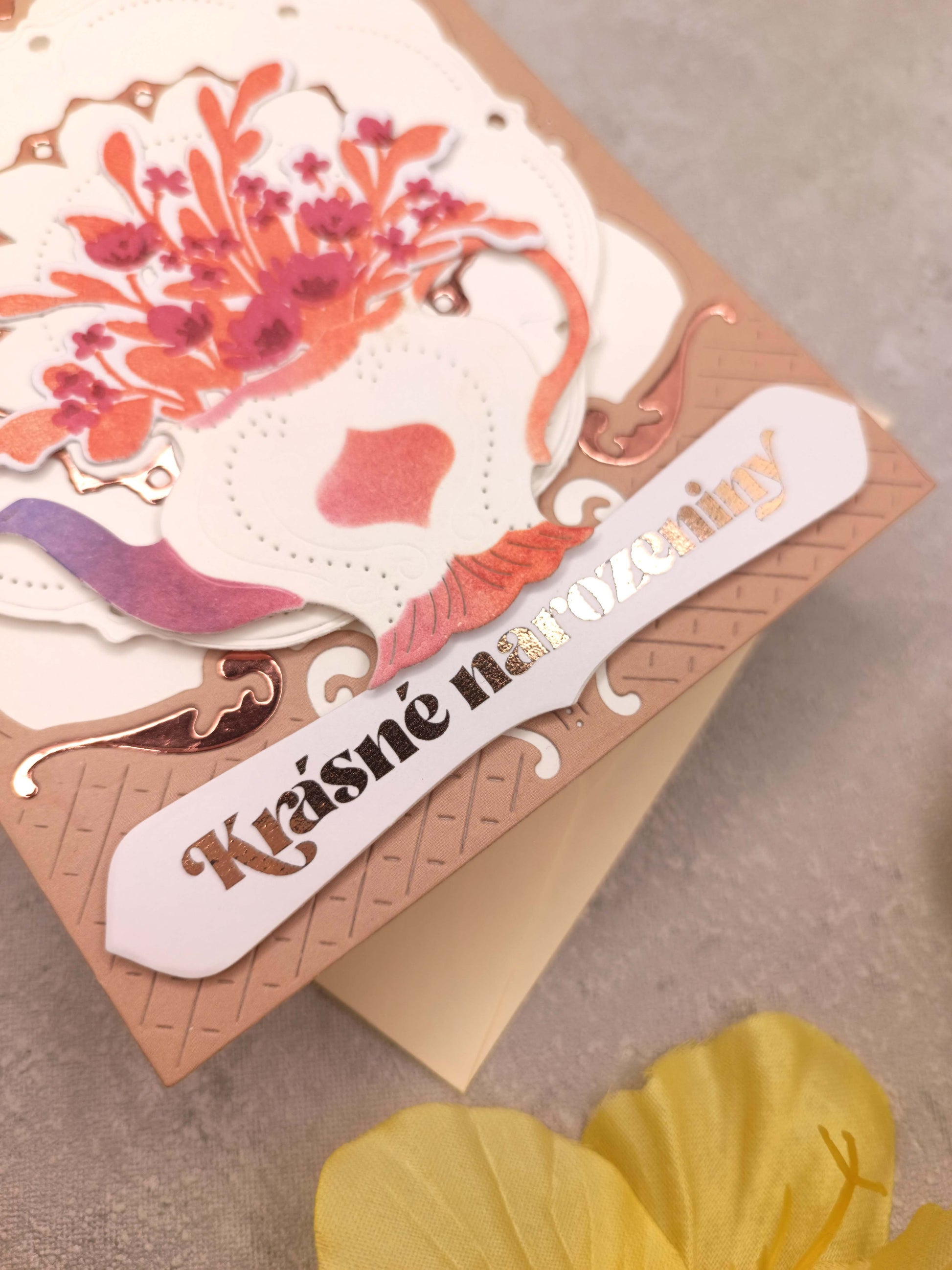 - Přáníčko je zdobeno růžovo-zlatými elementy a růžovo-zlatým nápisem