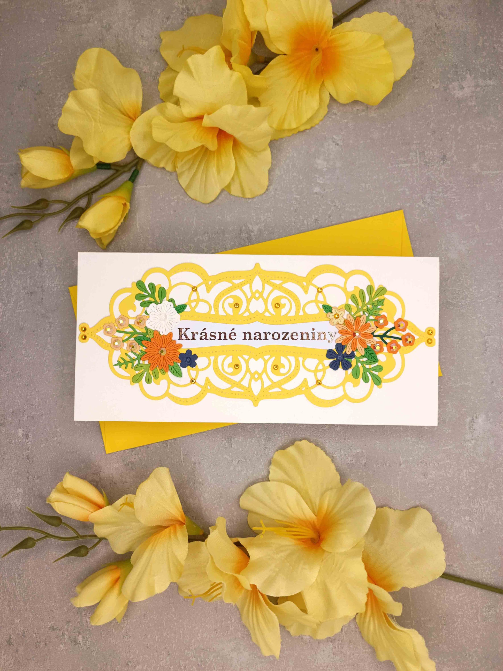 - Přání je podlouhlého tvaru s bílým podkladem, žlutým elementem připomínající krajku, květinami a zlatým nápisem (rose gold)