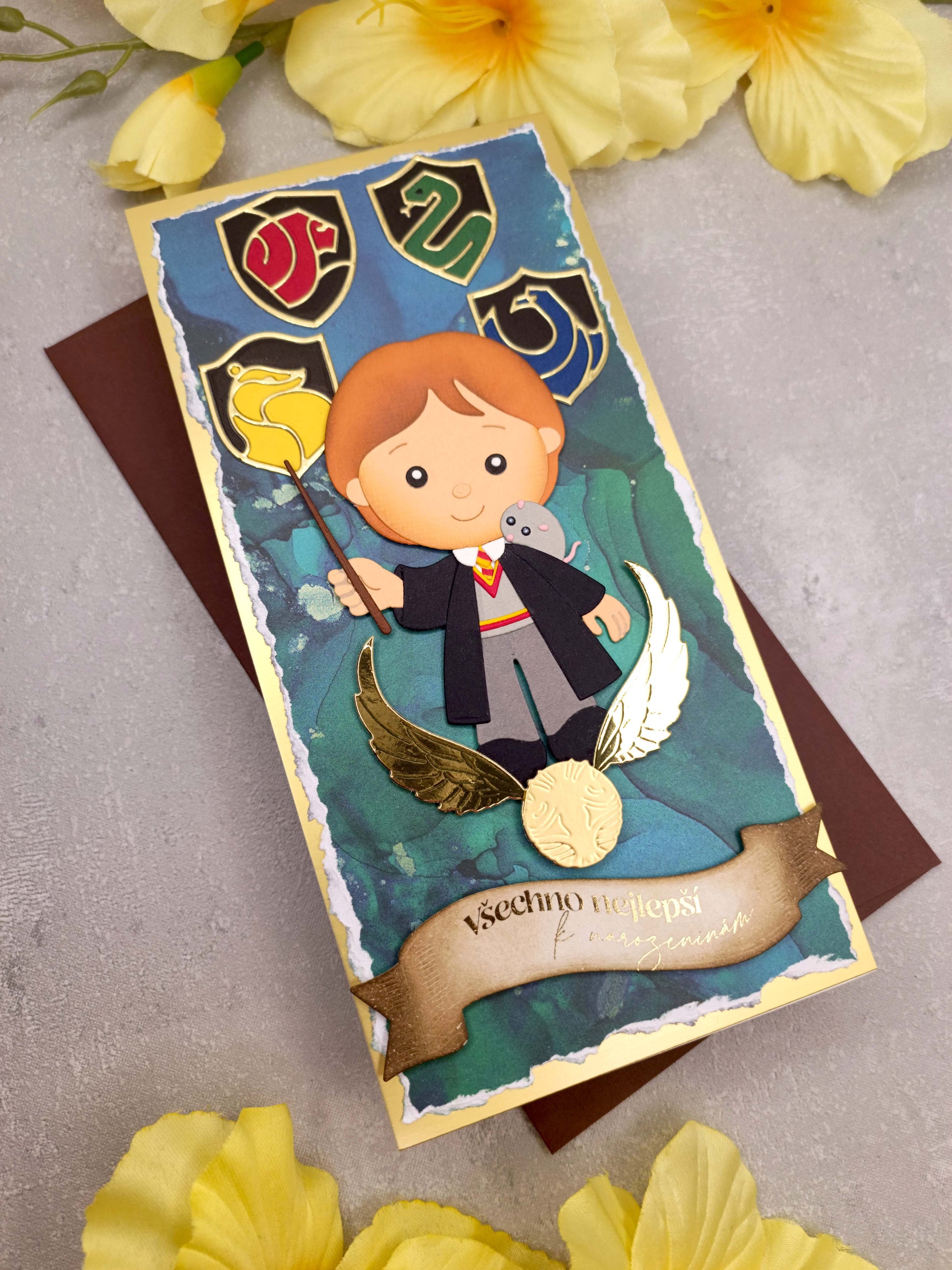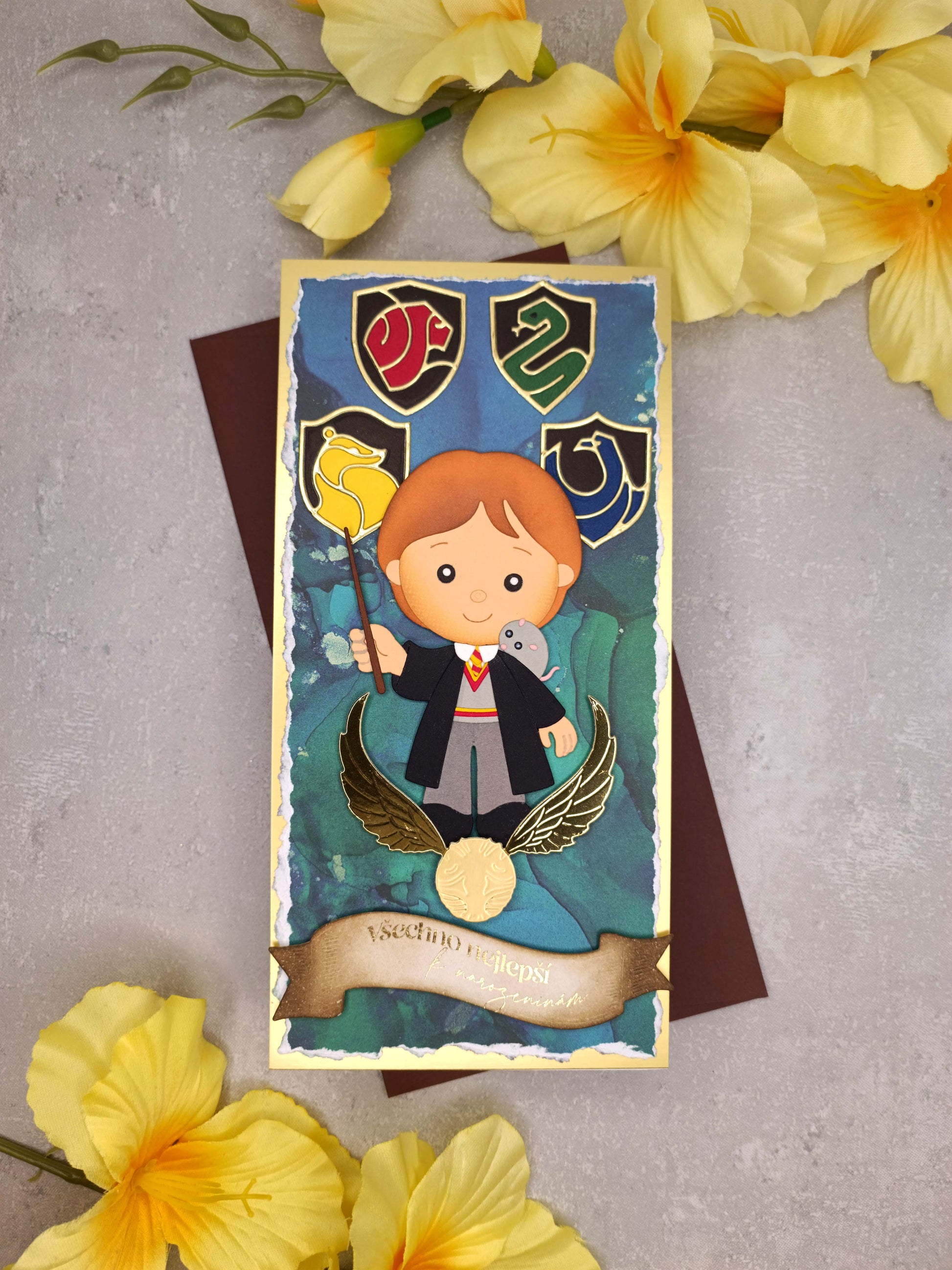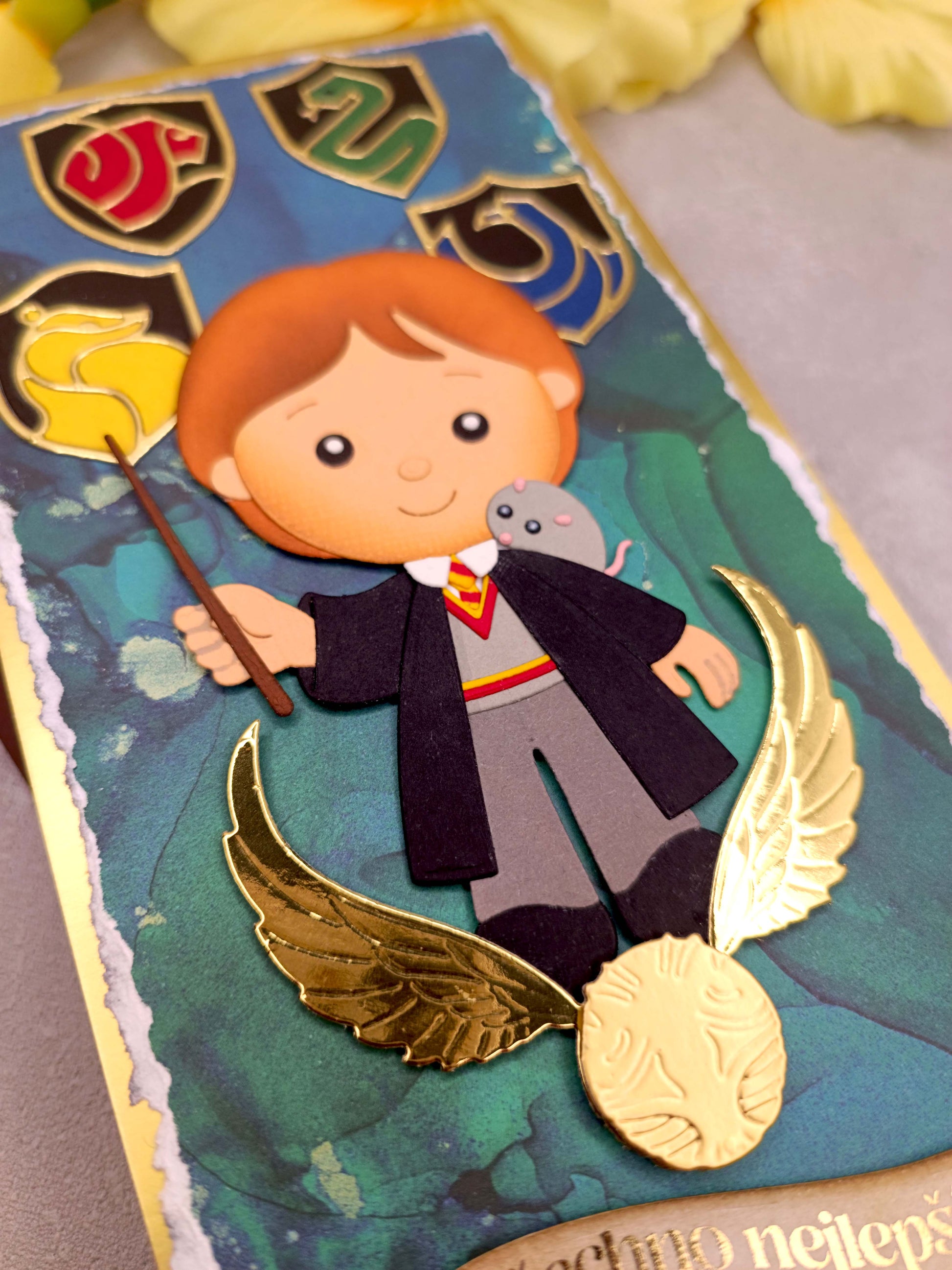 Vítejte v kouzelném světě! Toto ručně vyrobené přání s motivem Harryho Pottera je dokonalým dárkem pro všechny fanoušky čarodějnického světa.