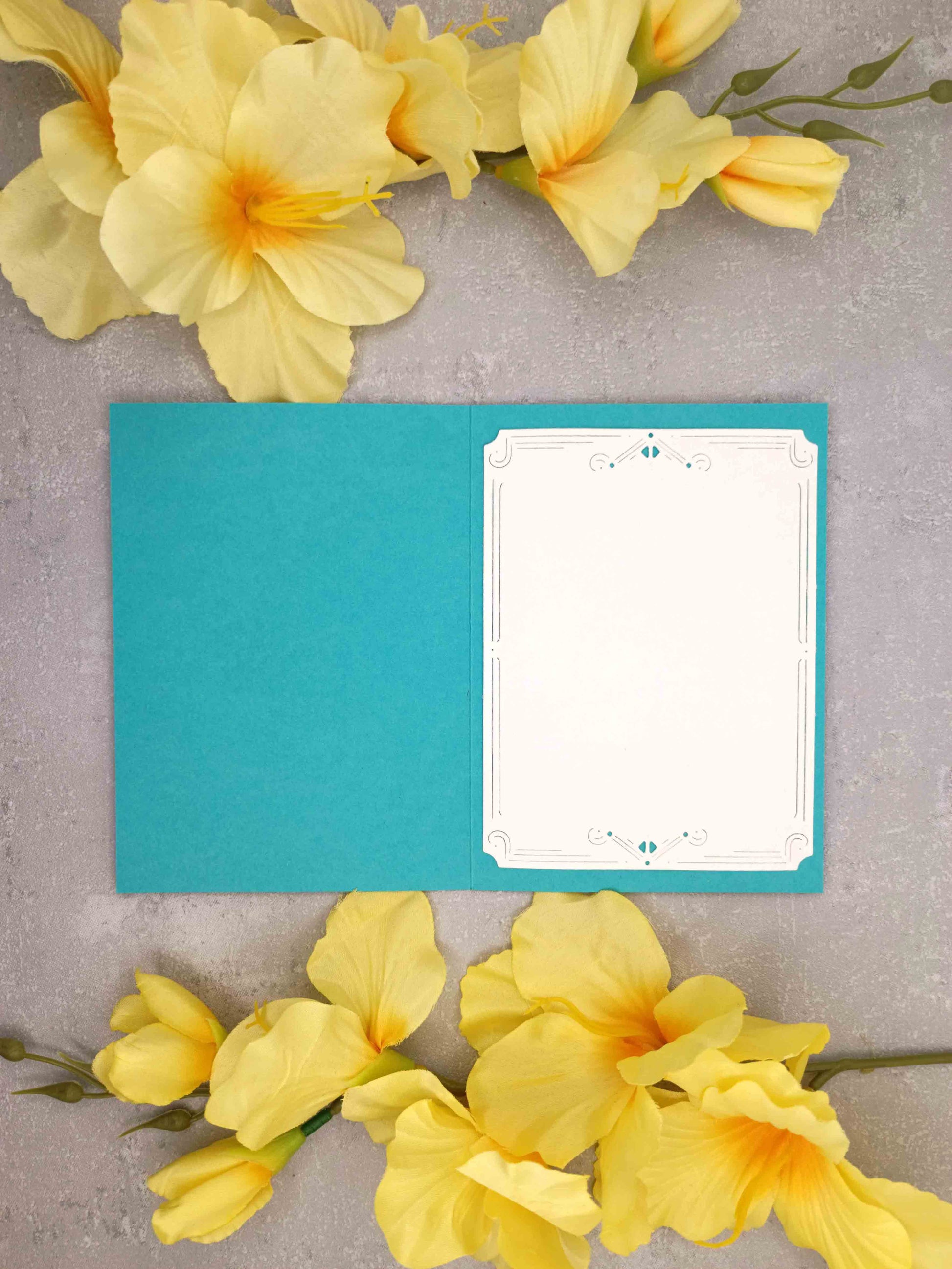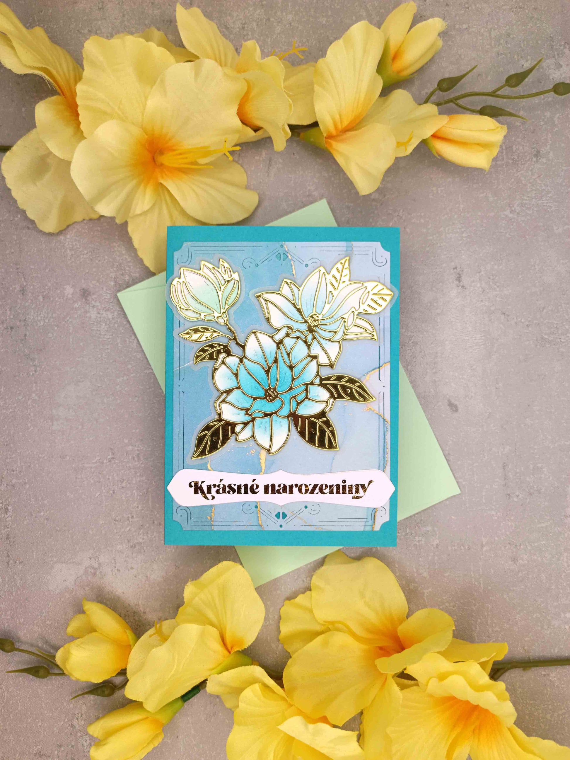 - Přání je zdobeno tyrkysovými magnoliemi se zlatým orámováním a zlatým nápisem