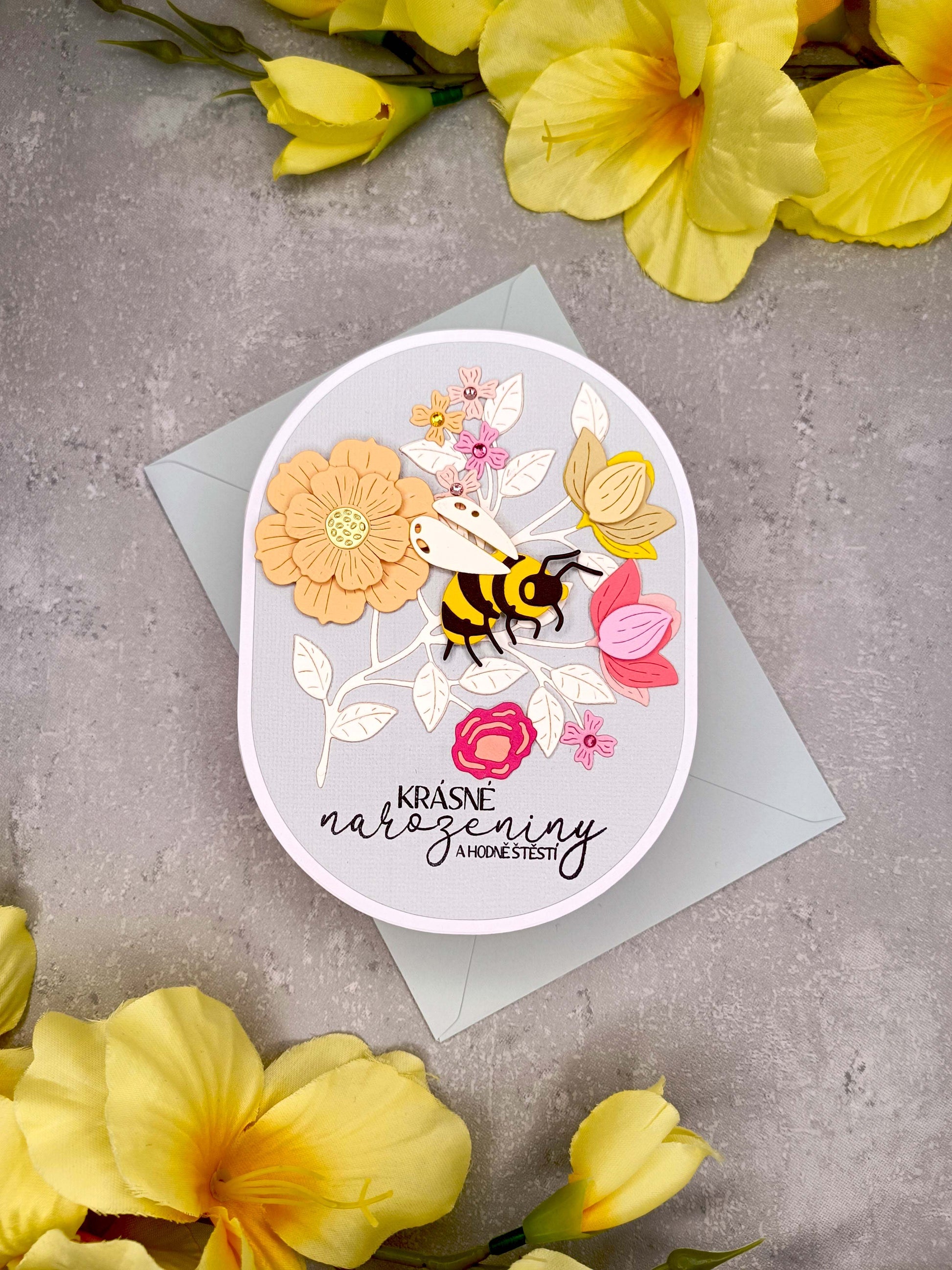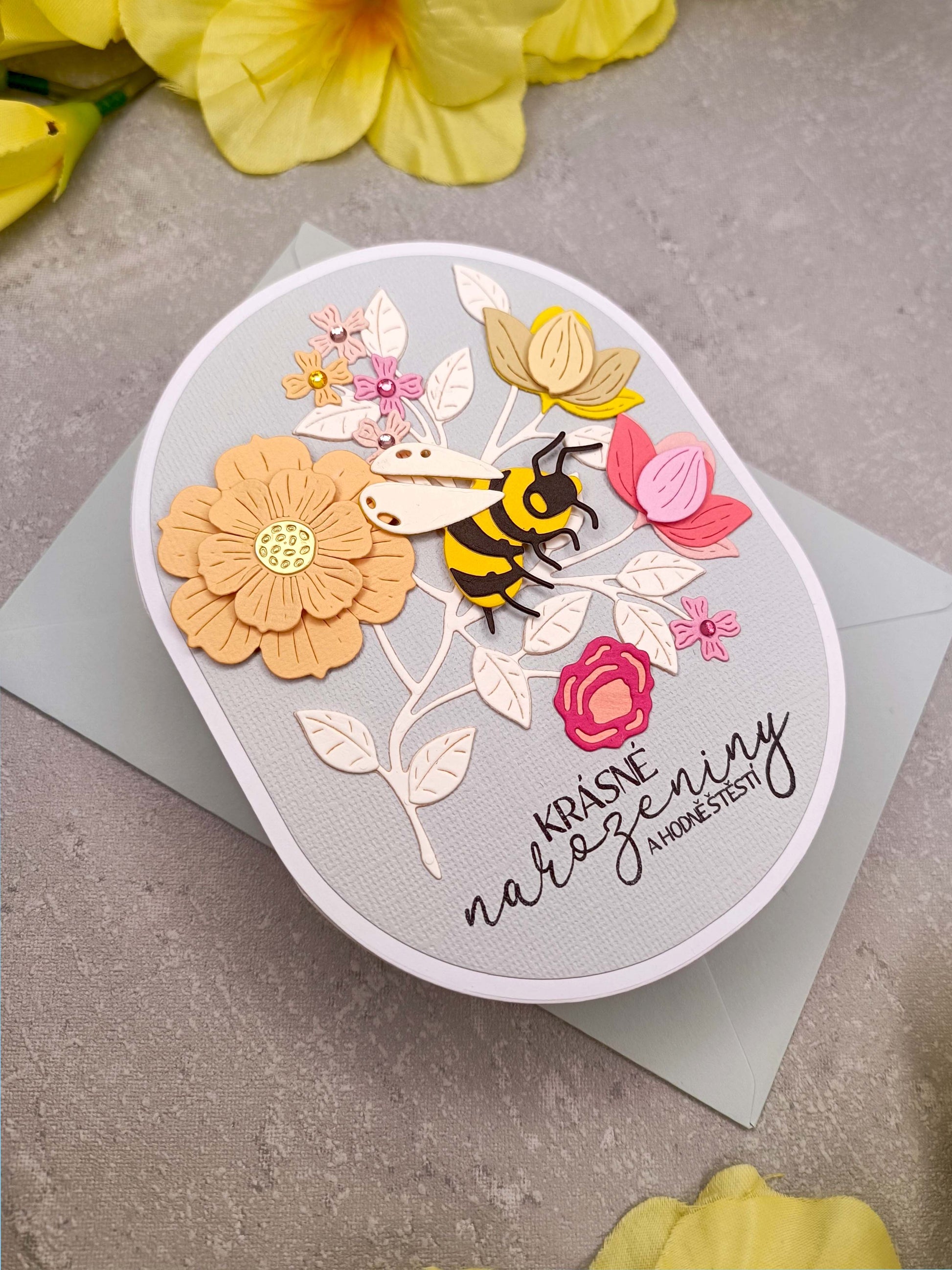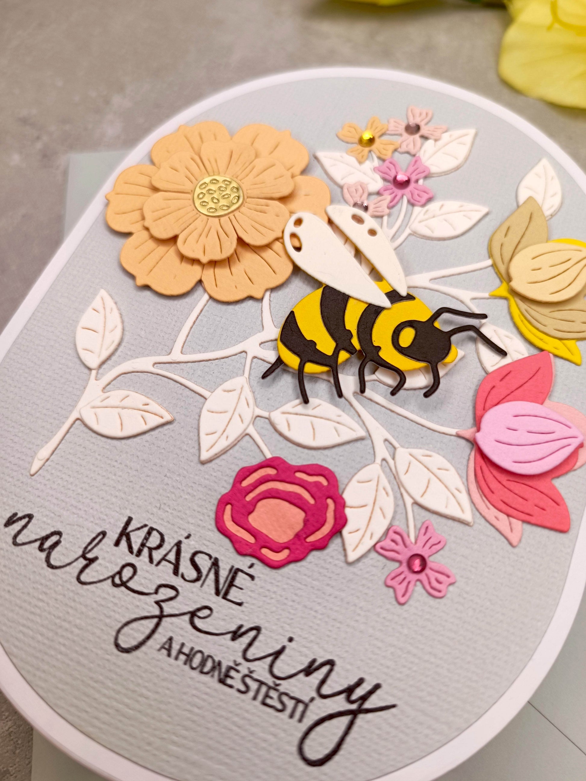 - Přání je ve světle modré barvě, zdověno květinami a kamínky