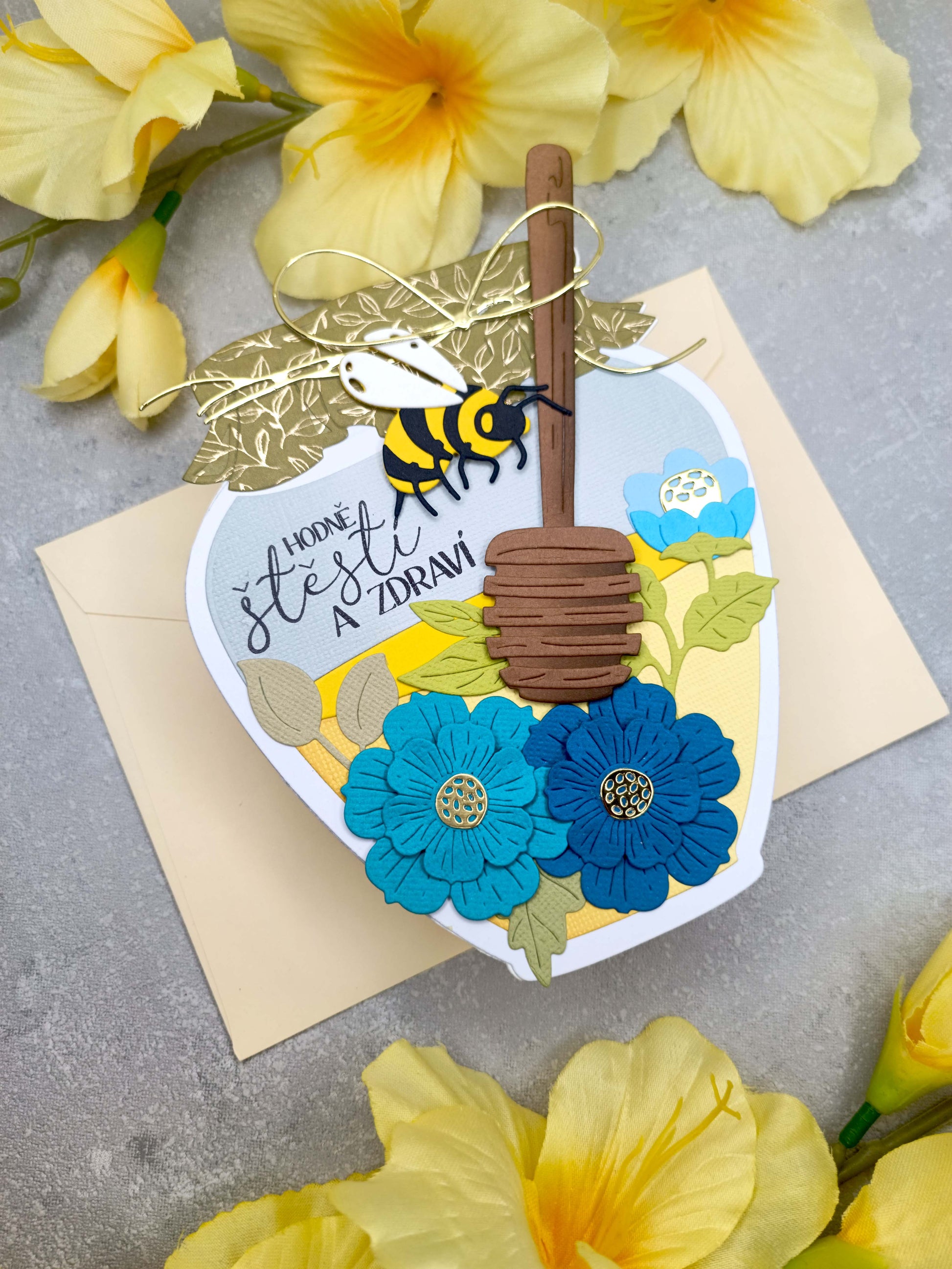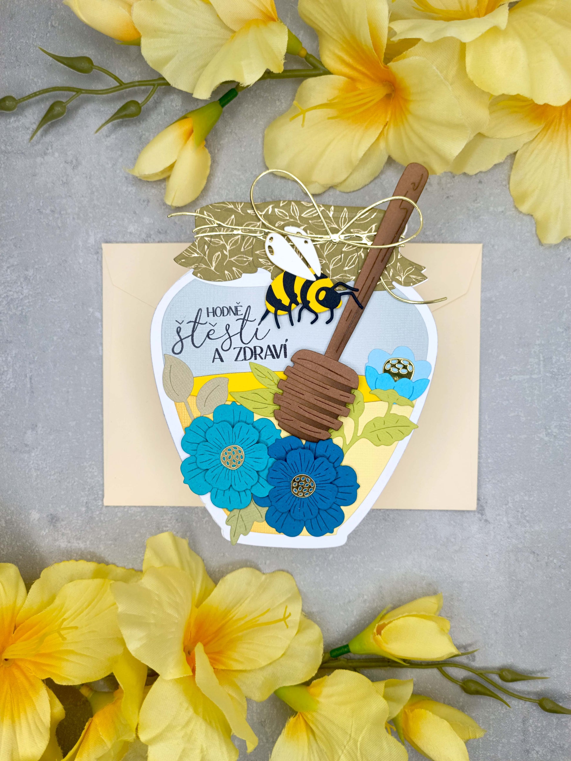 - Přání ve tvaru sklenice s medem je zdobeno pestrobarevnými květinami a včelkou