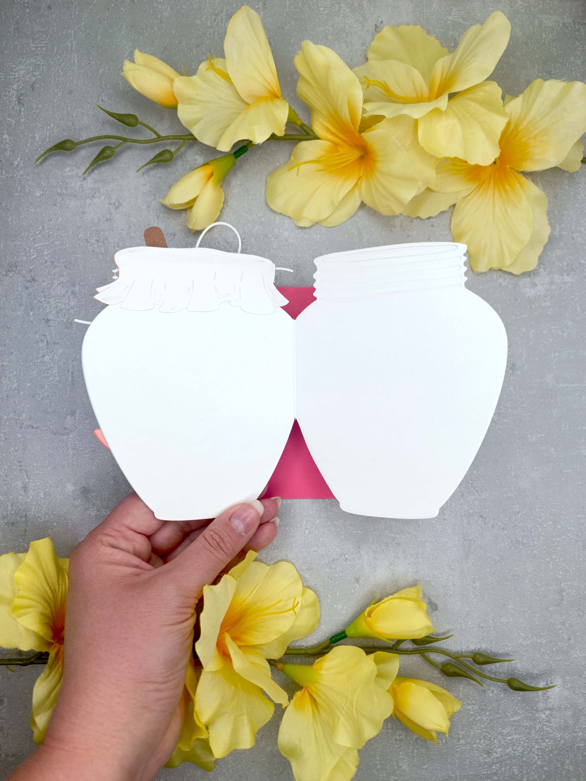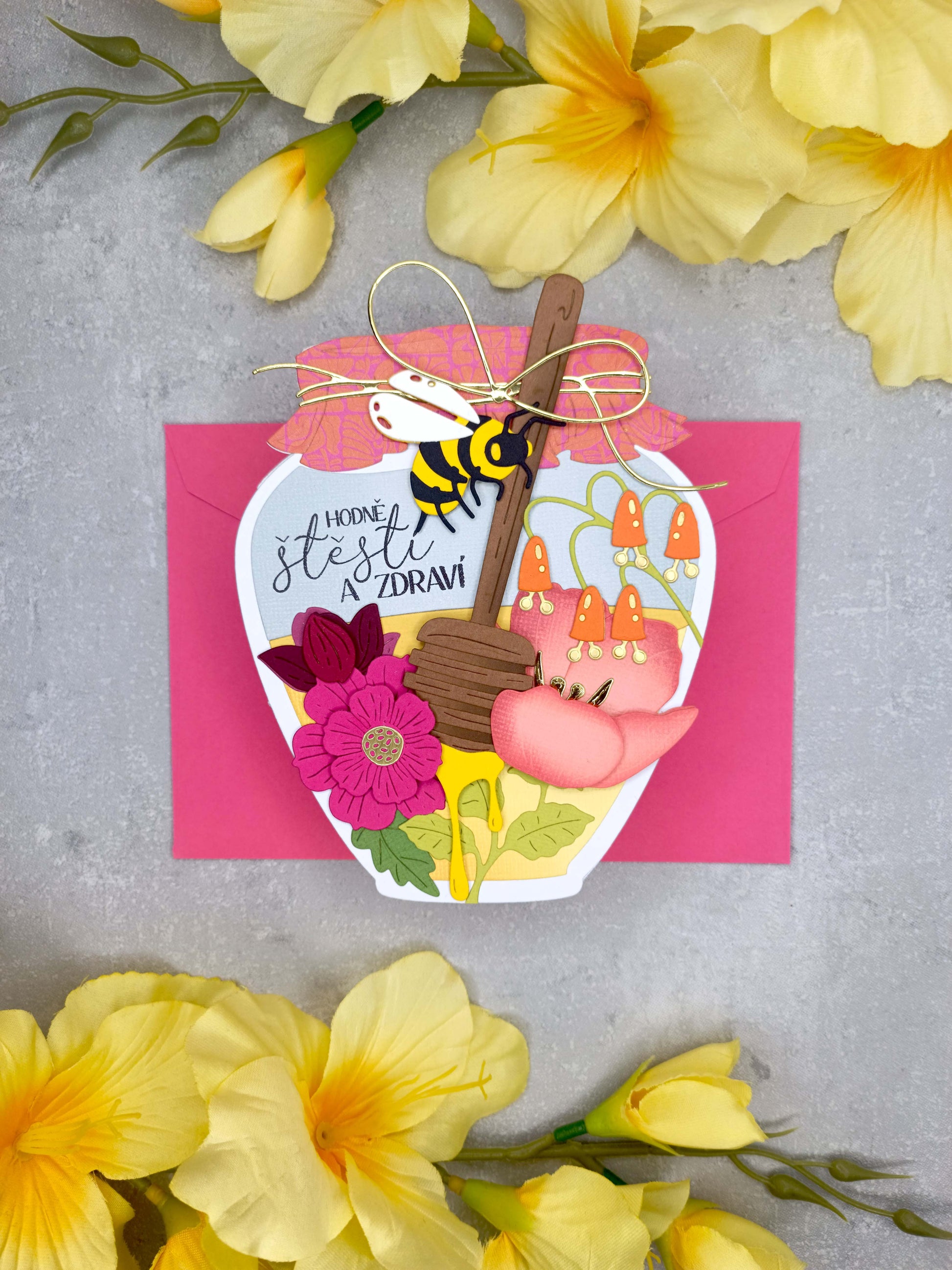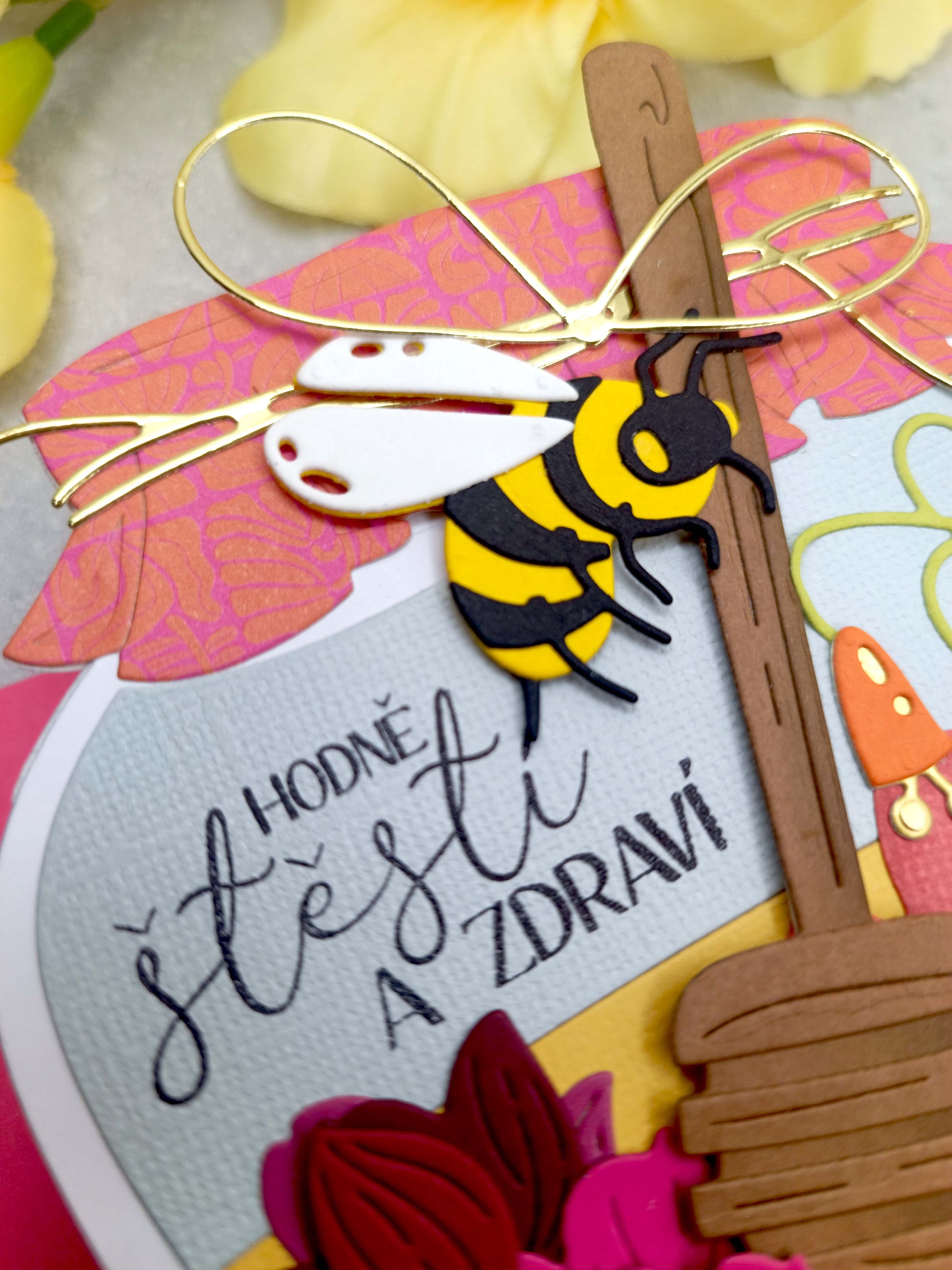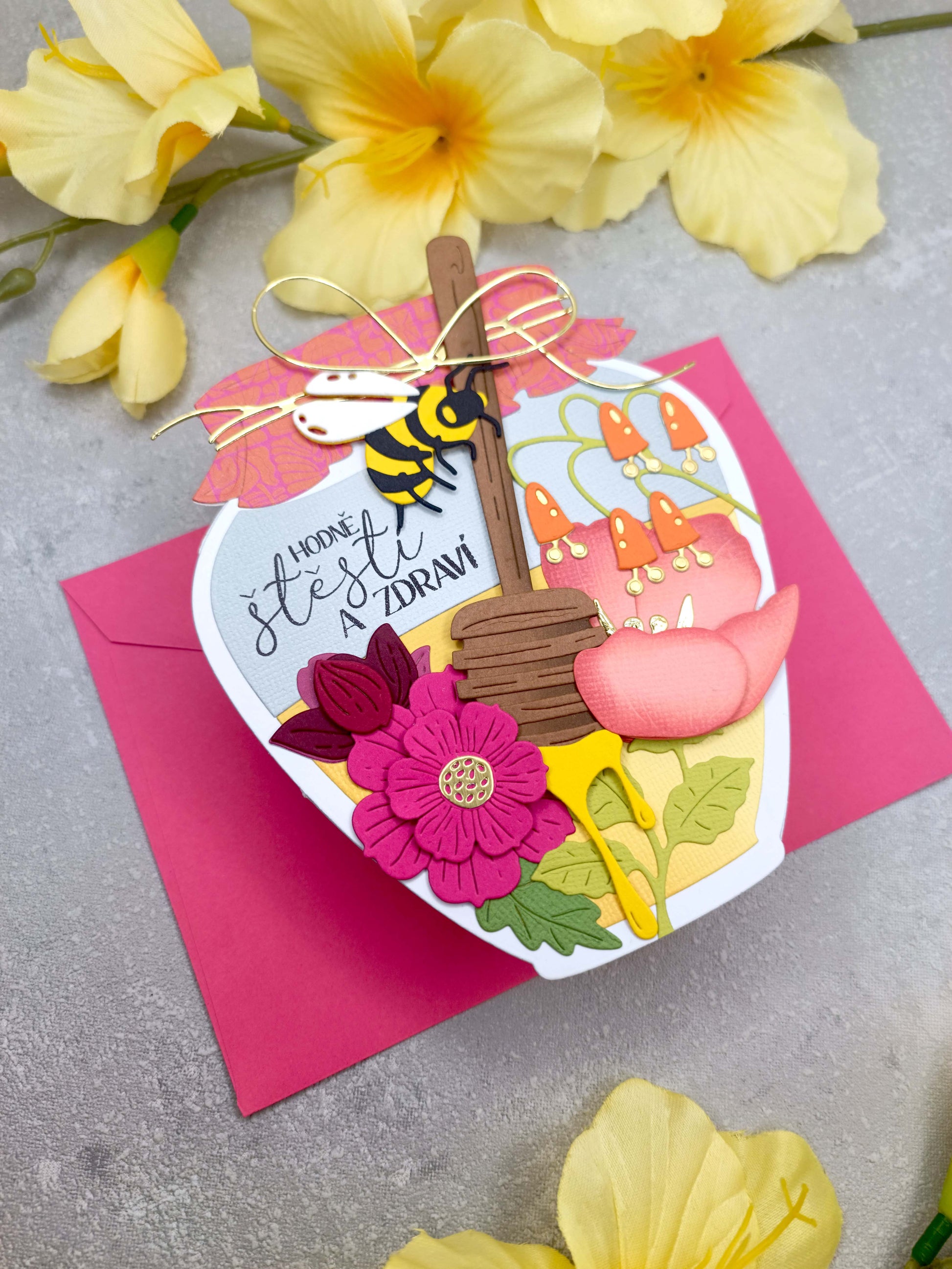 - Přání ve tvaru sklenice s medem je zdobeno pestrobarevnými květinami a včelkou