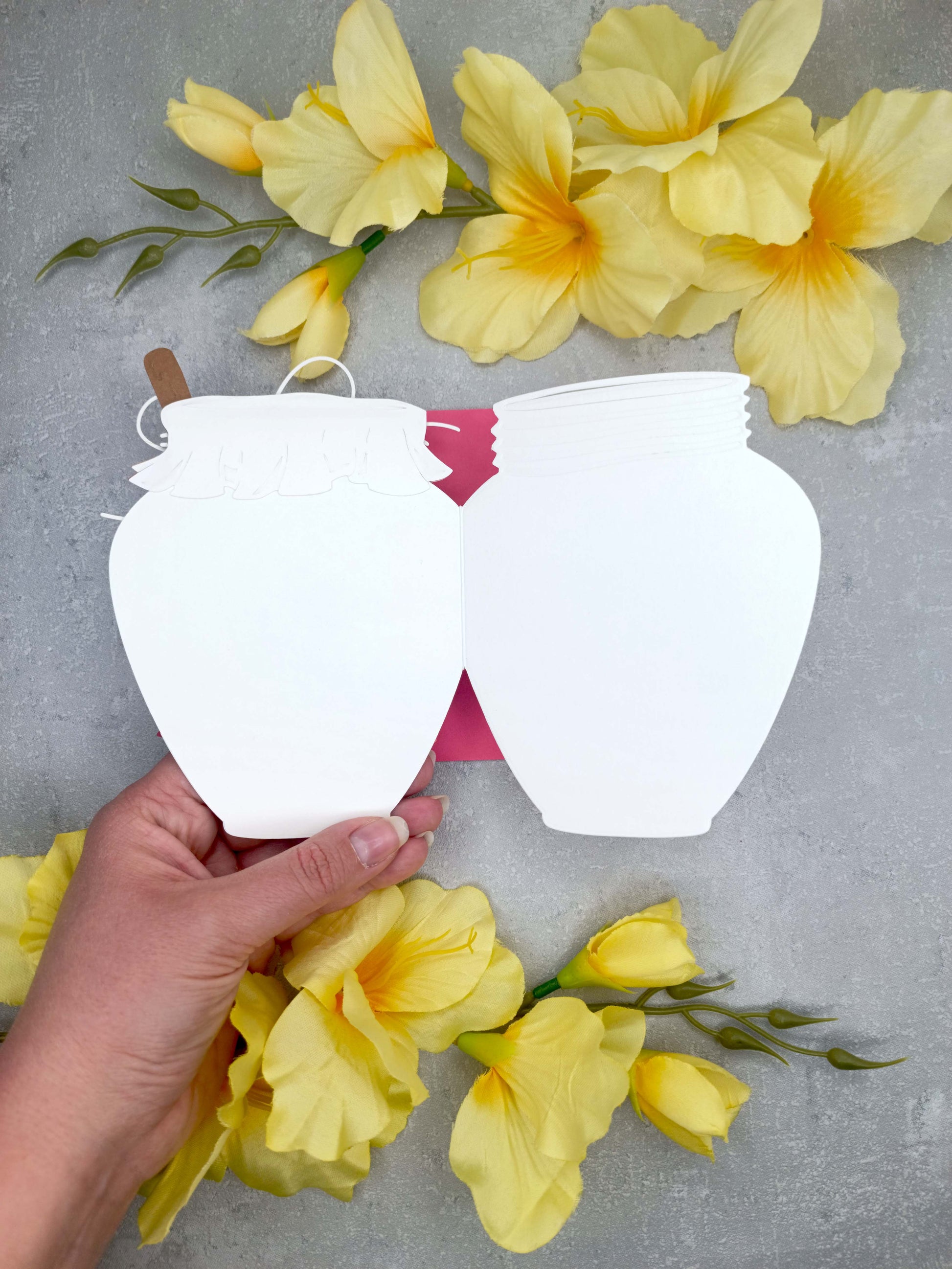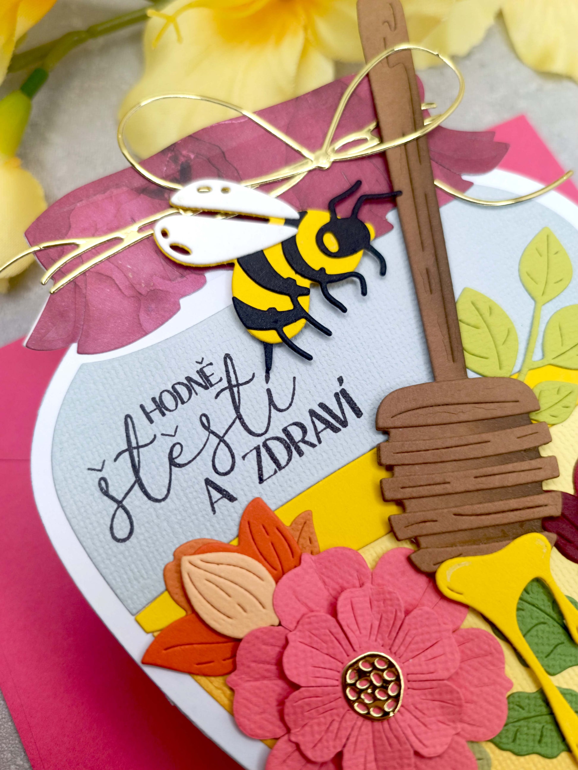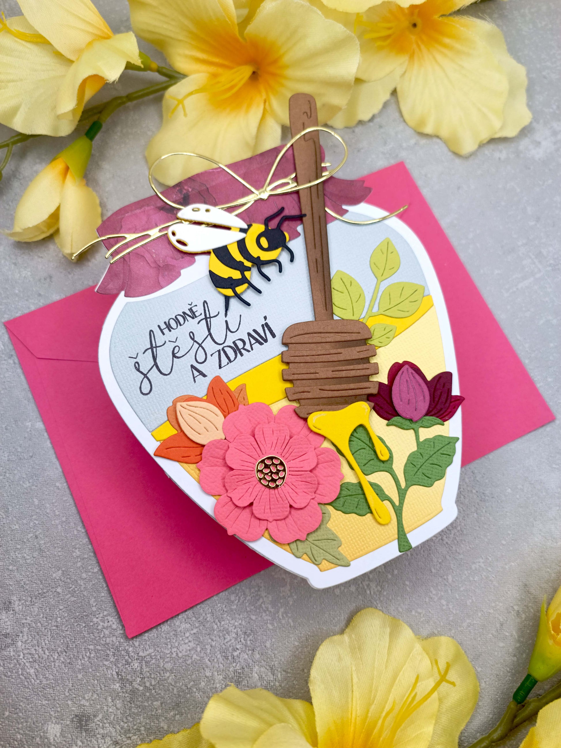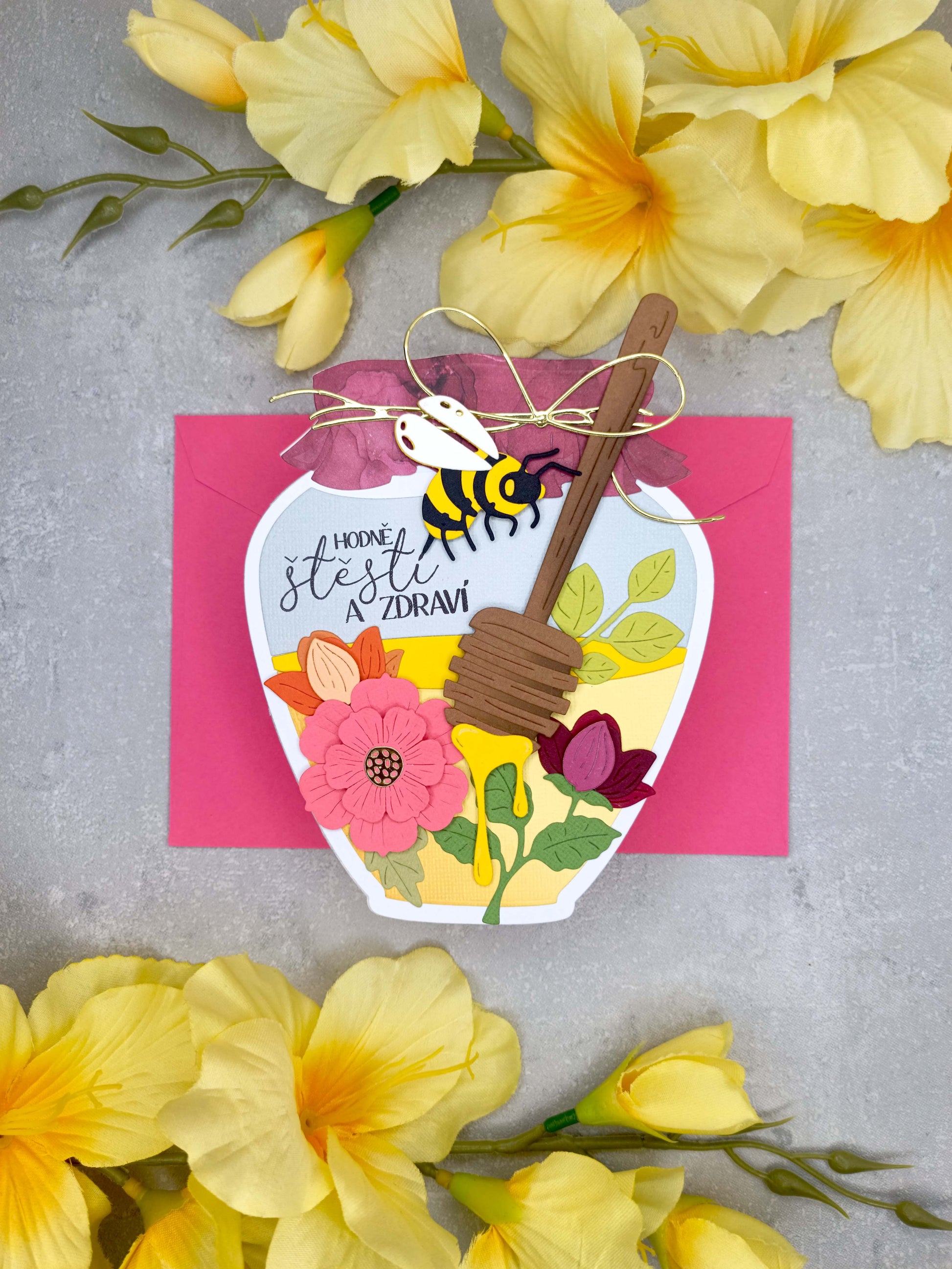 • Přání ve tvaru sklenice s medem je zdobeno pestrobarevnými květinami a včelkou