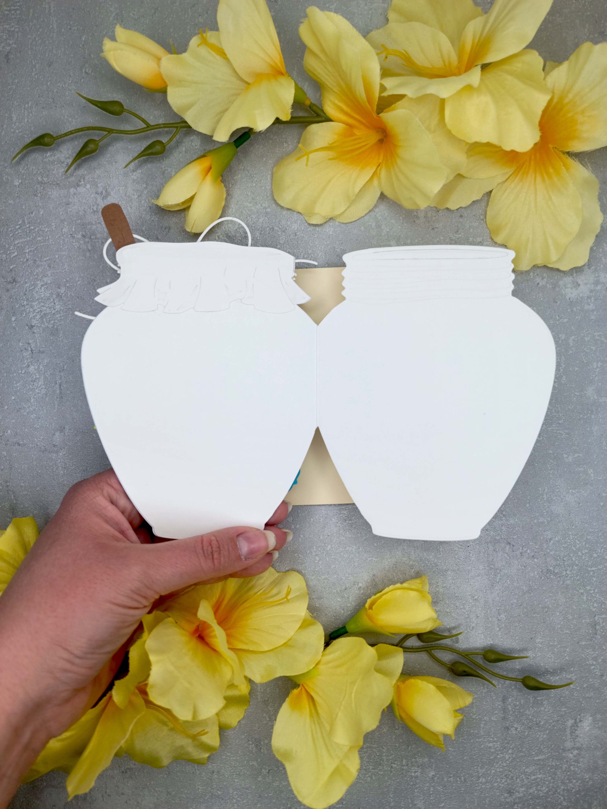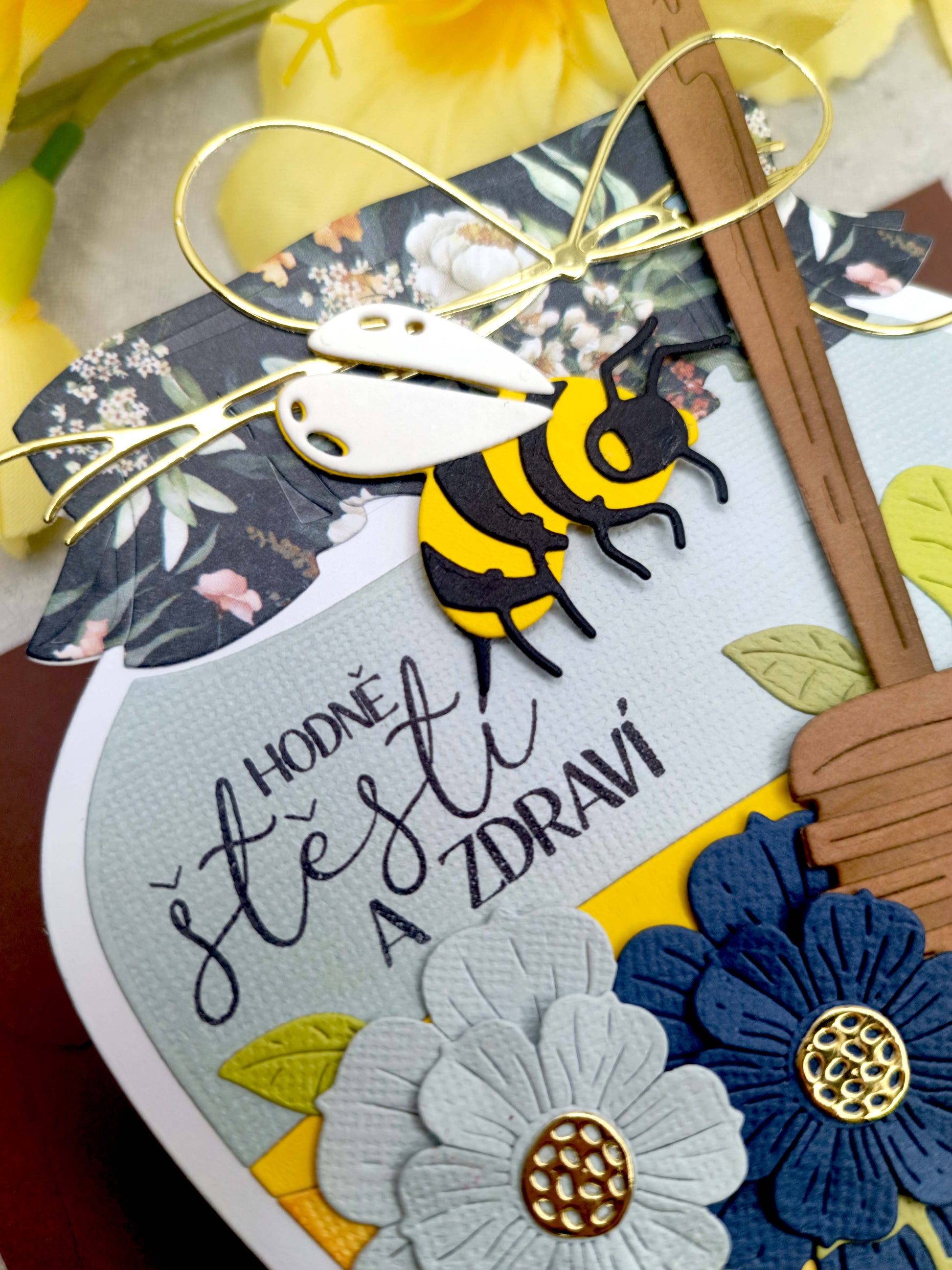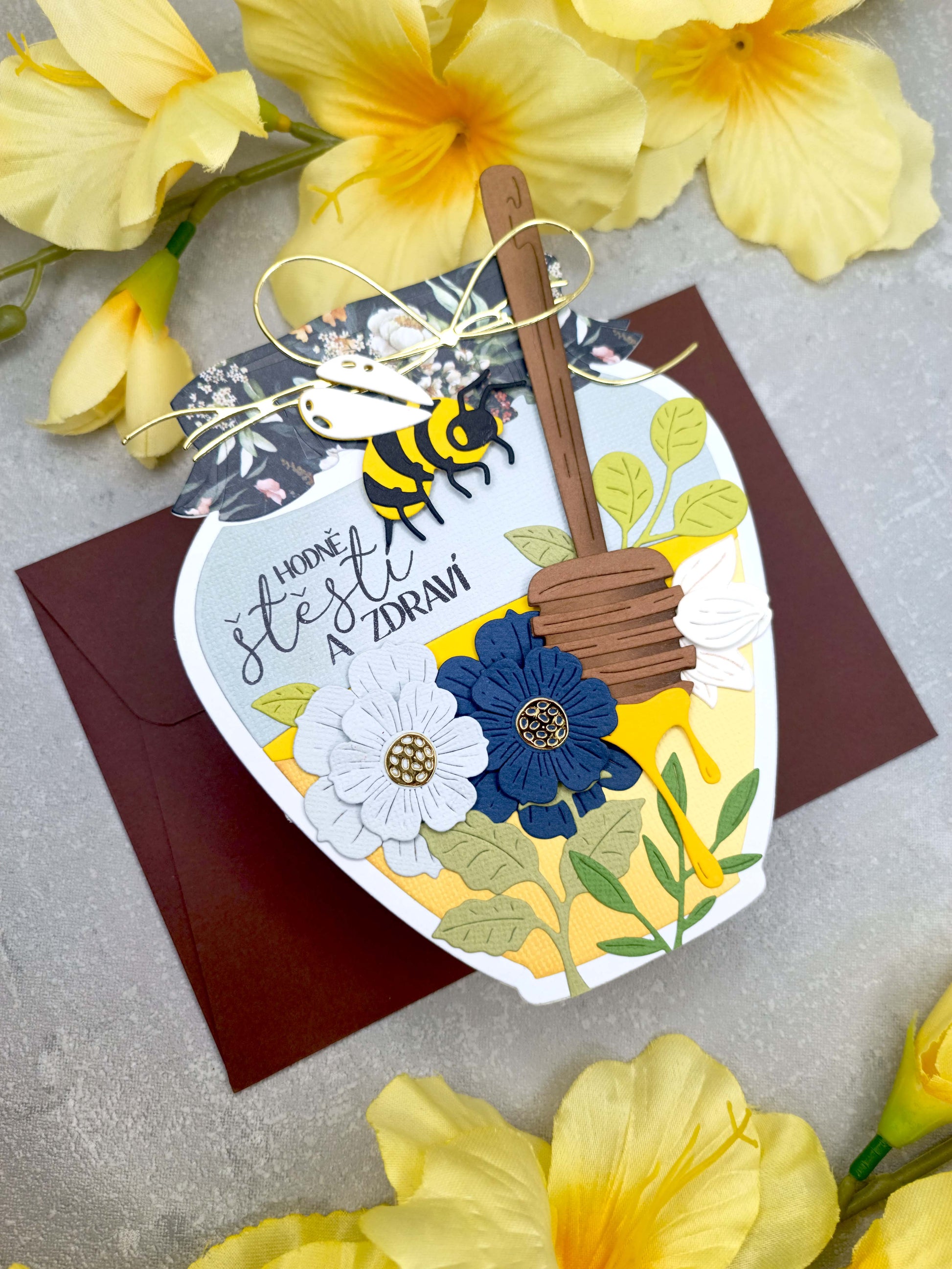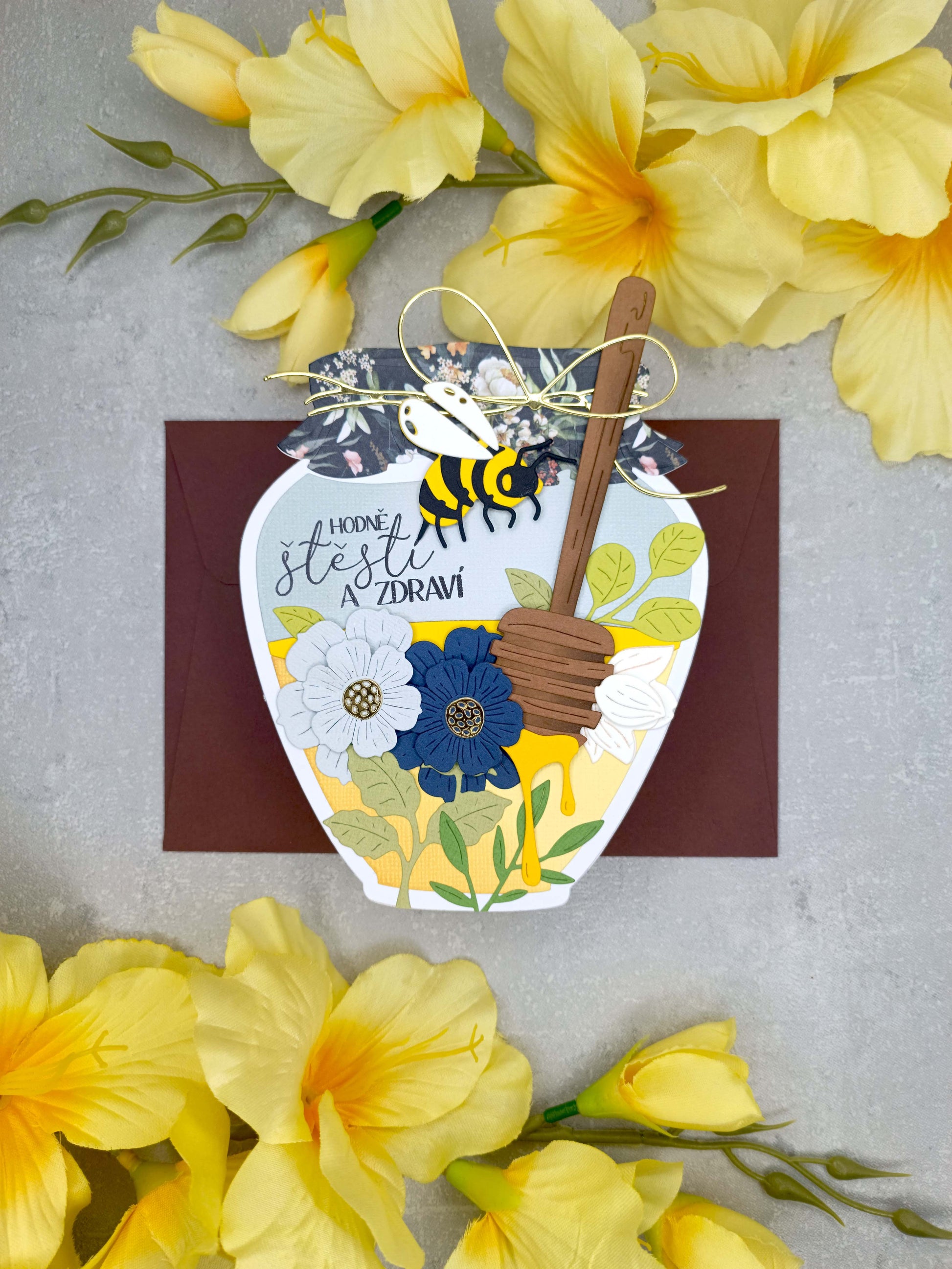 - Přání ve tvaru sklenice s medem je zdobeno pestrobarevnými květinami a včelkou