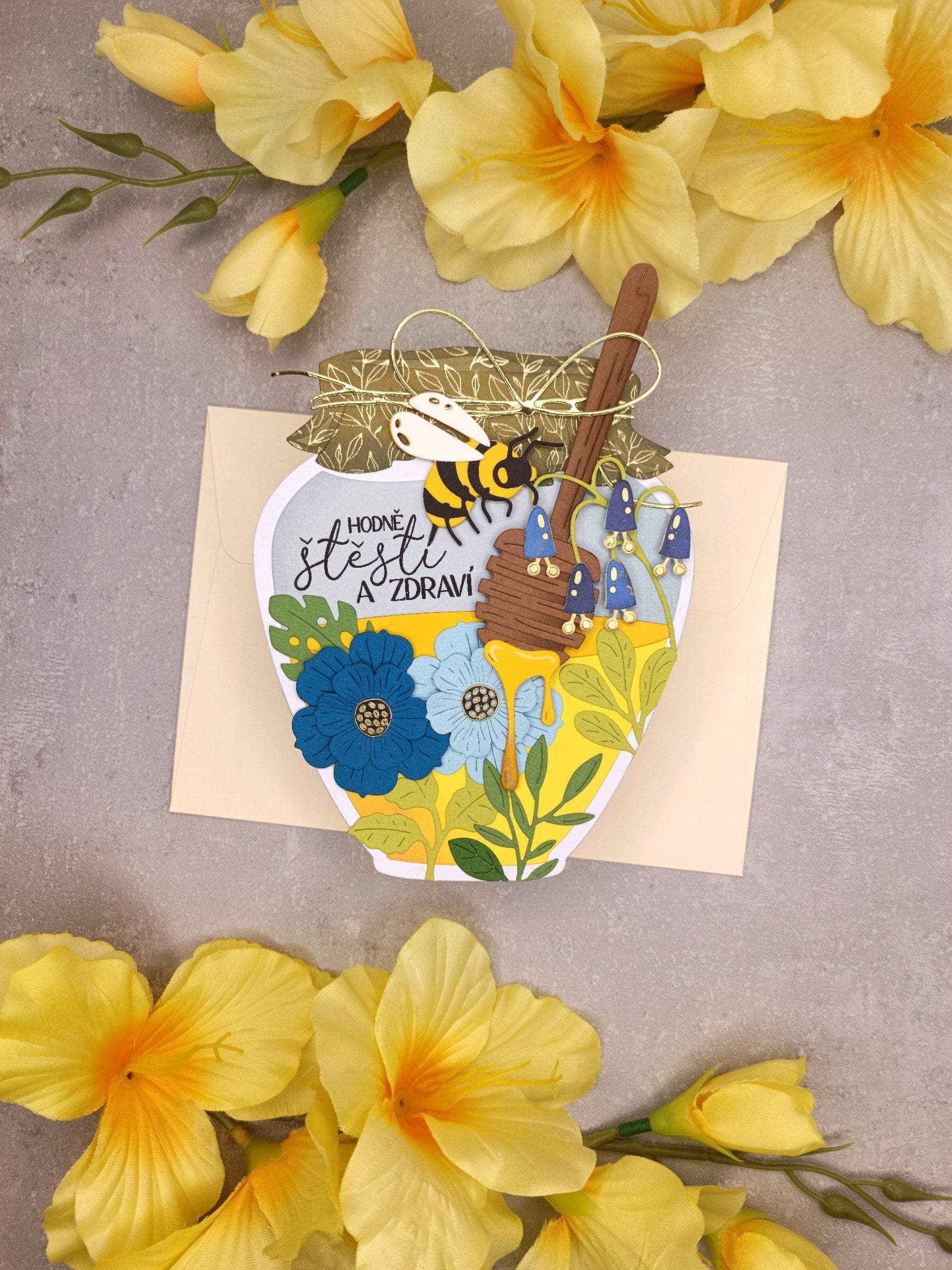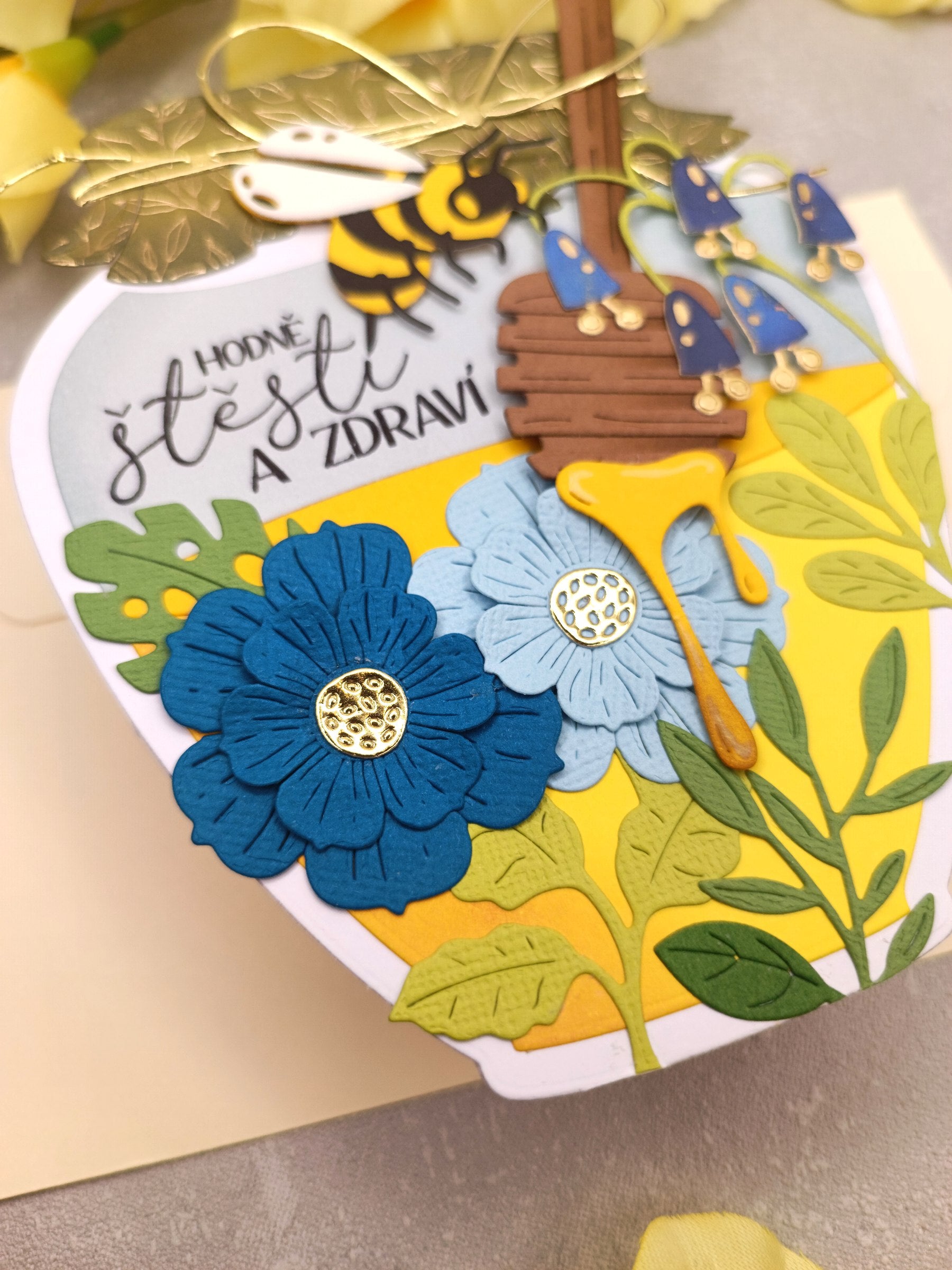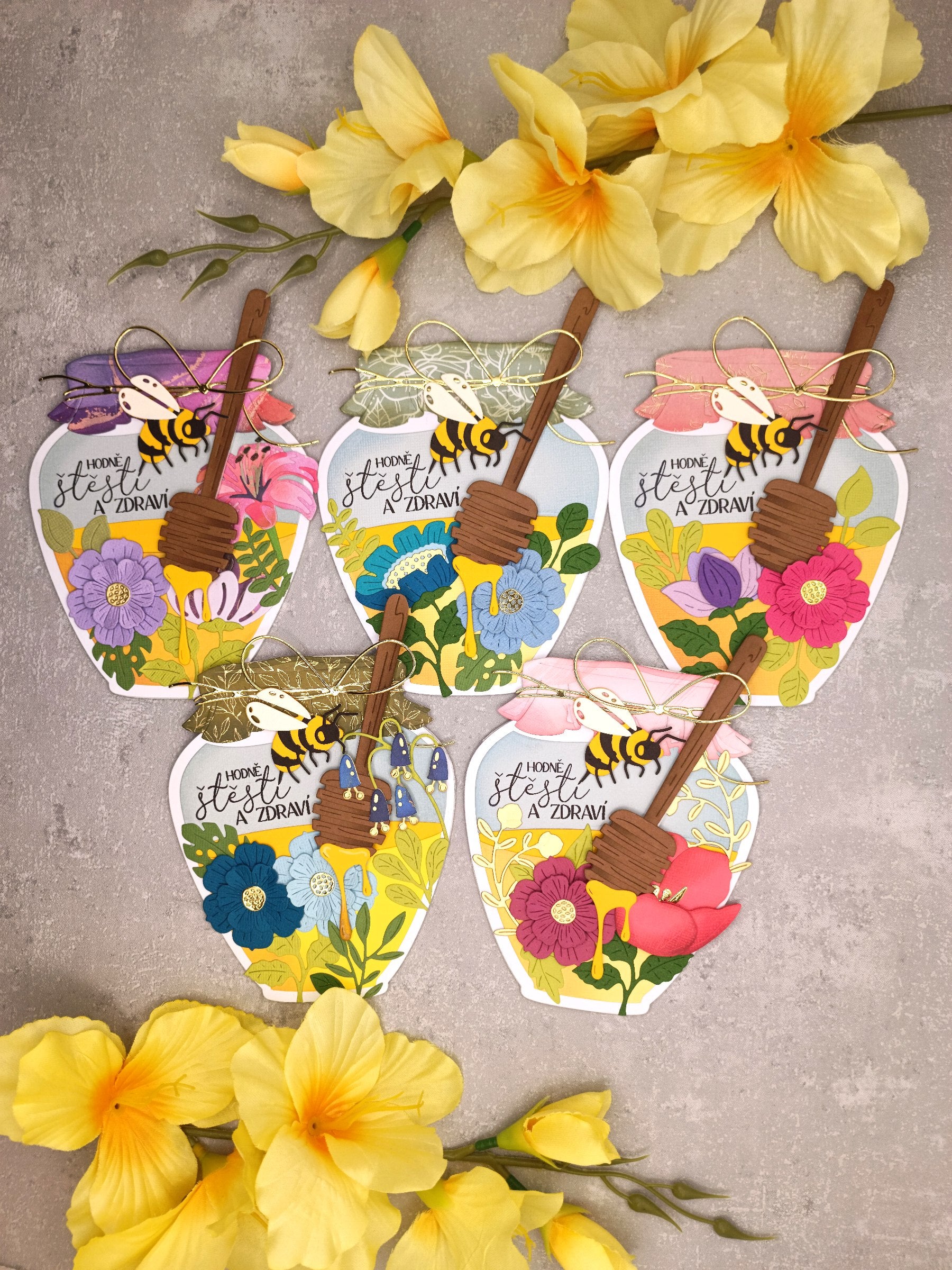 - Přání ve tvaru sklenice s medem je zdobeno pestrobarevnými květinami a včelkou