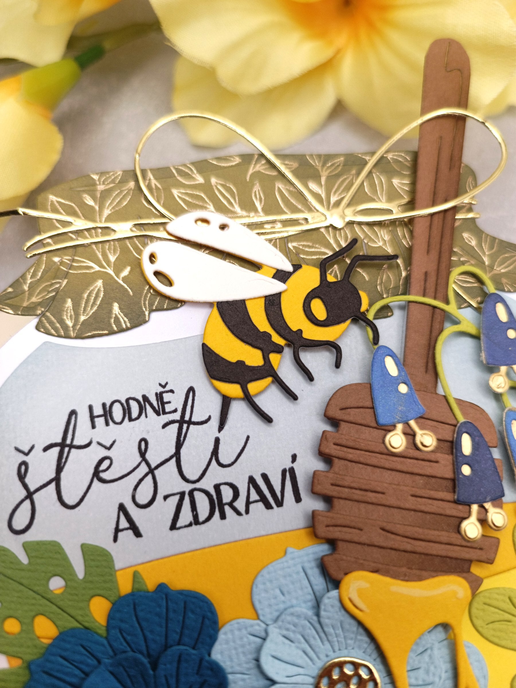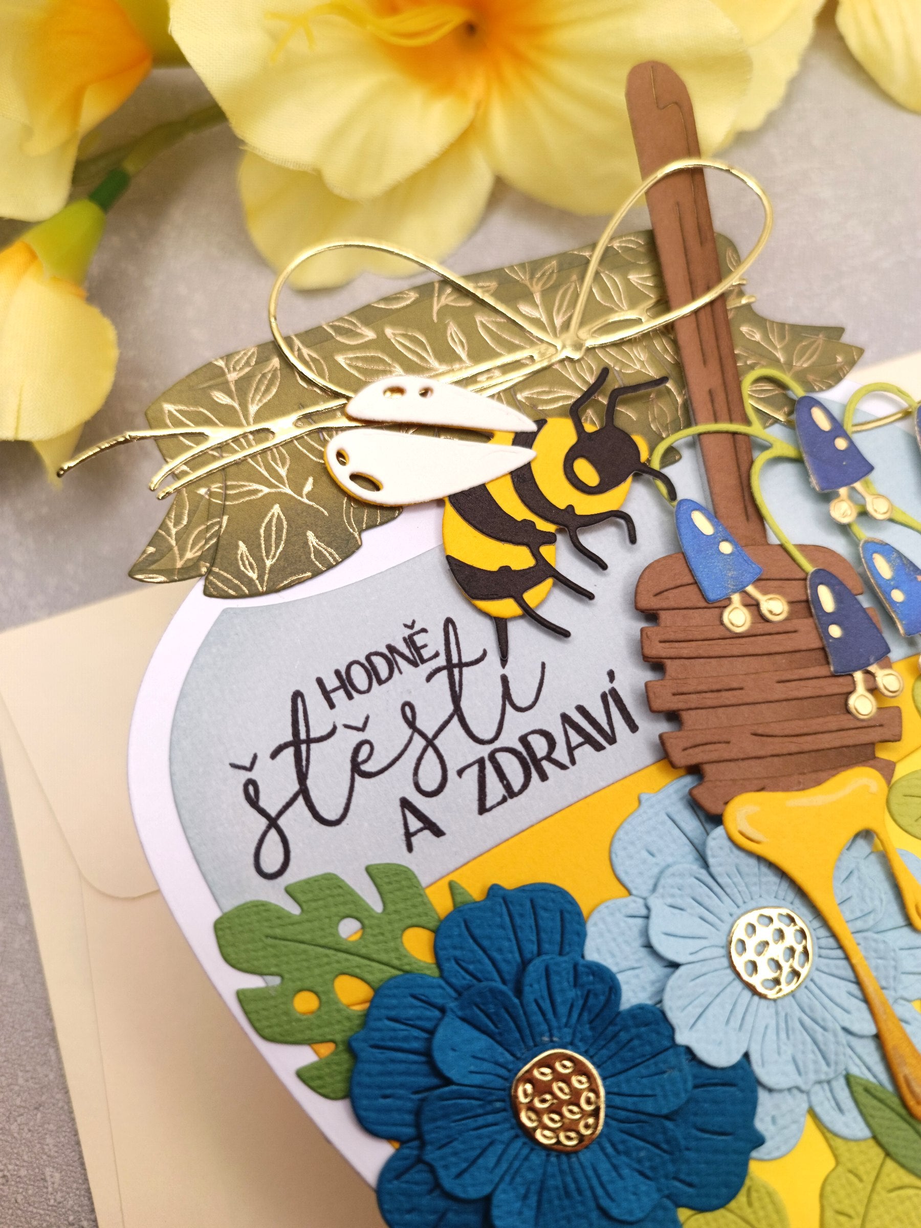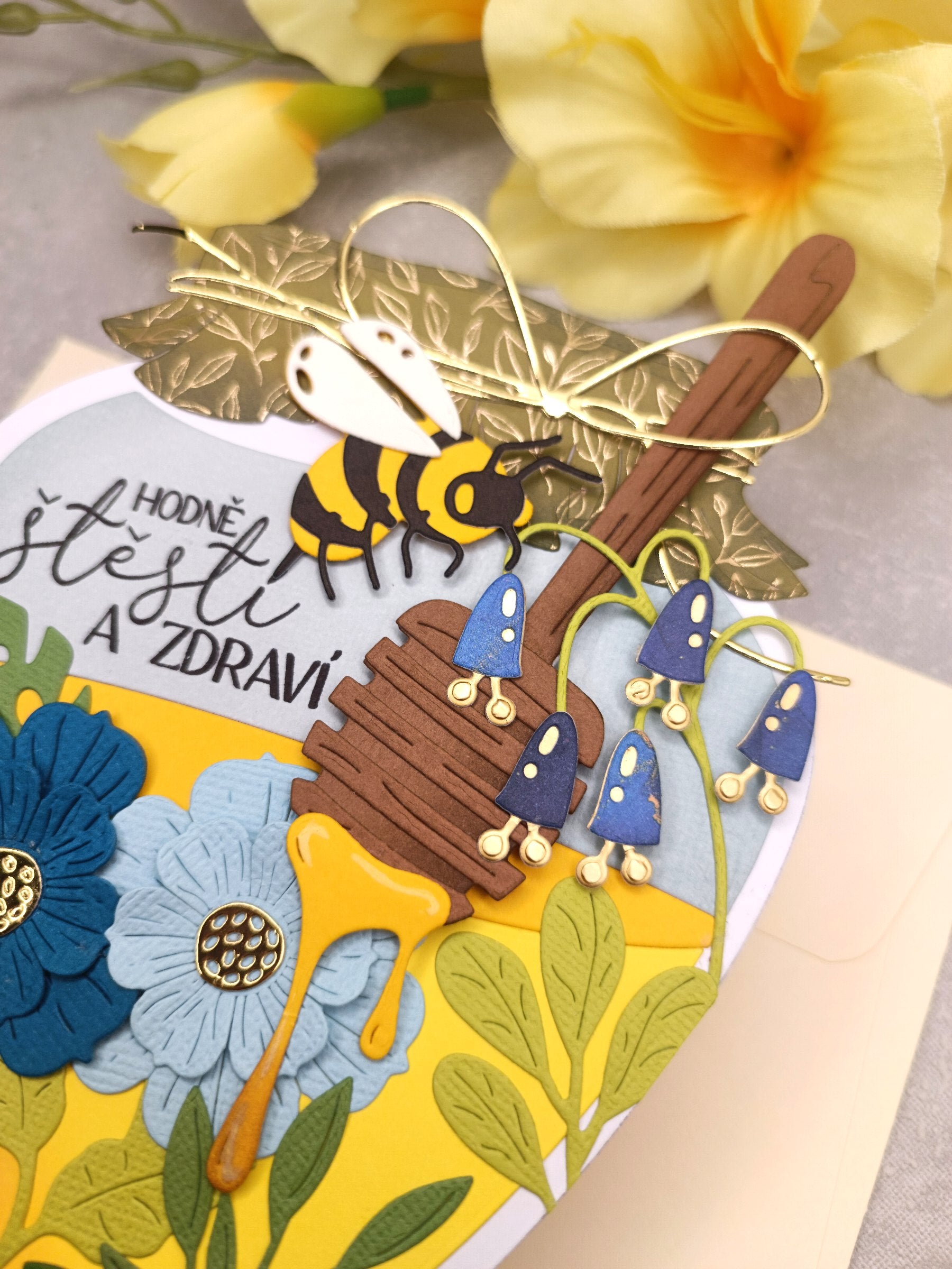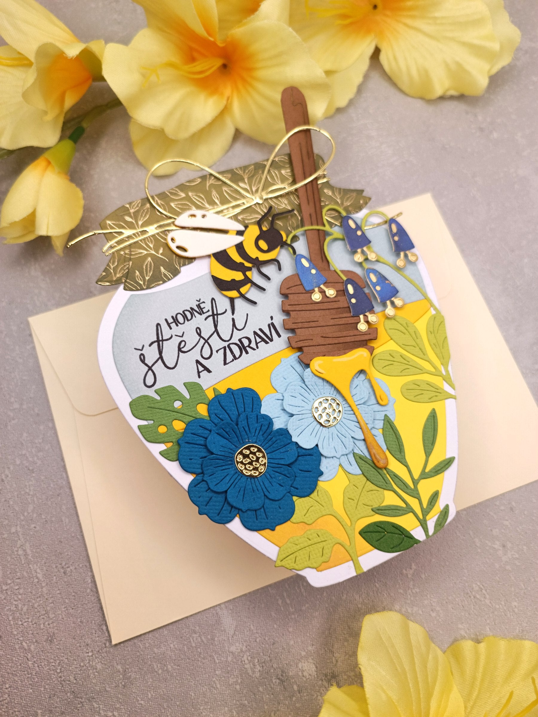 - Přání ve tvaru sklenice s medem je zdobeno pestrobarevnými květinami a včelkou