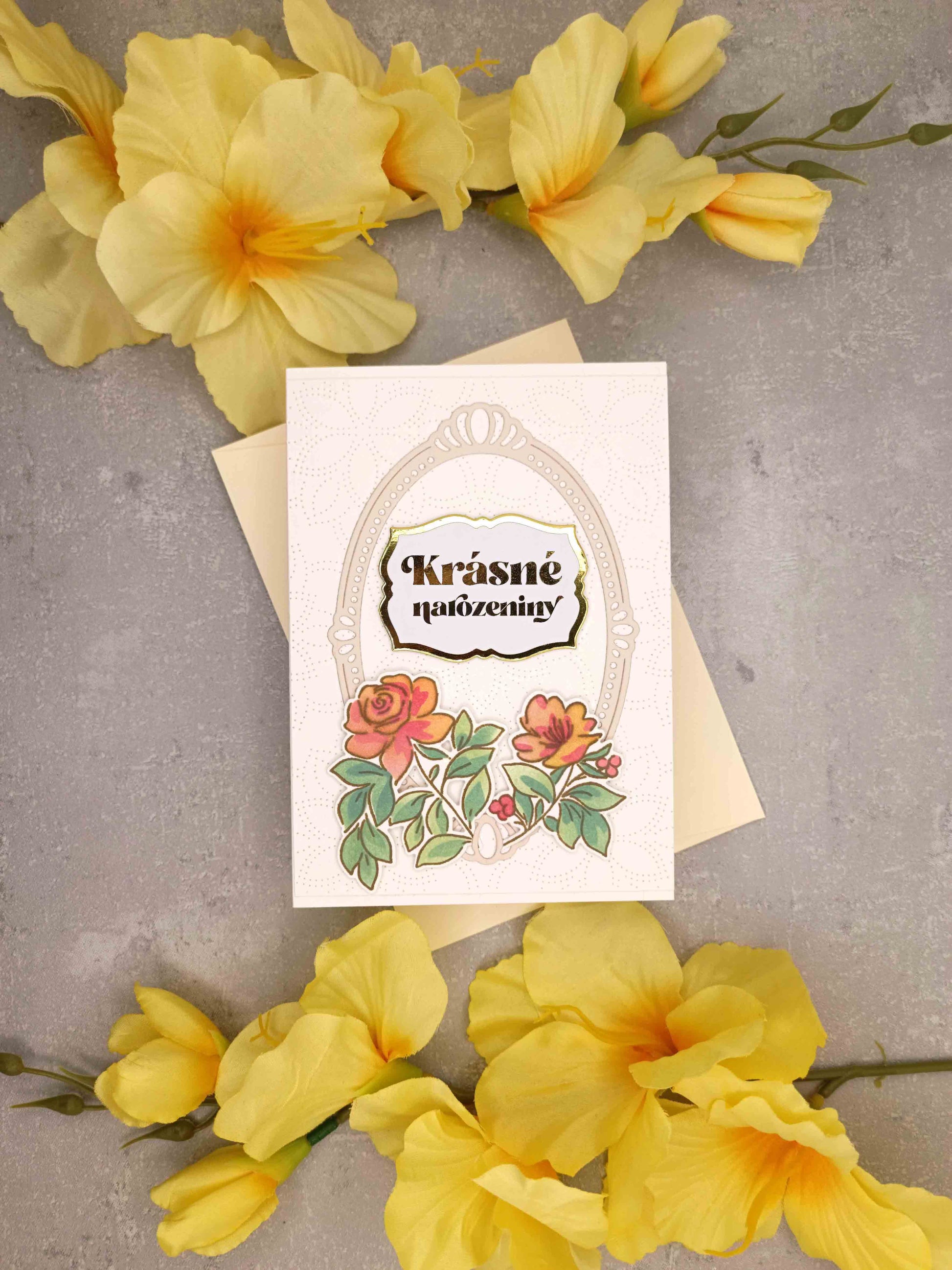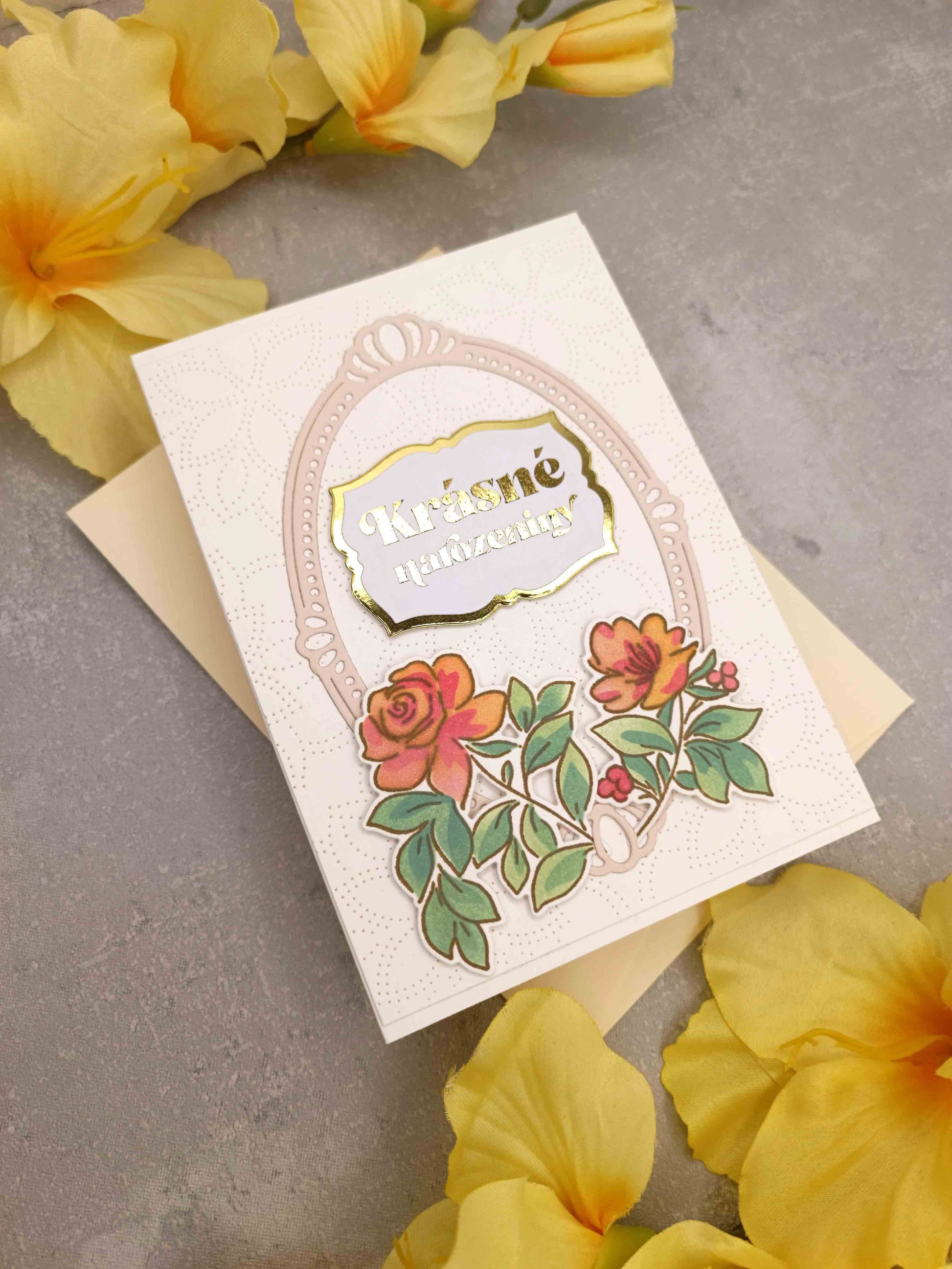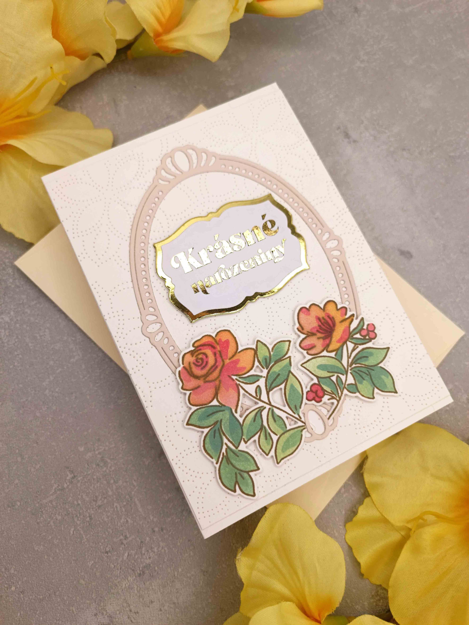 - Přání je bíle a zdobeno krémovým rámečkem a oranžovými květinami se zlatým nápisem.