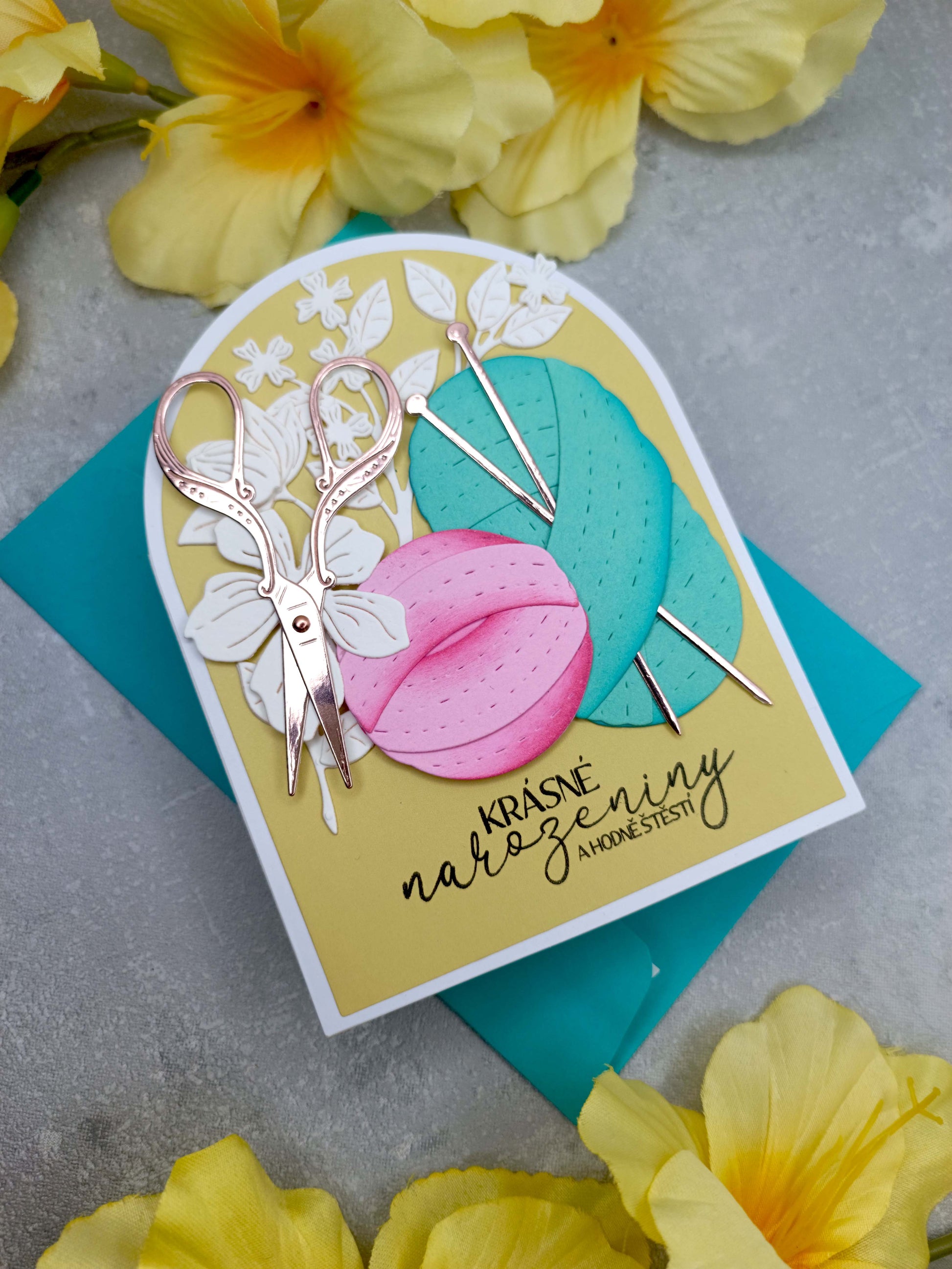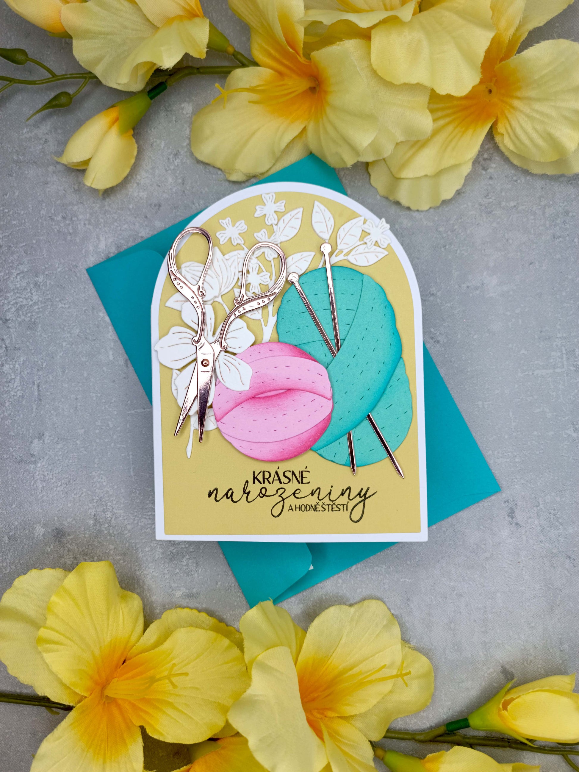 - Přání je v olivové barvě, zdobeno barevnými klubíčky, růžovo-zlatými nůžkami, se kterými lze hýbat a jehlicemi