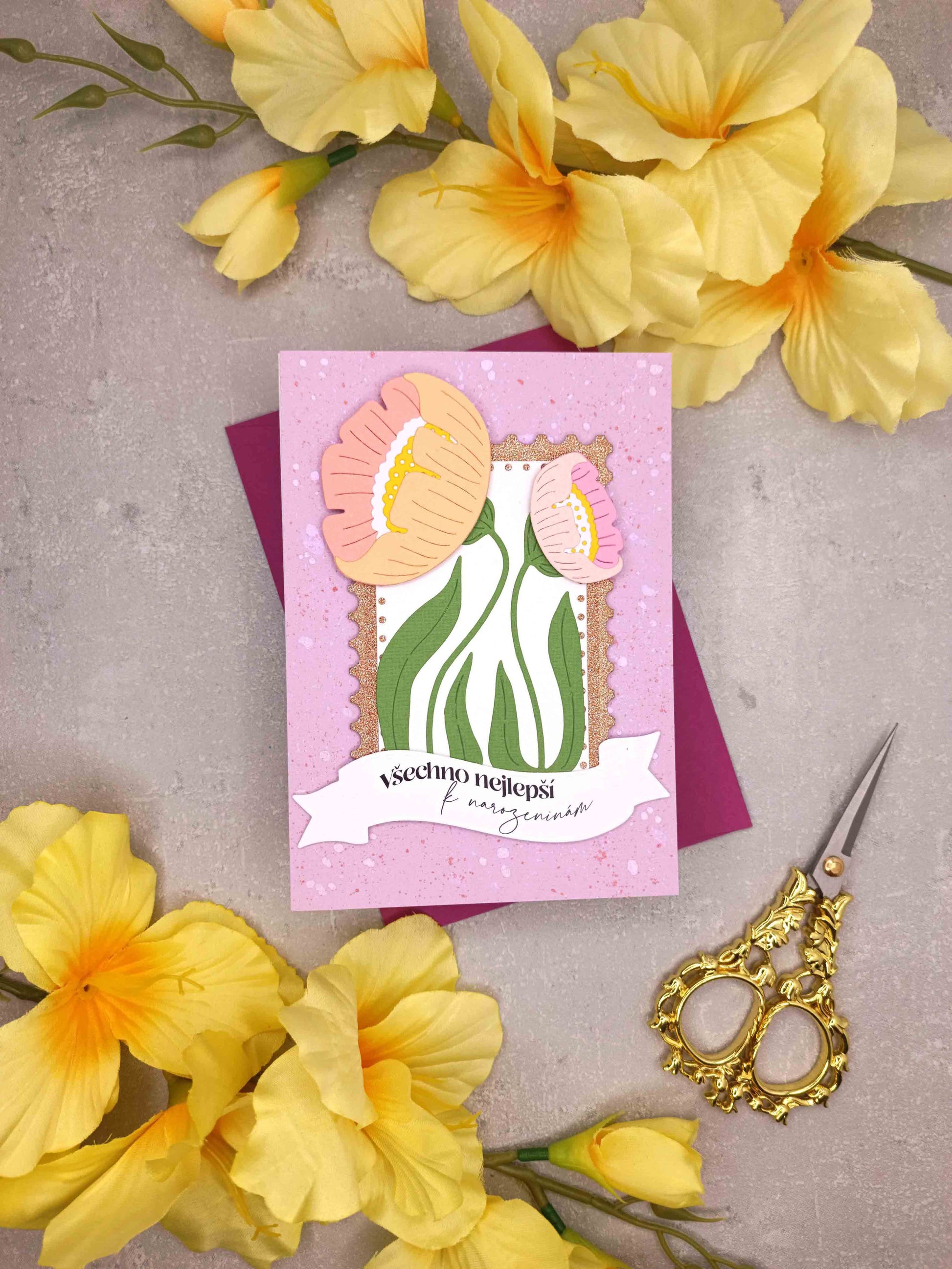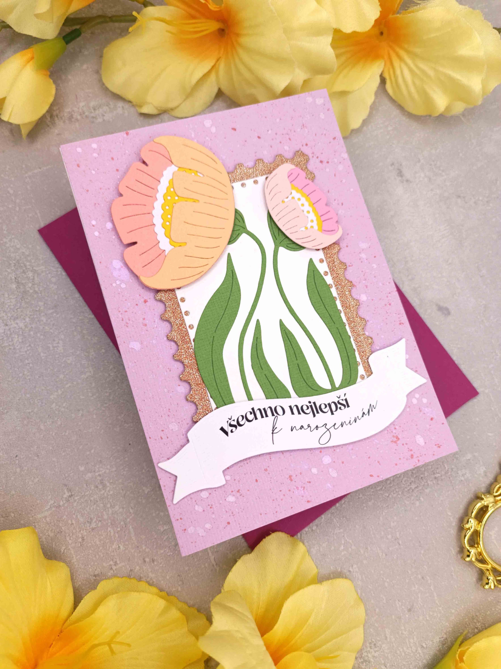 - Přání je laděno do pastelové fialové barvy a zdobeno pastelovými sasankami