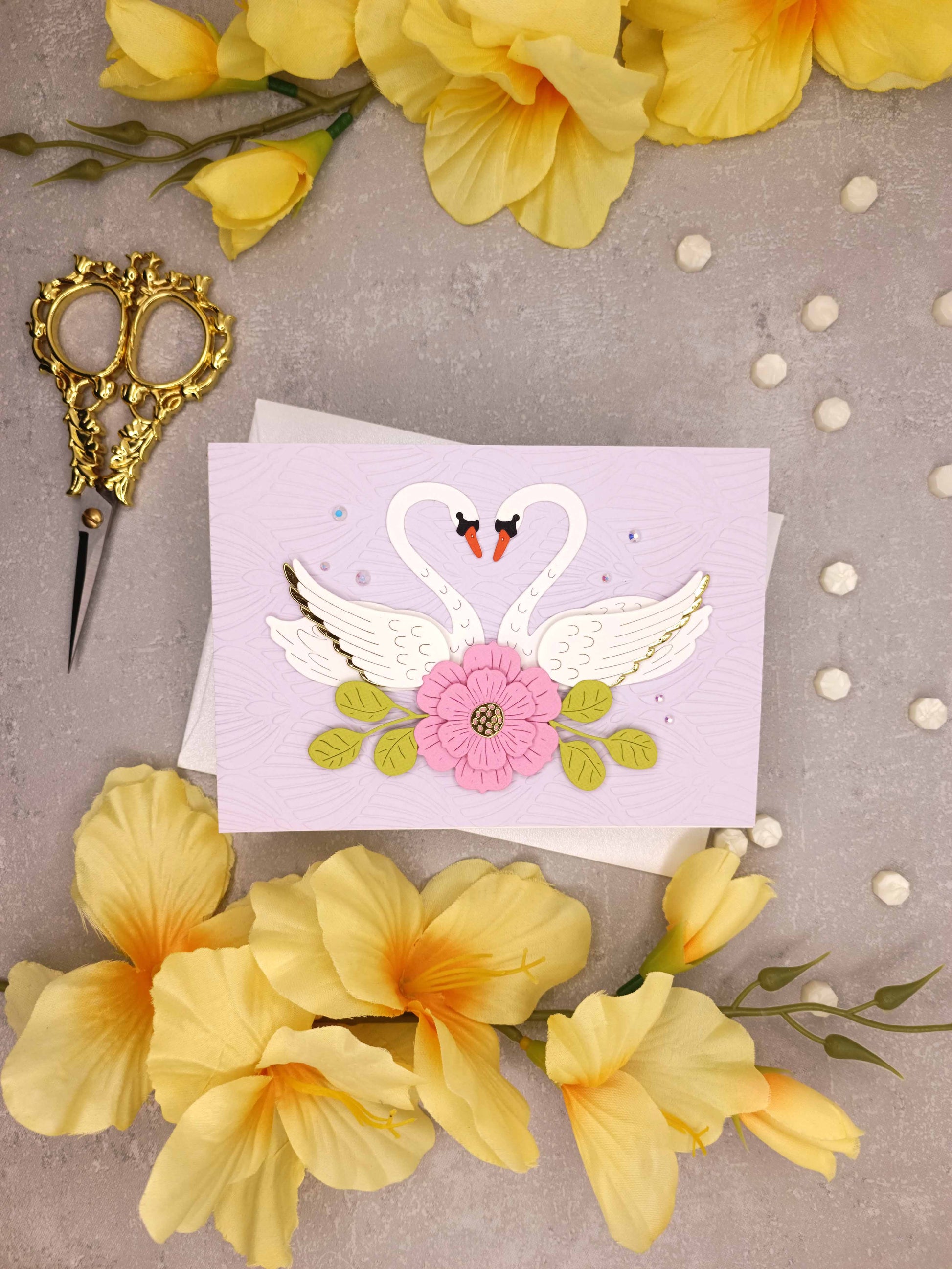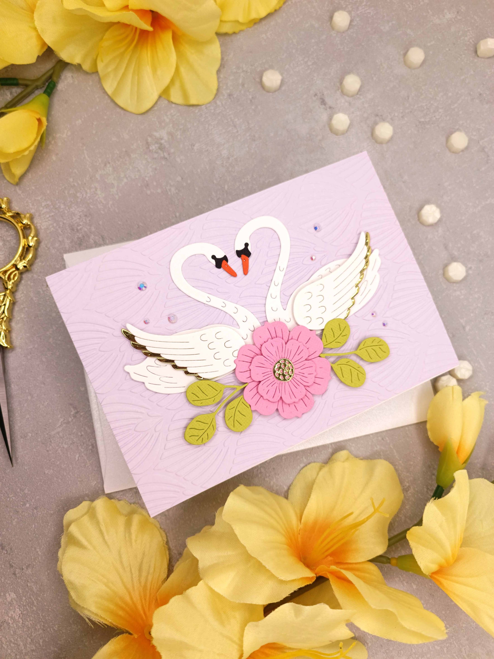 - Pastelově fialové pozadí je opatřeno vzorem a zdobeno jemnými kamínky