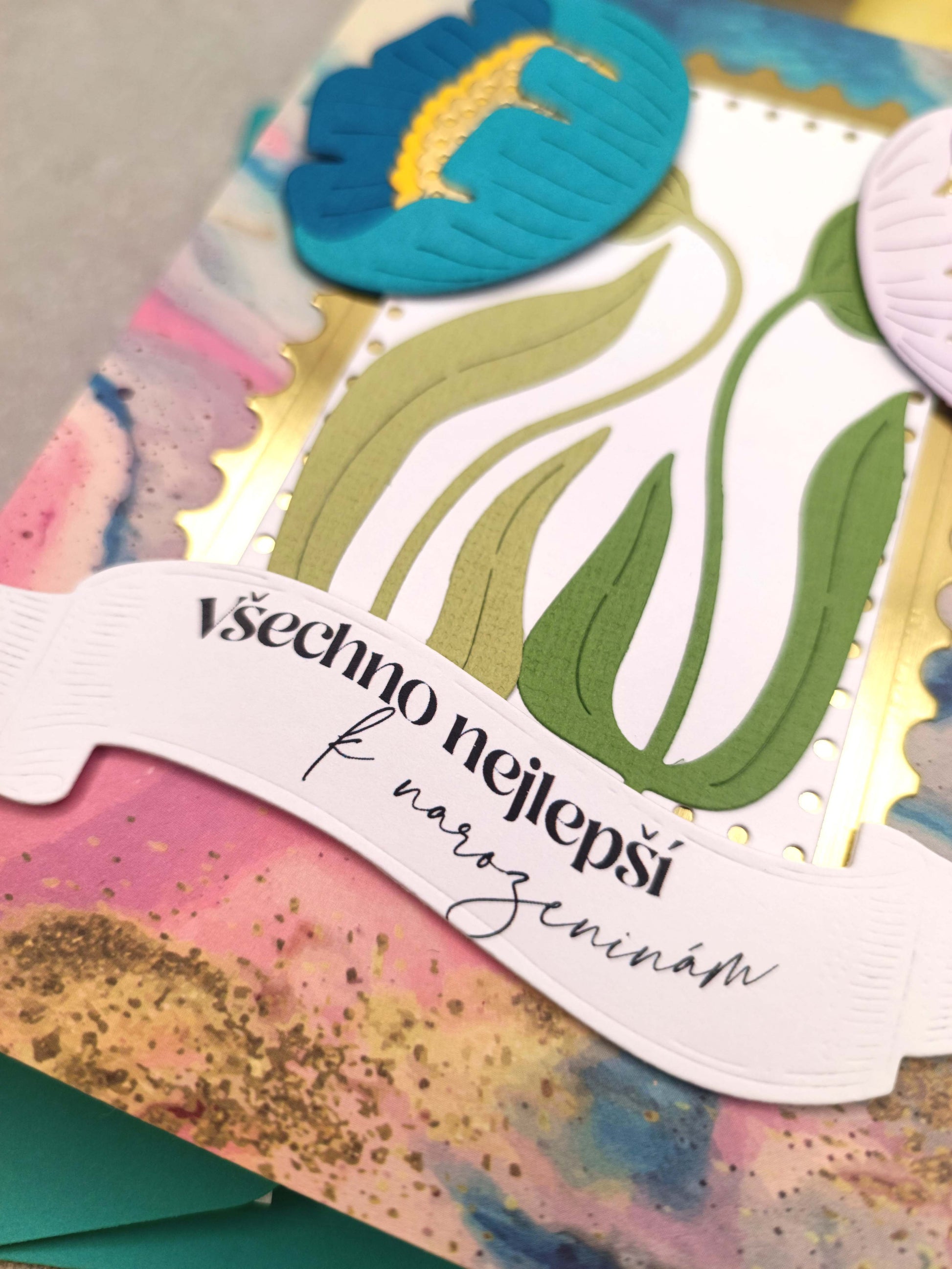 - Přání je laděno do modro-růžovo-tyrkysovo-fialové barvy a zdobeno zlatými elementy