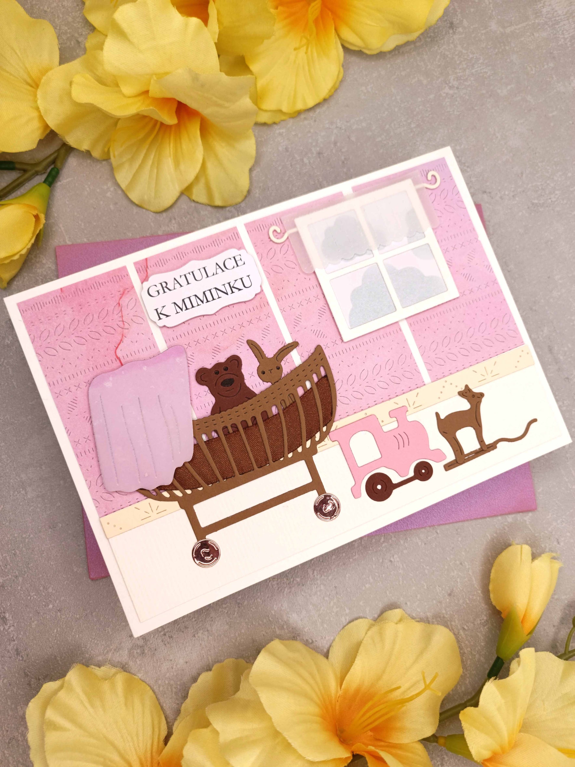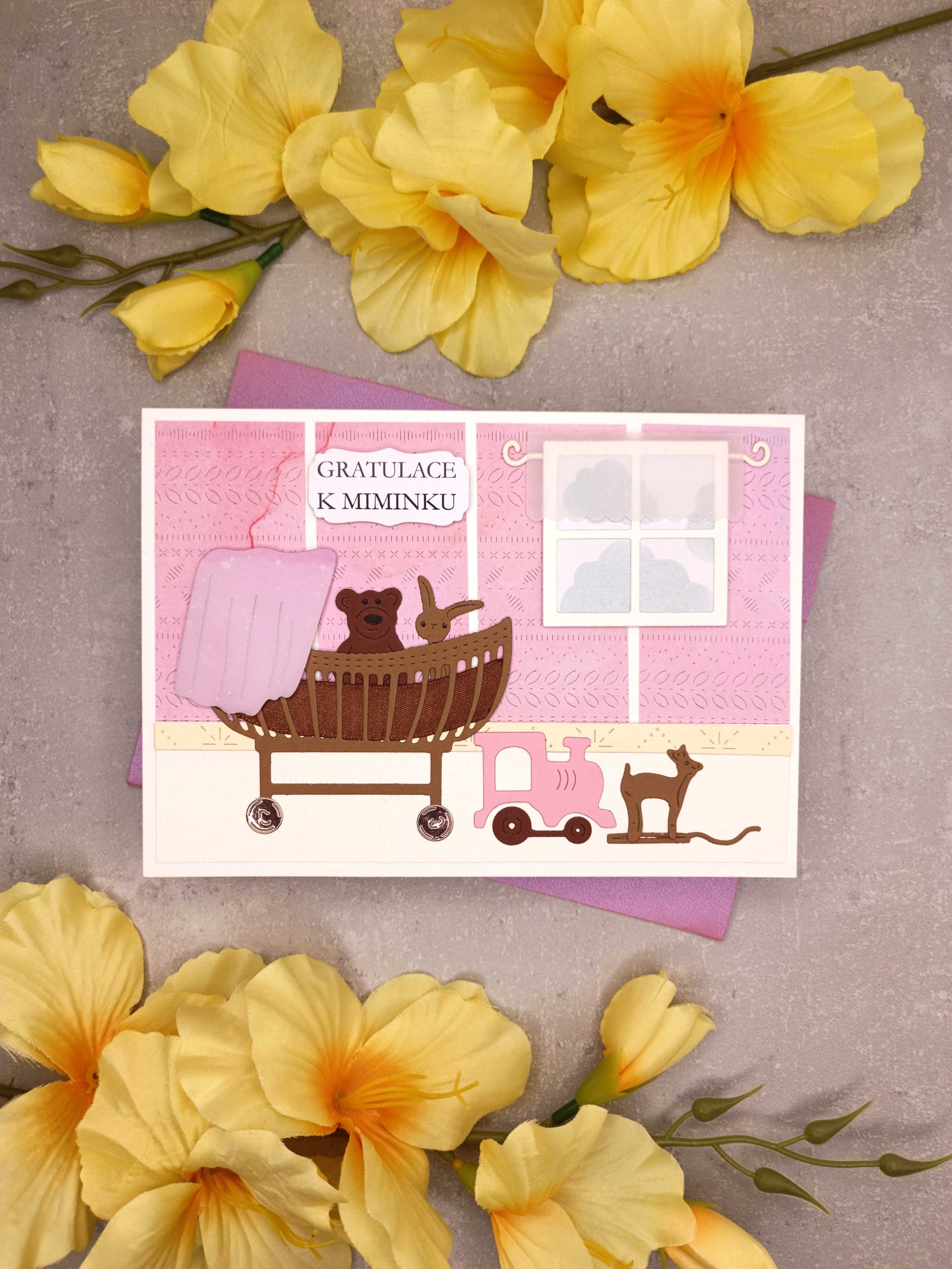 - Přání zobrazuje dětský pokojíček připravený vítat nového člena rodiny. Přáníčko je laděno do růžových barev.