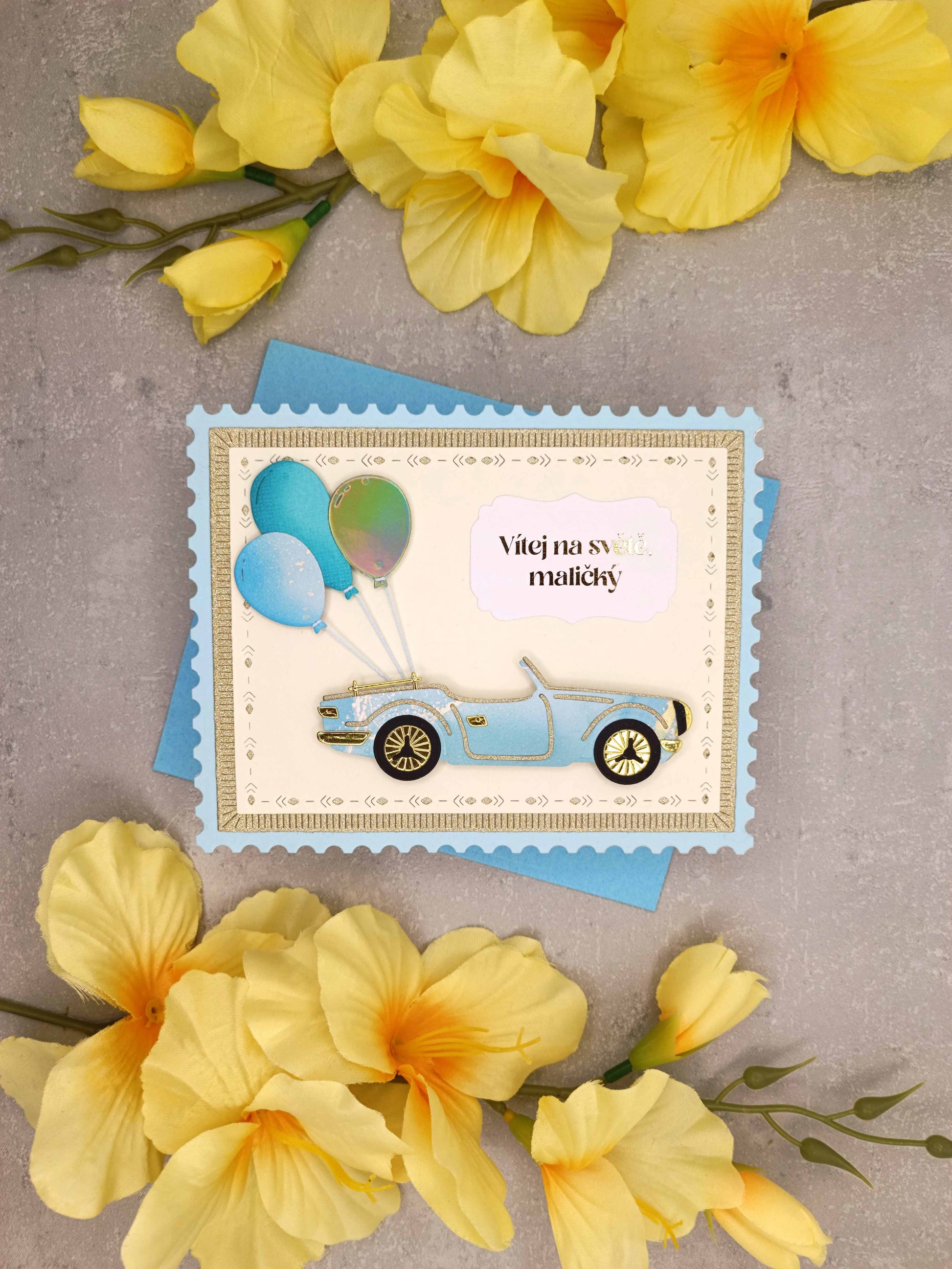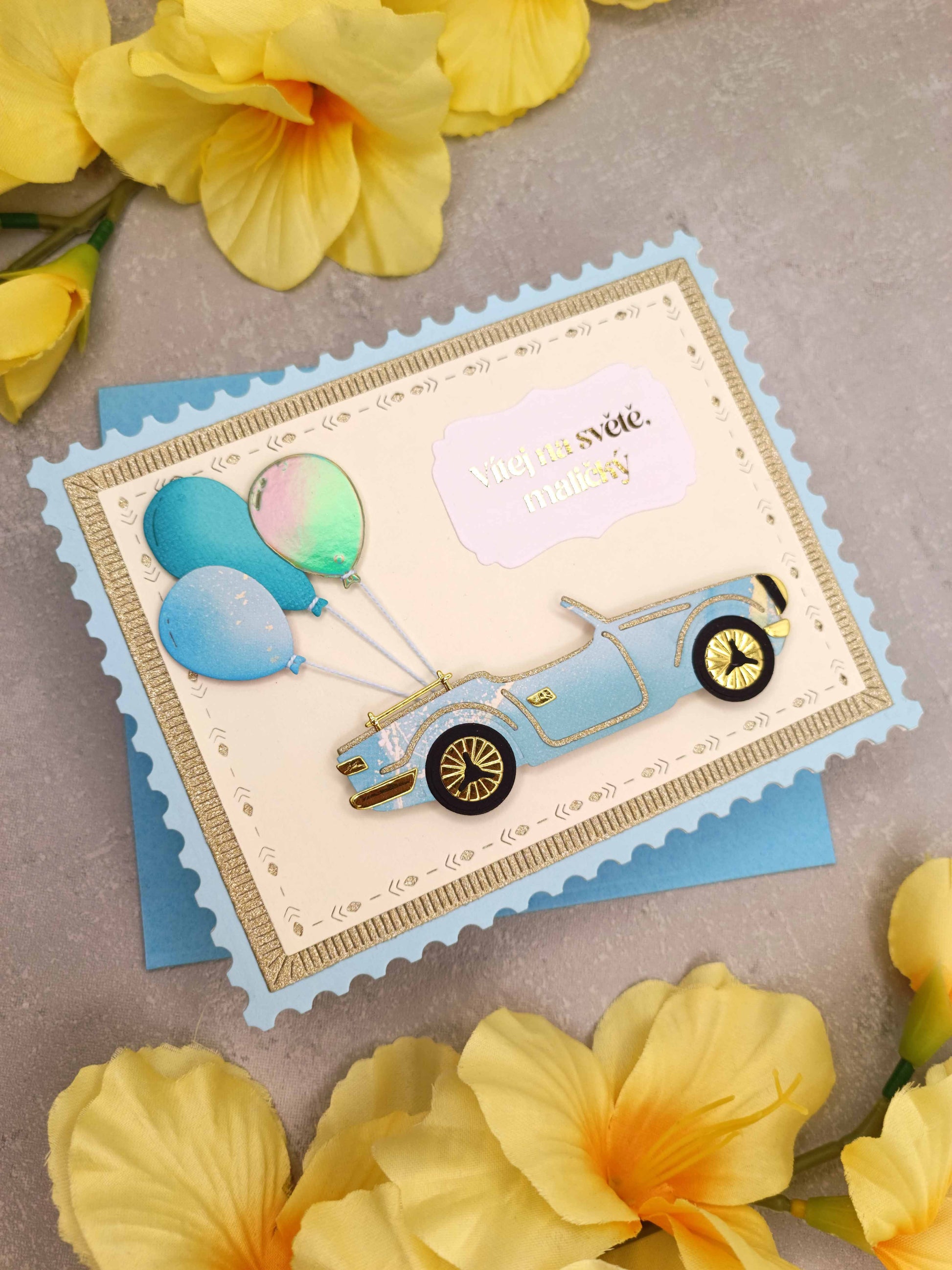 - Přání zobrazuje přijíždějící auto s balónky připravené vítat nového člena rodiny. Přáníčko je laděno v modrých barvách. Nápis na přáníčku je zlatý a jeden z balónků je holografický