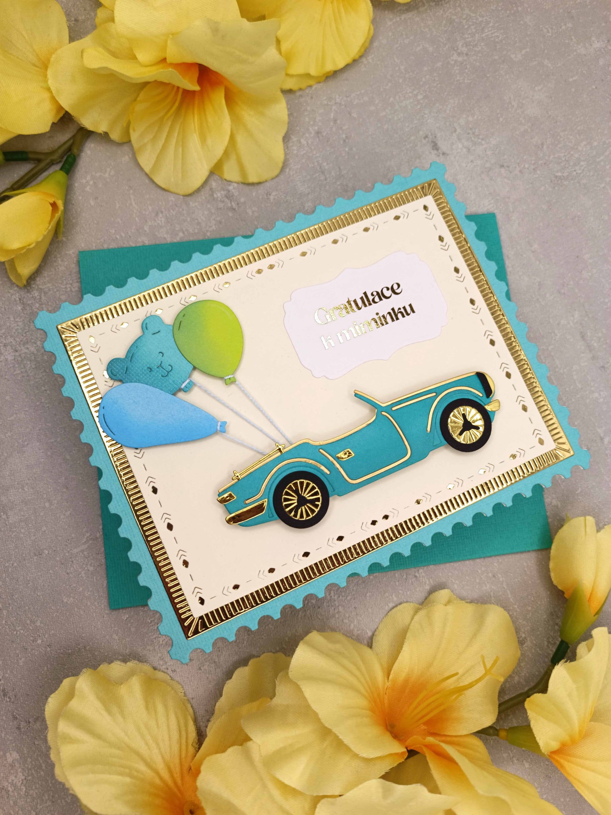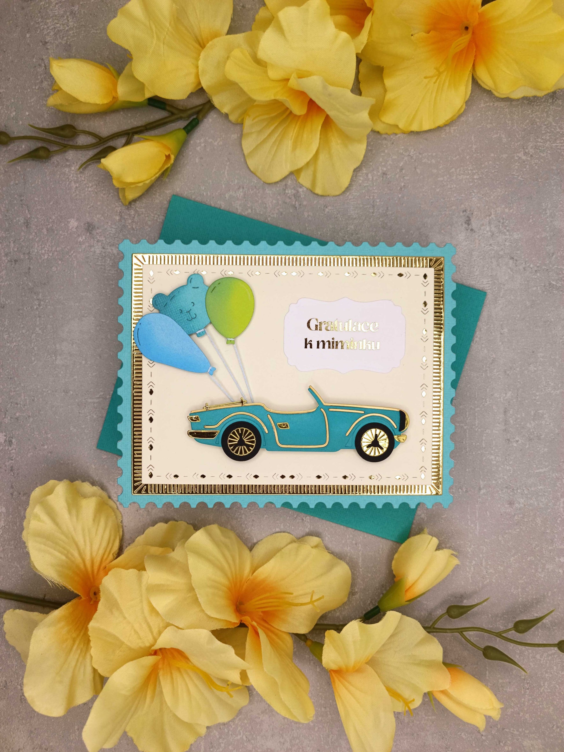 - Přání zobrazuje přijíždějící auto s balónky připravené vítat nového člena rodiny. Přáníčko je laděno v modro-zelených barvách. Nápis na přáníčku je zlatý.