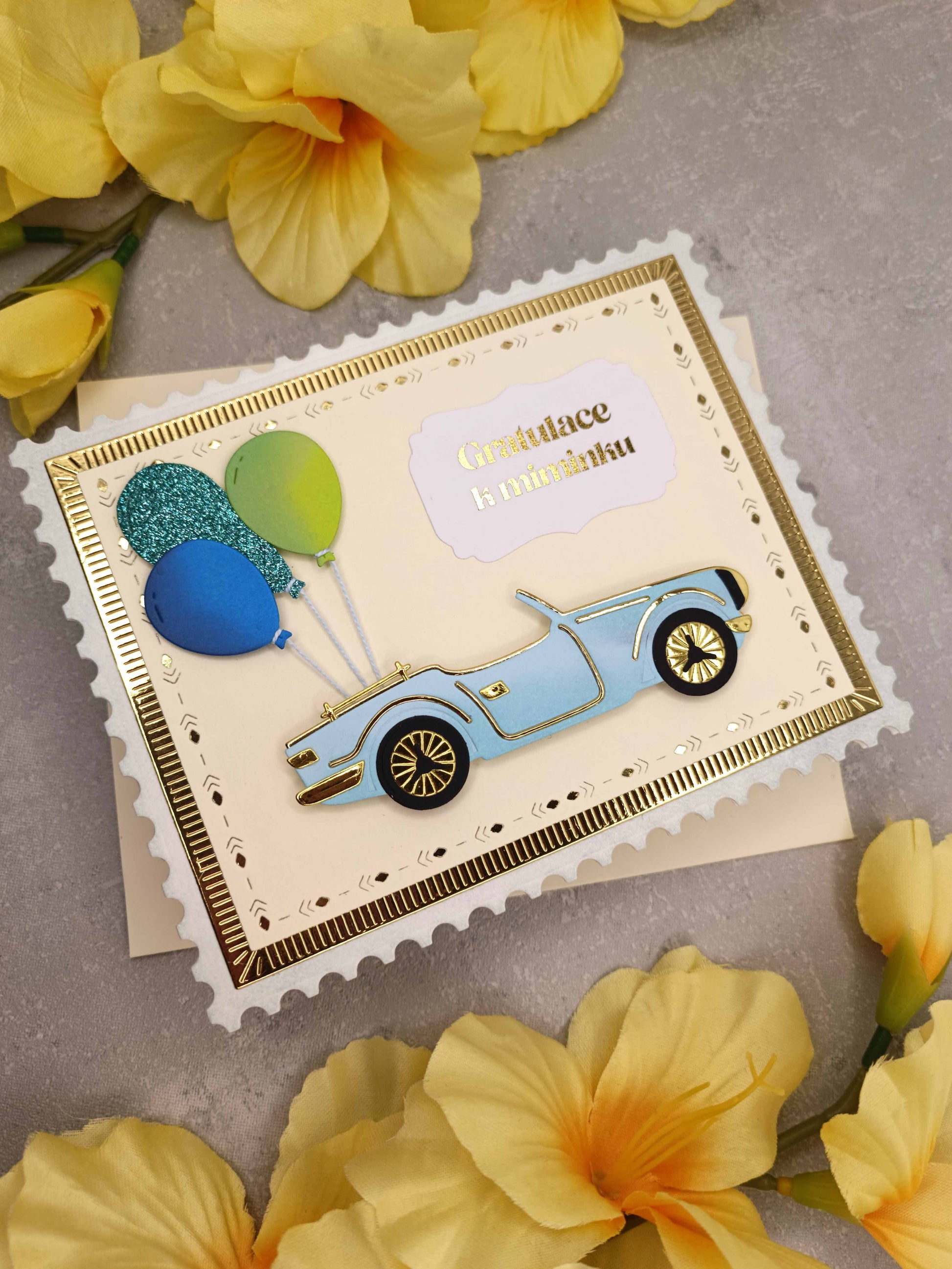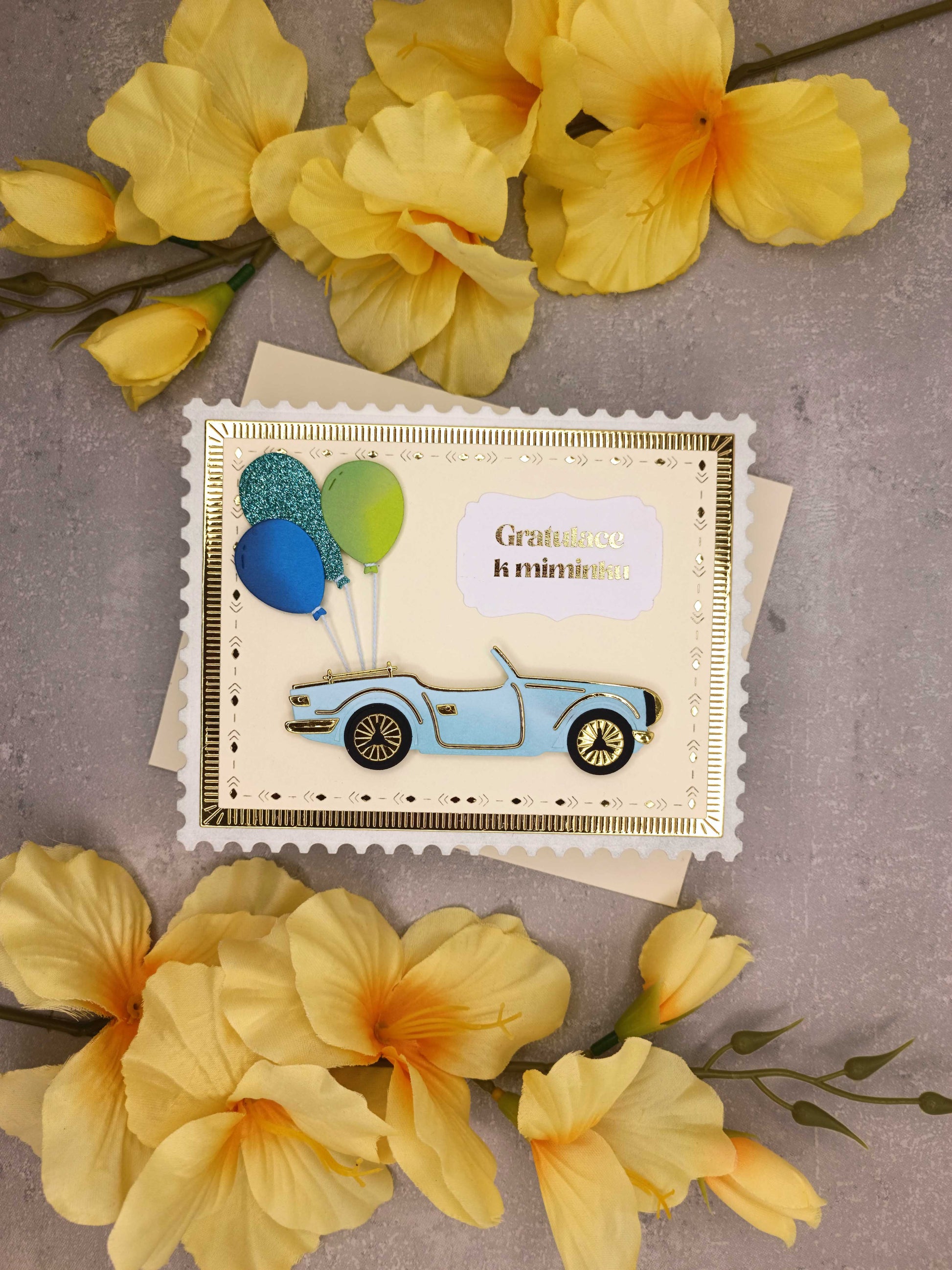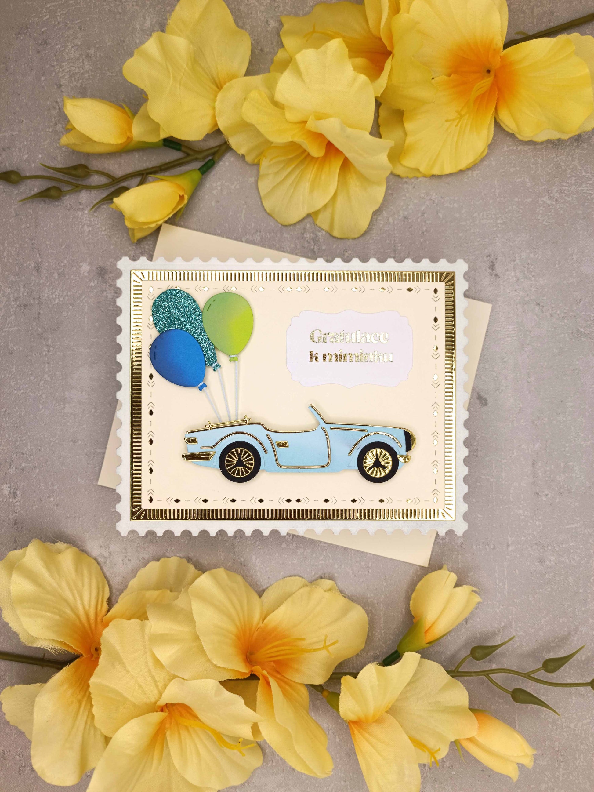 - Přání zobrazuje přijíždějící auto s balónky připravené vítat nového člena rodiny. Přáníčko je laděno do světlých barev. Nápis na přáníčku je zlatý.