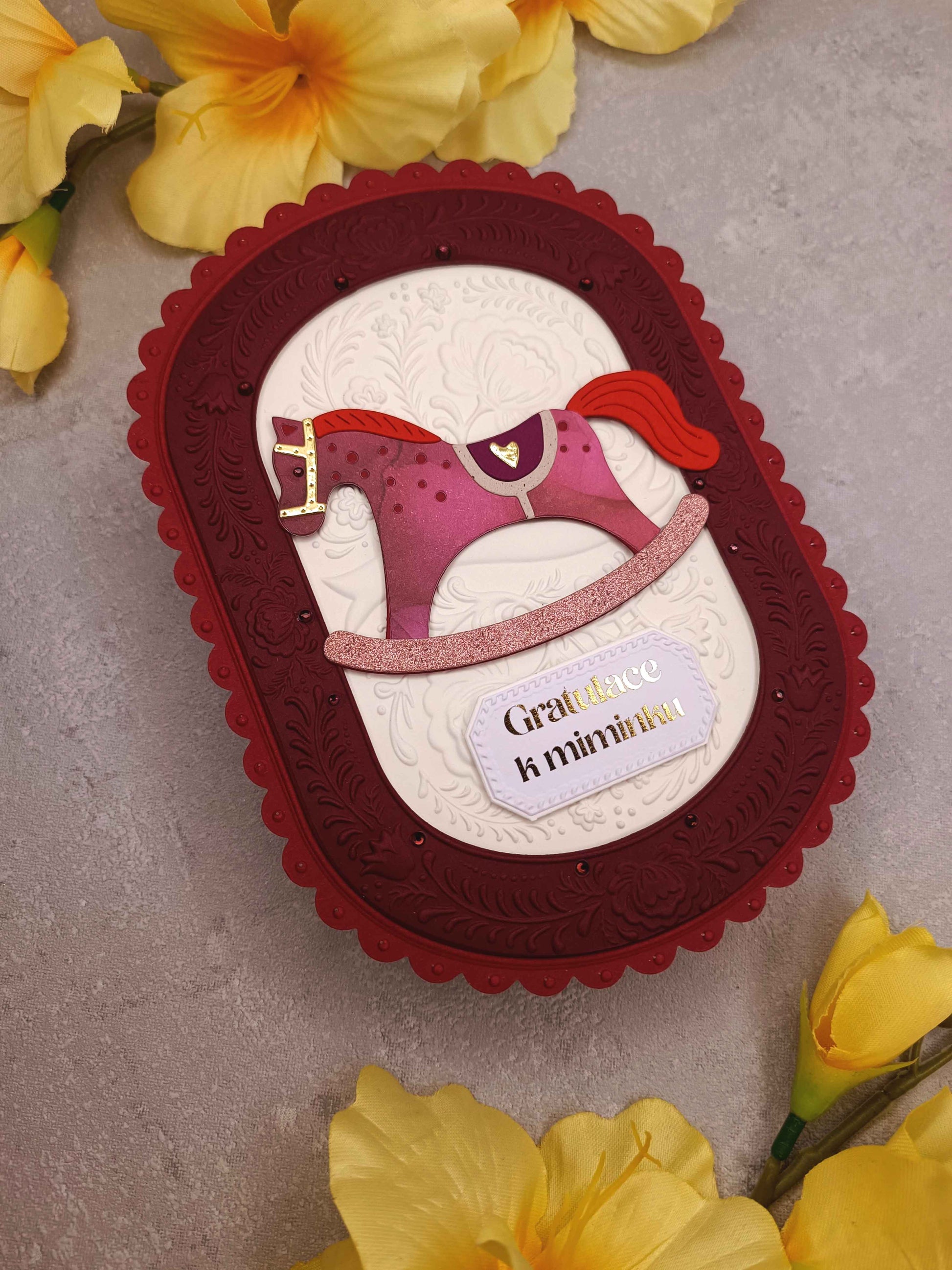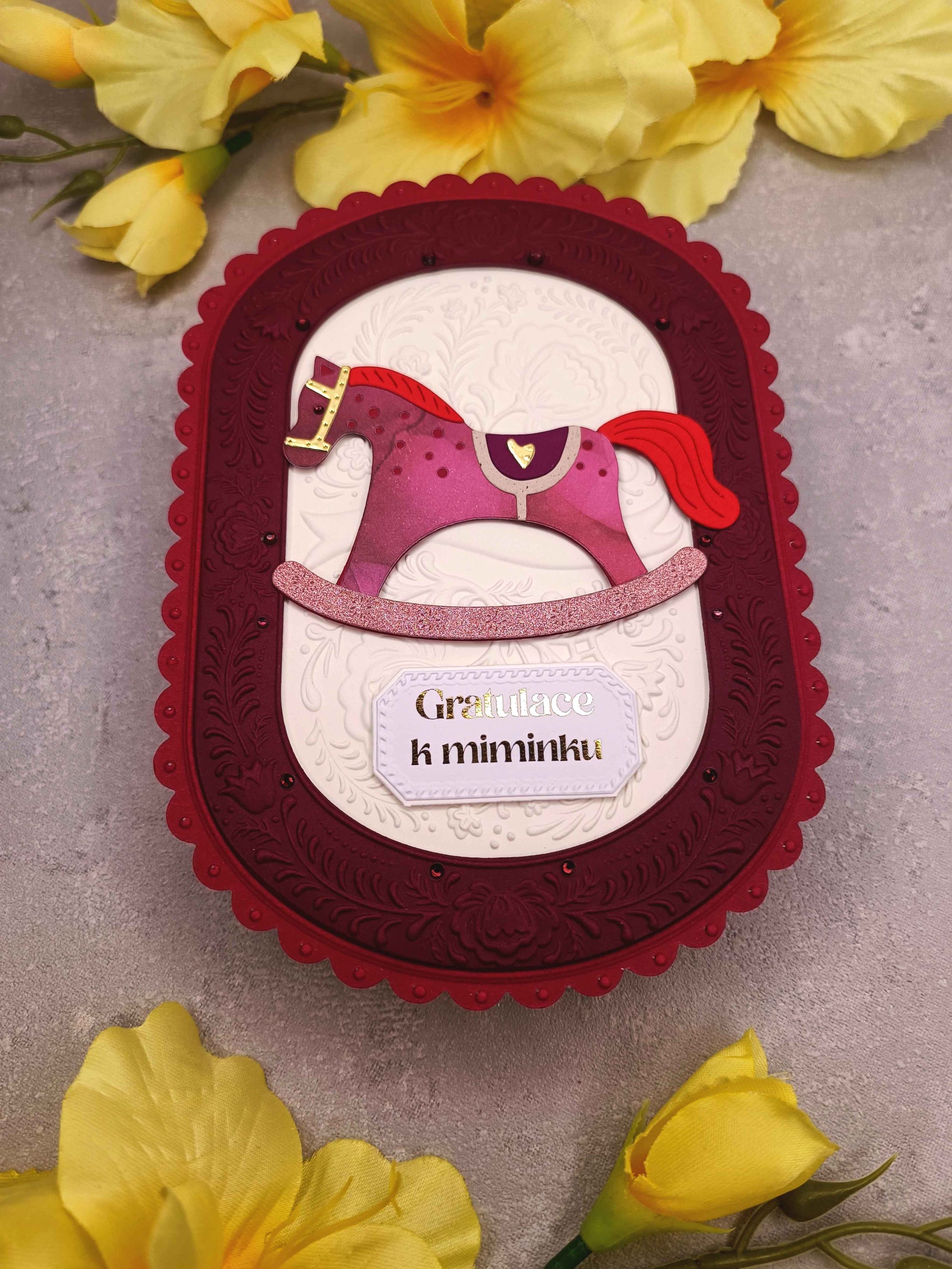 - Ručně vyrobené dětské přání s motivem houpacího koníka