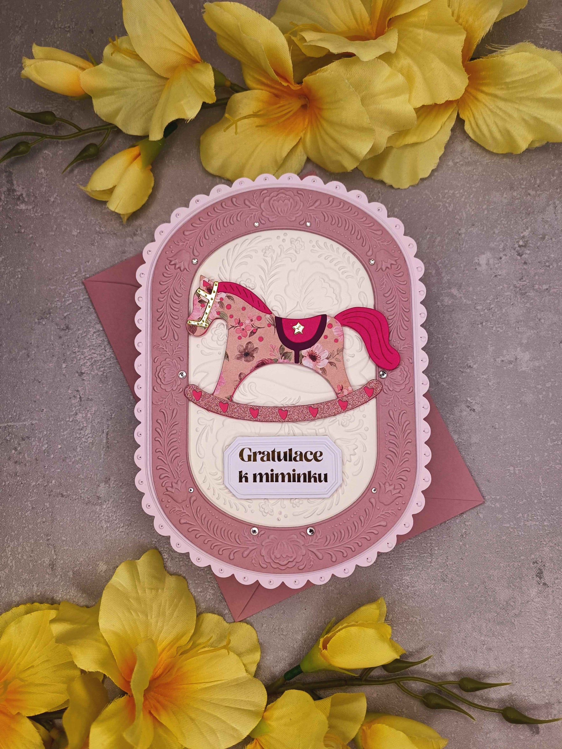 - Ručně vyrobené dětské přání s motivem houpacího koníka