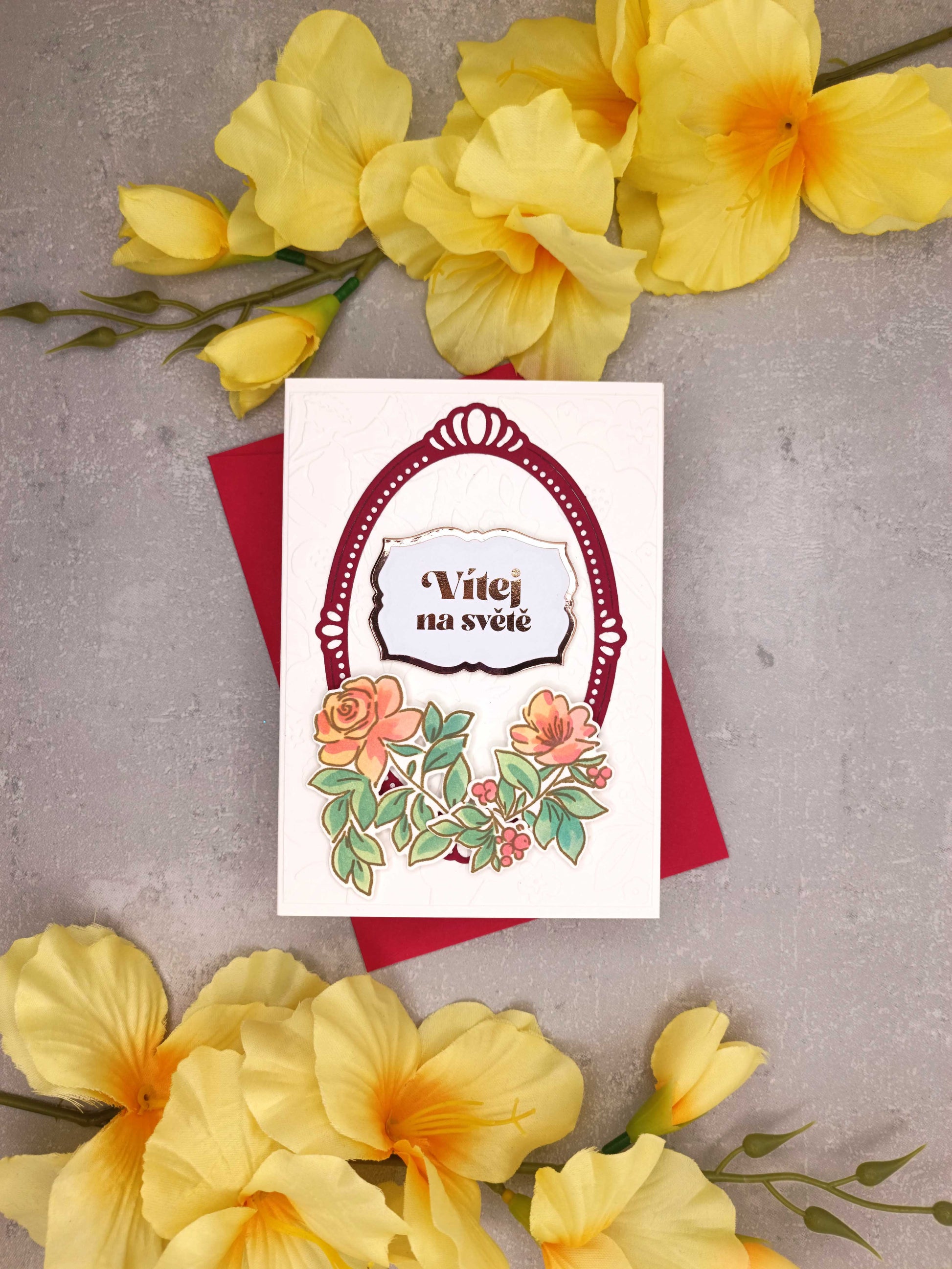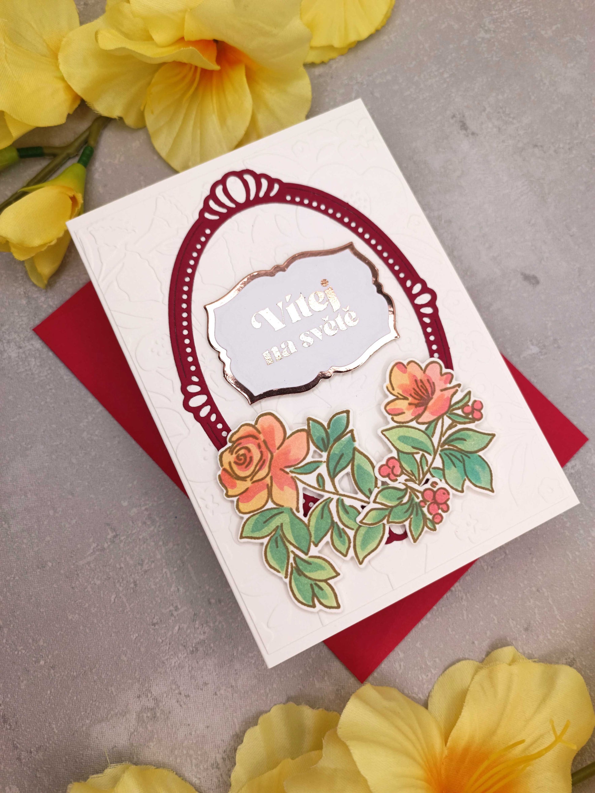 - Přání zdobí vínový rámeček, oranžové květiny a zlatý nápis v odstínu rose gold